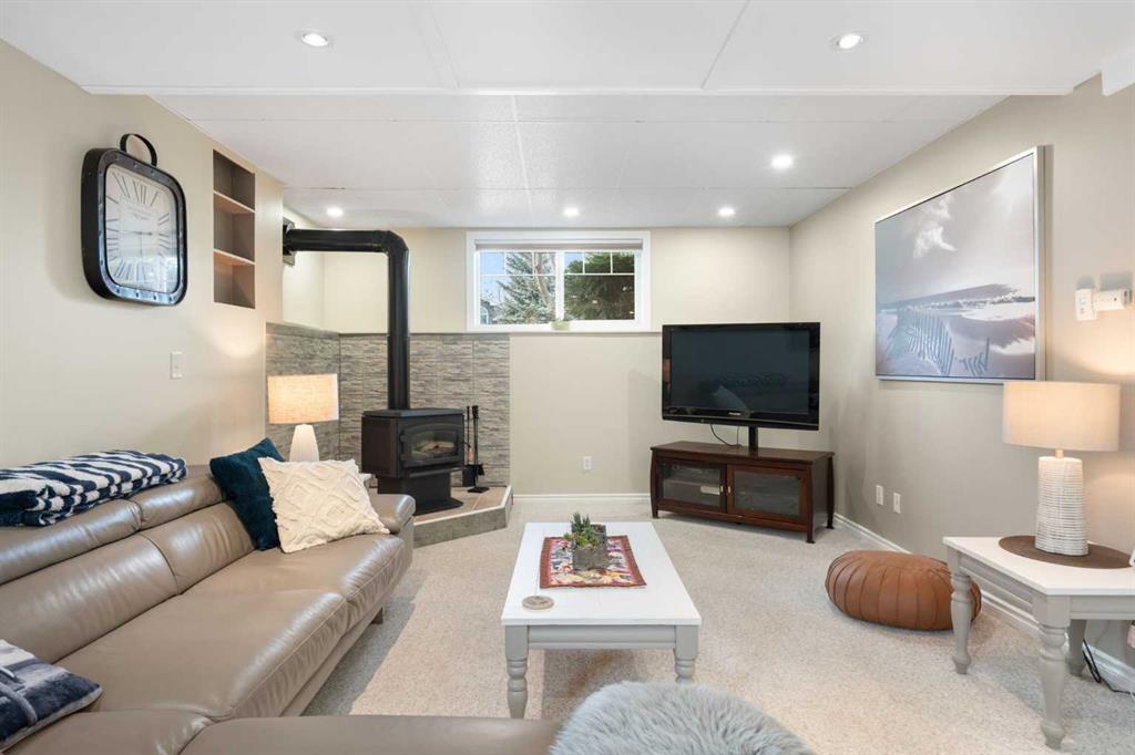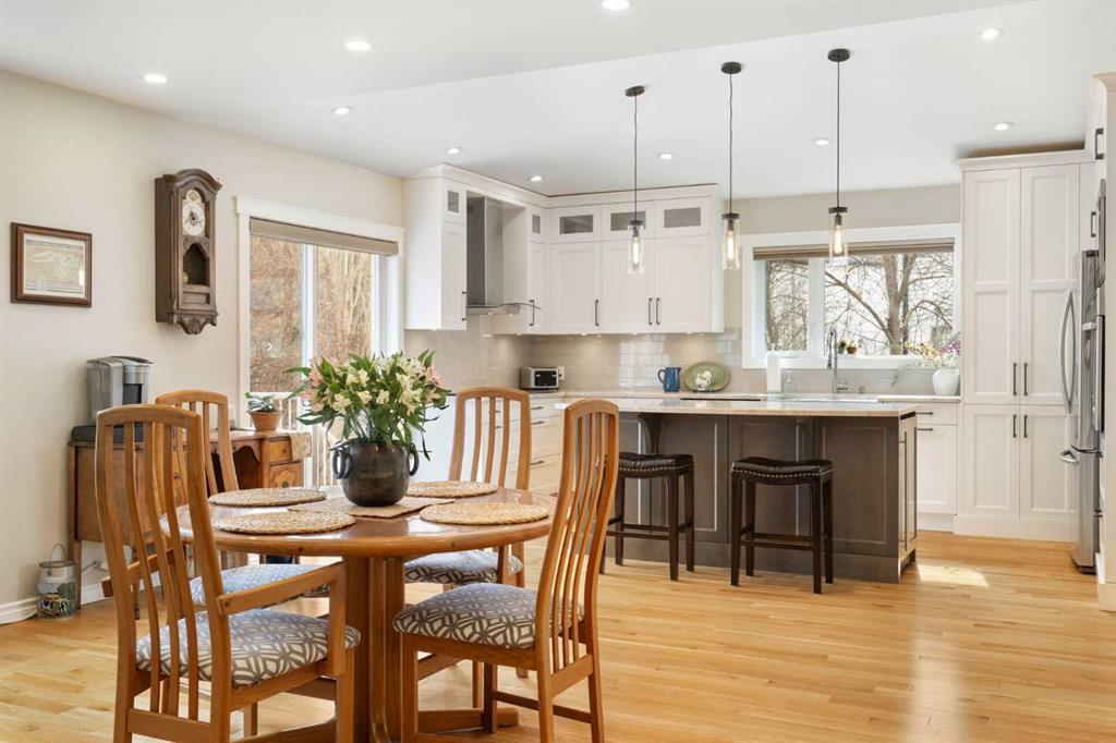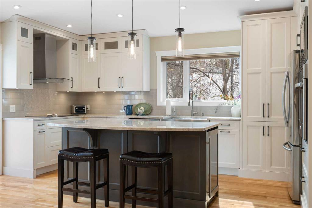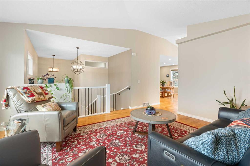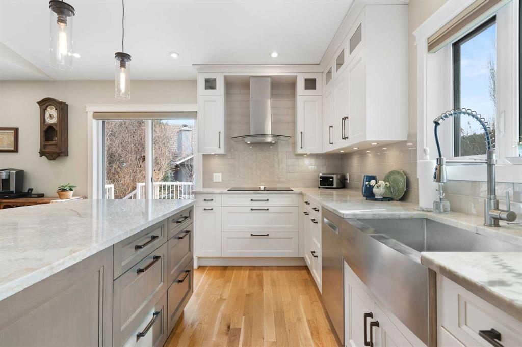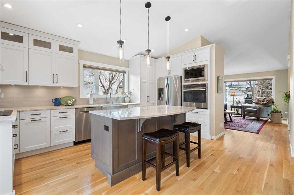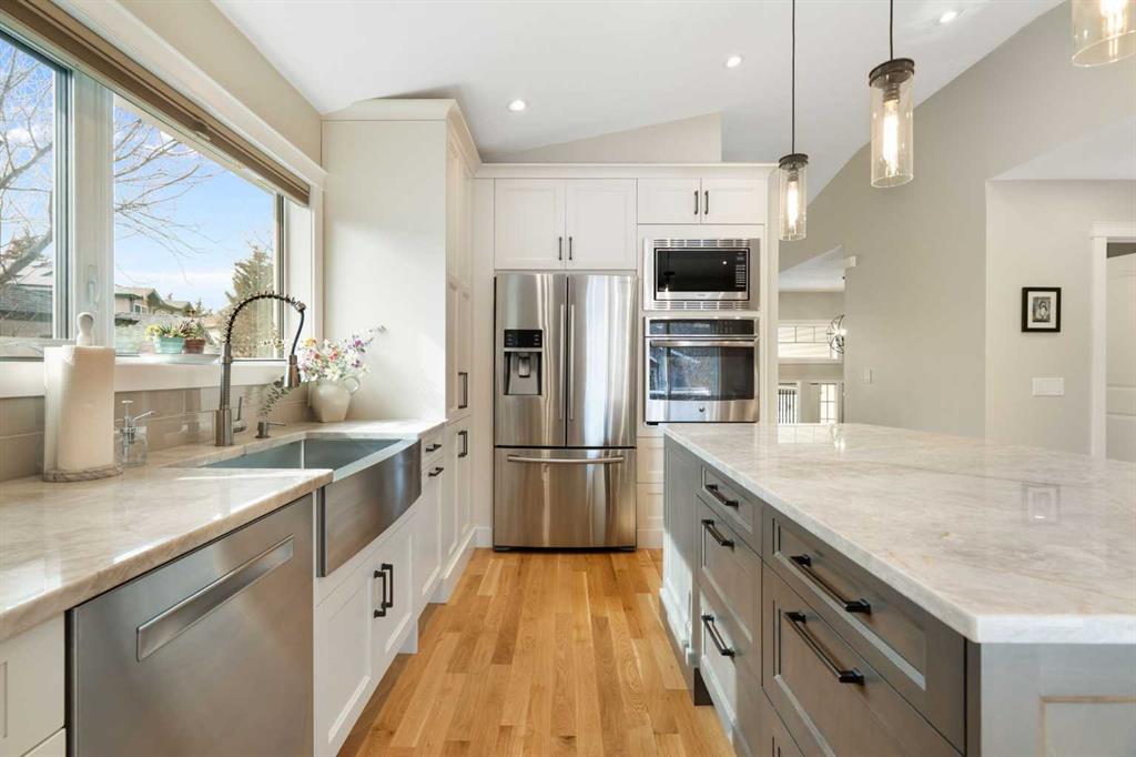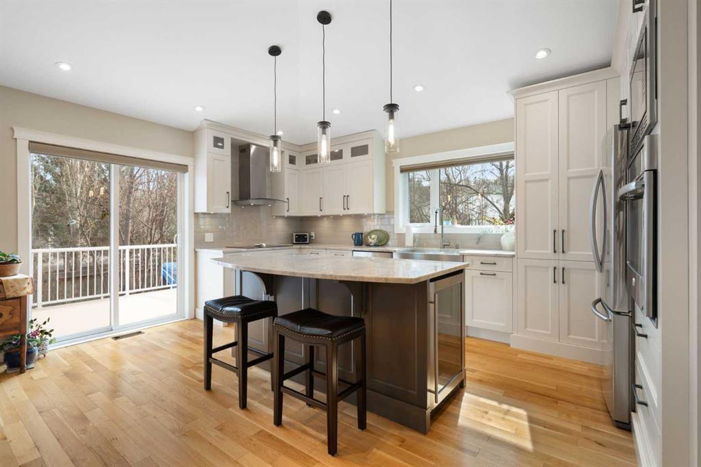 Rare opportunity to own an original-owner, custom-built bi-level by Schickedanz in the prestigious community of Bow Meadows. Tucked away in a quiet cul-de-sac with no through traffic, this meticulously maintained home sits on one of the largest lots in the area (668 SqM). The main floor is a showcase of timeless design, featuring vaulted ceilings and stunning hardwood floors. The gourmet-style kitchen is a masterpiece, boasting quartzite counters, ceiling-height soft-close cabinetry, a farmhouse sink, and a high-end stainless appliance package featuring an induction cooktop and built-in wall oven. A central island with breakfast bar and a built-in beverage cooler make this the ultimate space for entertaining. Retreat to the primary bedroom, complete with a walk-in closet and a 3-piece ensuite with heated floors. The fully developed lower level offers a spacious rec room with a wet bar, a cozy natural gas fireplace, two additional bedrooms, and a 4-piece bath with heated tile floors. Mechanical integrity is a priority here: Poly-B has been replaced with Pex, the hi-efficiency furnace and central A/C are newer (2023), and attic insulation was upgraded to R55. Outside, the massive south-facing backyard is a private oasis with a large deck, private patio and mature trees. Enjoy direct access to walking paths leading to the Bow River, with schools and shopping just minutes away. Complete with an insulated, drywalled, and heated double garage—this home is truly turn-key.