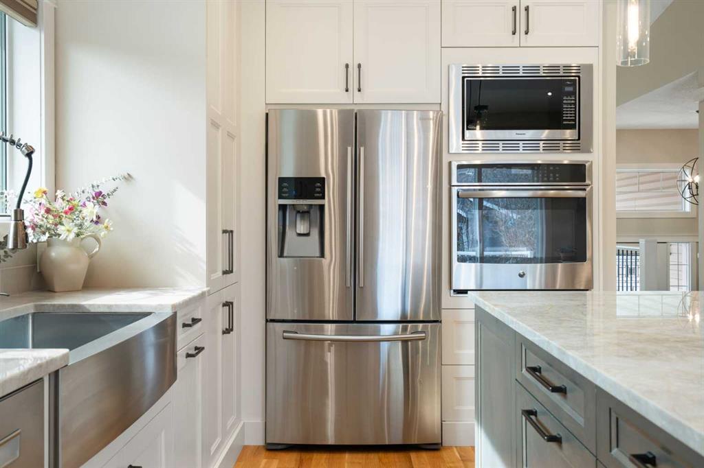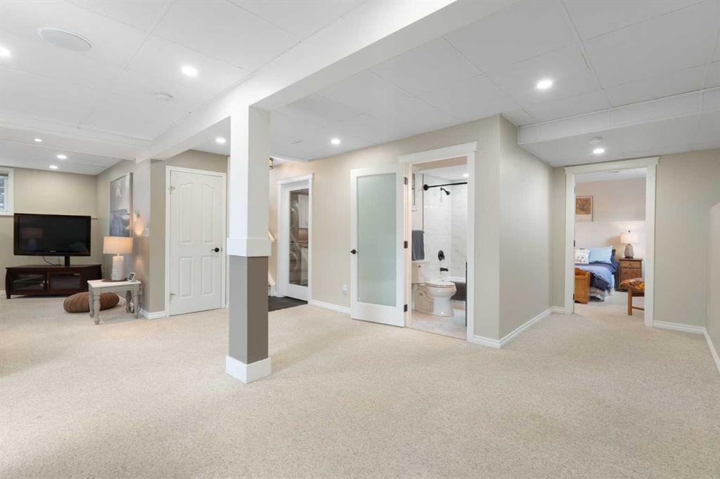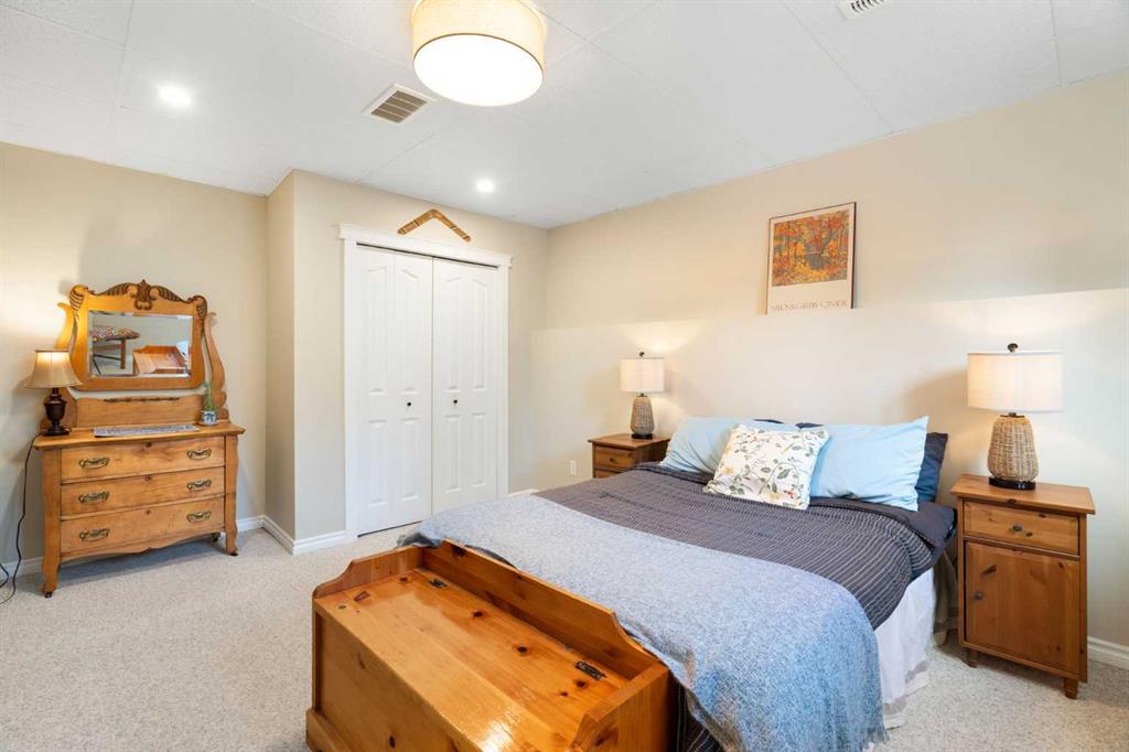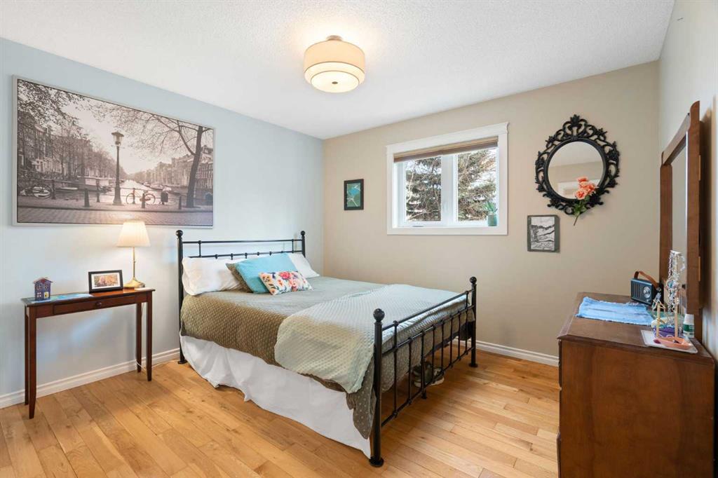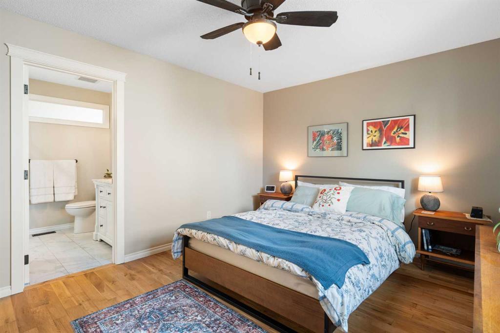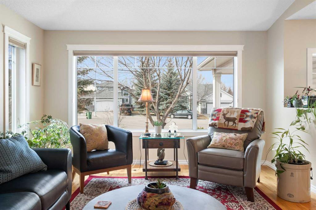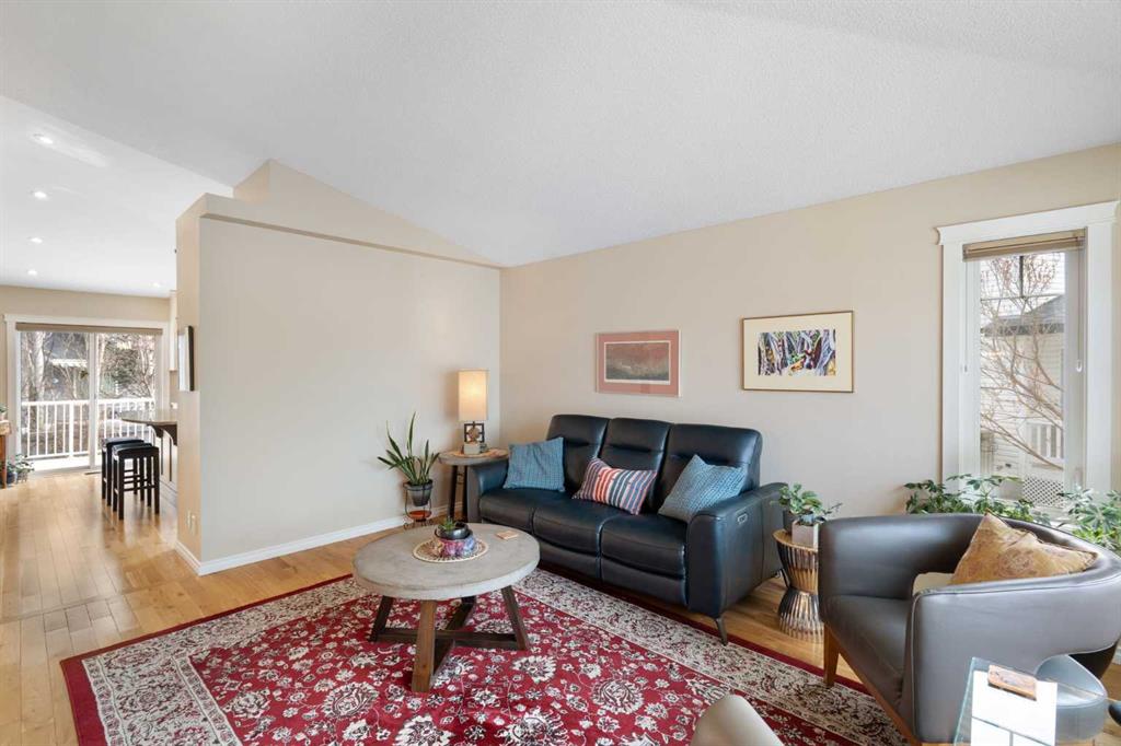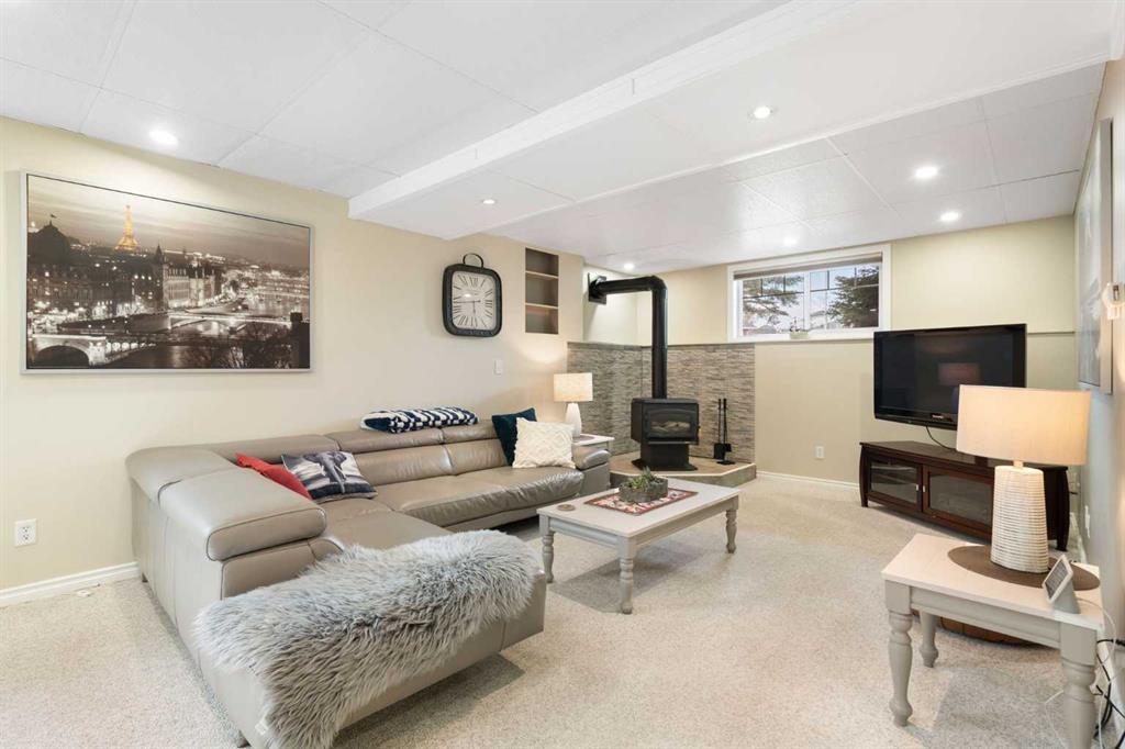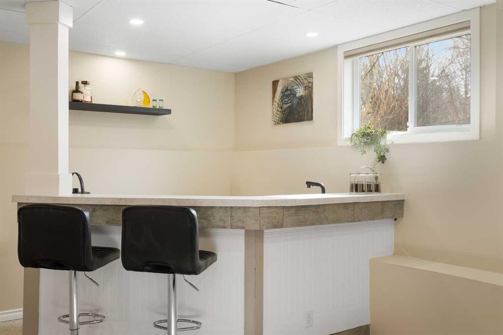 Rare opportunity to own an original-owner, custom-built bi-level by Schickedanz in the prestigious community of Bow Meadows. Tucked away in a quiet cul-de-sac with no through traffic, this meticulously maintained home sits on one of the largest lots in the area (668 SqM). The main floor is a showcase of timeless design, featuring vaulted ceilings and stunning hardwood floors. The gourmet-style kitchen is a masterpiece, boasting quartzite counters, ceiling-height soft-close cabinetry, a farmhouse sink, and a high-end stainless appliance package featuring an induction cooktop and built-in wall oven. A central island with breakfast bar and a built-in beverage cooler make this the ultimate space for entertaining. Retreat to the primary bedroom, complete with a walk-in closet and a 3-piece ensuite with heated floors. The fully developed lower level offers a spacious rec room with a wet bar, a cozy natural gas fireplace, two additional bedrooms, and a 4-piece bath with heated tile floors. Mechanical integrity is a priority here: Poly-B has been replaced with Pex, the hi-efficiency furnace and central A/C are newer (2023), and attic insulation was upgraded to R55. Outside, the massive south-facing backyard is a private oasis with a large deck, private patio and mature trees. Enjoy direct access to walking paths leading to the Bow River, with schools and shopping just minutes away. Complete with an insulated, drywalled, and heated double garage—this home is truly turn-key.