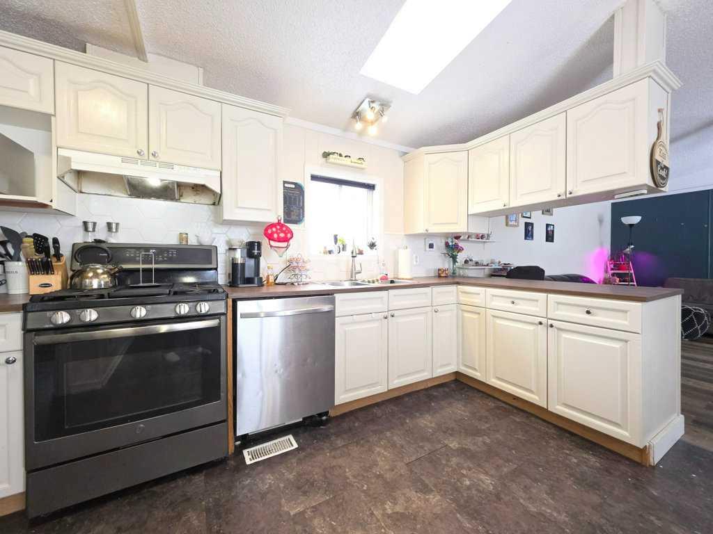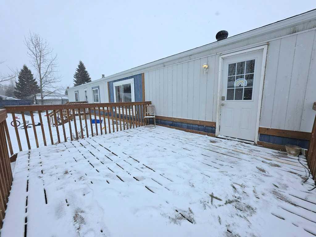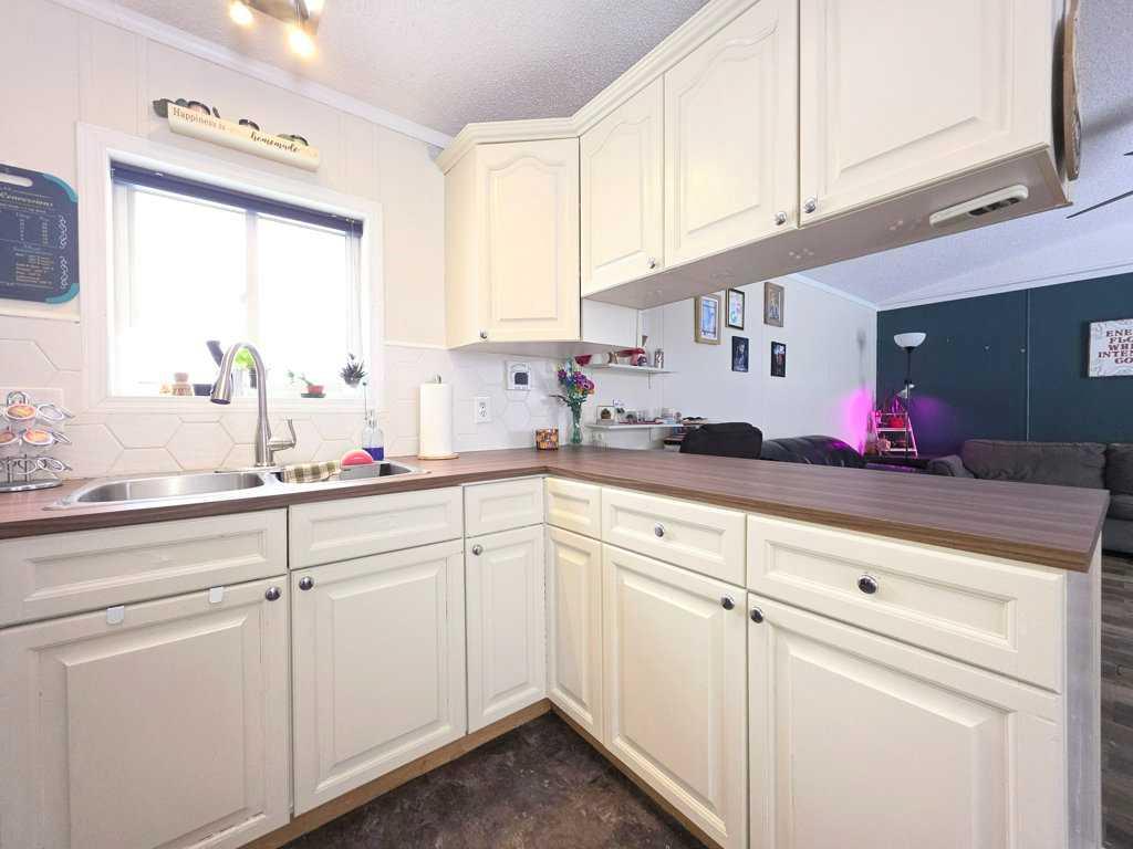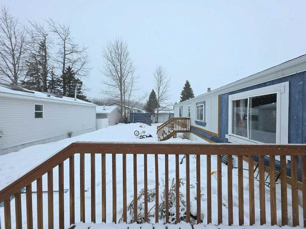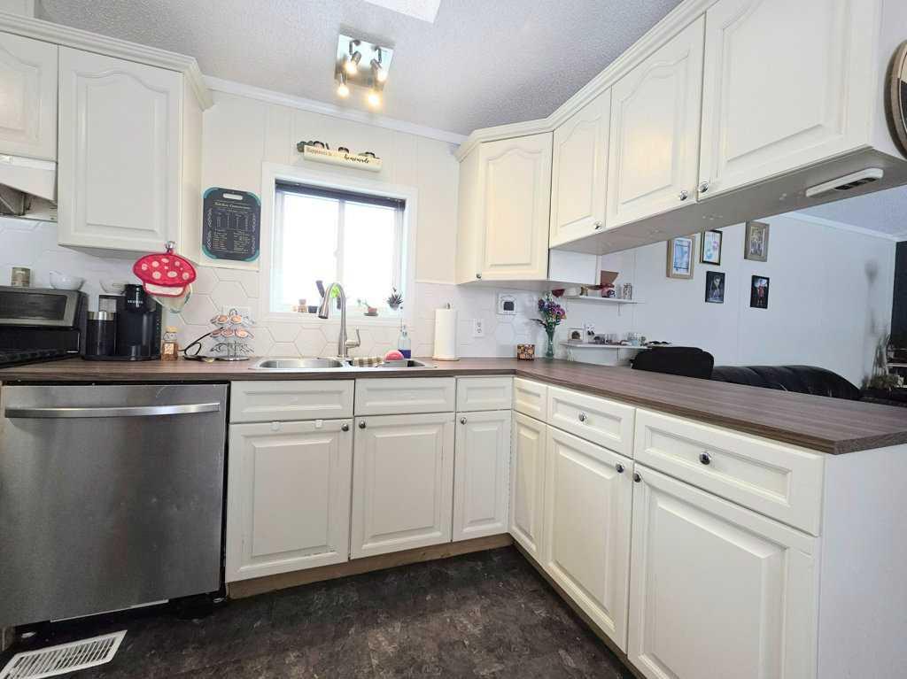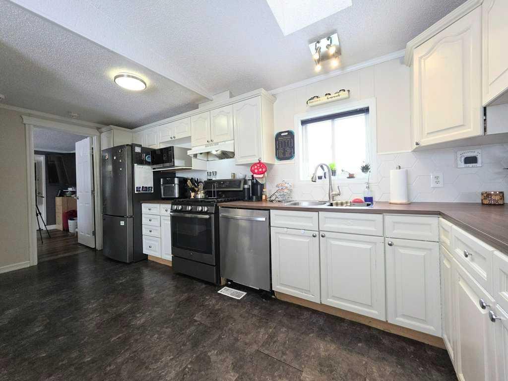 Well-maintained mobile home situated on its own lot, offering excellent value for first-time buyers, downsizers, or investors. This fee-simple property is fully fenced and features a large treated deck—perfect for outdoor living. Inside, the functional open-concept layout includes 3 bedrooms and 2 full 4-piece bathrooms, with a bright living room that flows into an upgraded kitchen and dining area. The kitchen has been refreshed with new countertops, a new backsplash, a newly installed dishwasher, and newer stainless steel appliances, offering plenty of cabinets and generous counter space The primary bedroom is spacious and features a walk-in closet and a large 4-piece ensuite complete with a deep soaker tub. Additional highlights include a dedicated laundry room, freshly painted with sealed trim, and a new washer and dryer (2024), a new toilet and vanity in the main bathroom, and plumbing upgrades scheduled for completion this month. Outside, you’ll appreciate the fully fenced yard, big deck, and a 3-car-wide parking pad. Located close to schools, the MRC, and parks, this home delivers affordability, comfort, and convenience—with no lot fees.