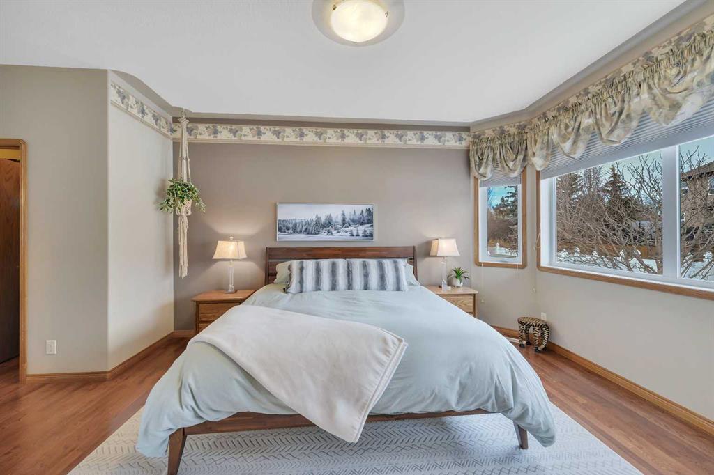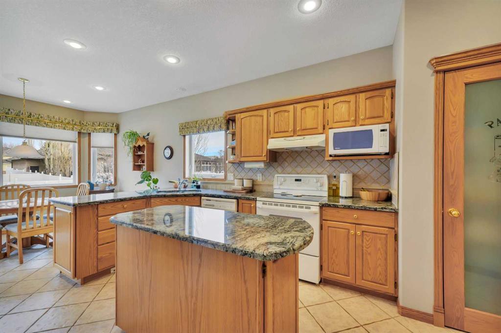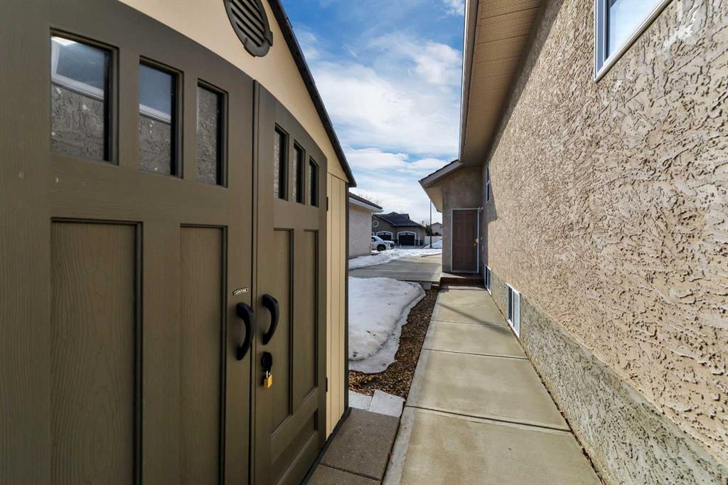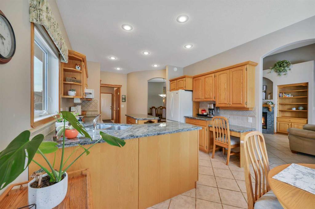 Welcome to this beautifully maintained, fully finished custom built bungalow in the highly sought-after Anders Park East neighbourhood. The stunning great room features 12-foot ceilings, a cozy gas fireplace, and custom built-in bookcases. The open-concept layout seamlessly connects the great room to the dining area, creating the perfect space for both everyday living and entertaining. The kitchen is well-appointed with granite countertops, a central island, coffee bar, built-in desk, and a bright breakfast nook leading to a covered deck—complete with roll-down shades for added privacy and comfort and a gas bbq hook-up. The main floor offers a spacious primary bedroom with hardwood flooring, a large 4-piece ensuite with a jet soaker tub, walk-in shower, and his-and-hers closets. A second bedroom—currently used as an office—features hardwood floors as well and charming bay windows. Convenient main floor laundry/mudroom is located just off the heated double attached garage. Downstairs, the fully finished basement with in-floor heating provides even more living space, including two additional bedrooms, a 4-piece bathroom, a cozy family room with gas fireplace, built-in bar, hobby/craft room, and a unique wine cellar. Outside, enjoy a fully fenced and landscaped yard complete with underground sprinklers, a concrete patio, shed, and RV parking.