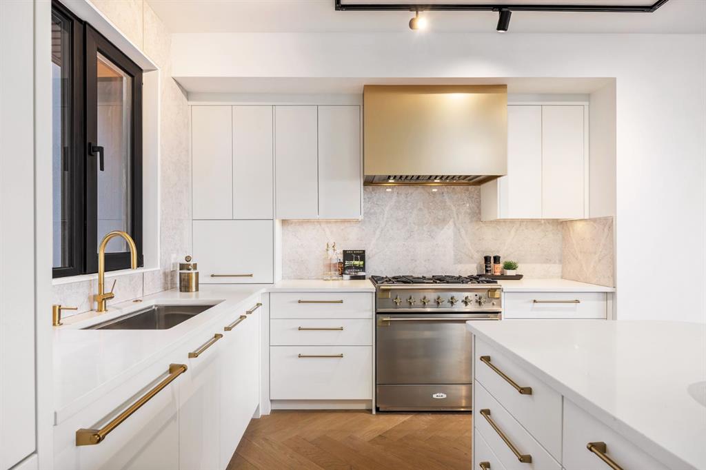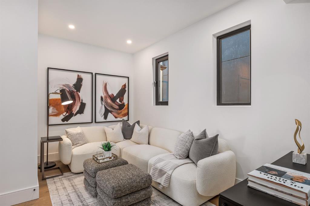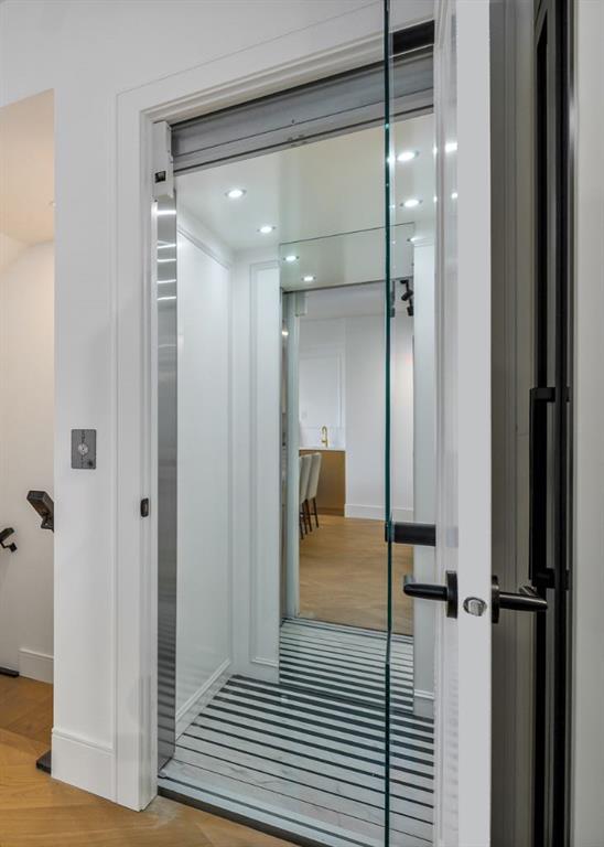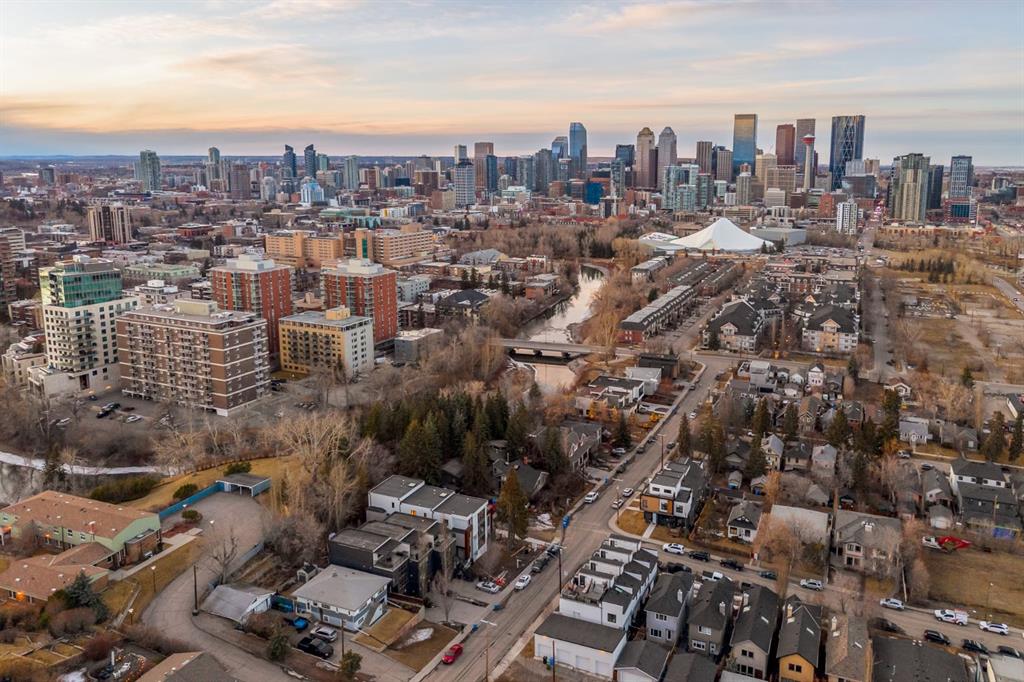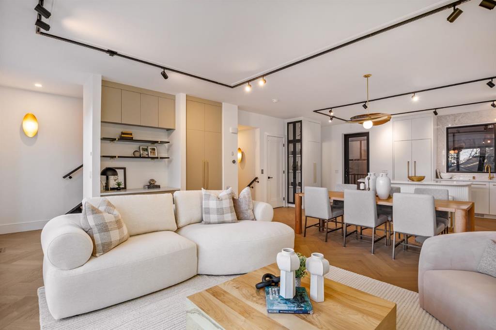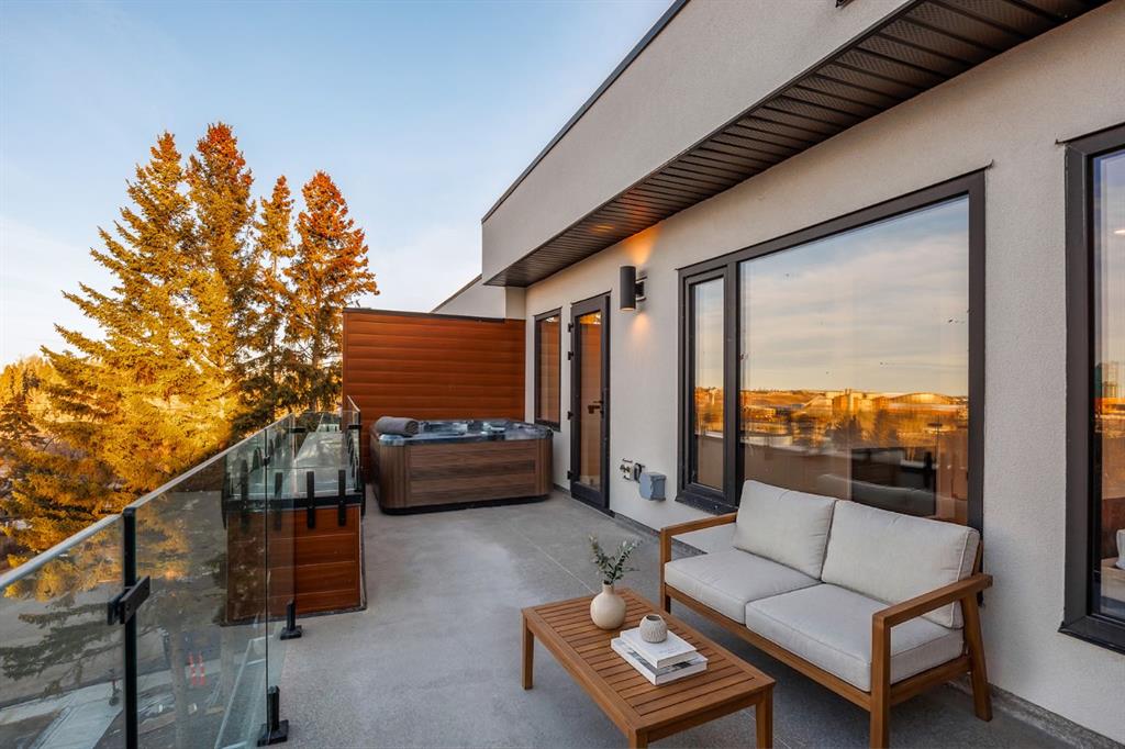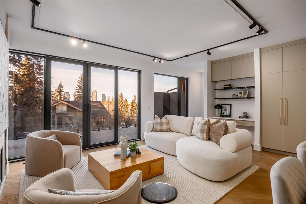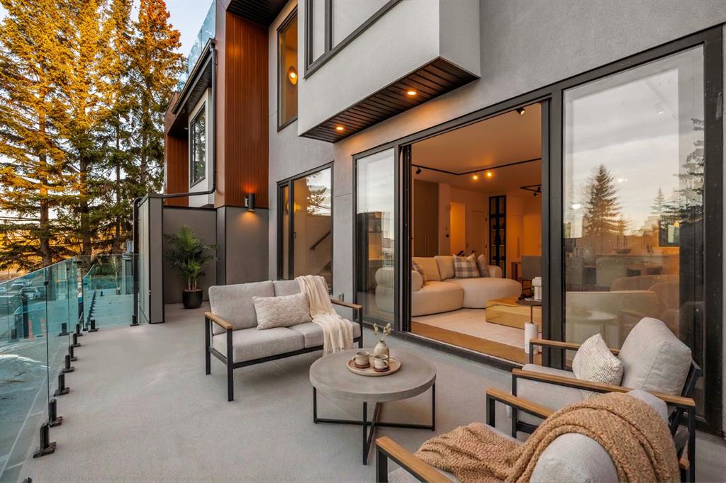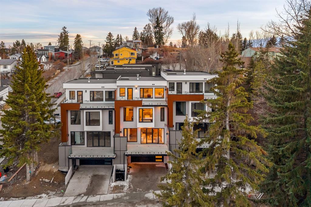Open House Saturday April 4th 10AM-12PM. This three storey townhome incorporates modern-traditional interior design elements for a sophisticated and timeless aesthetic. Perched upon a hill in one of Calgary's most iconic river communities overlooking the picturesque skyline, this brand new unit is a culmination of high quality materials, thoughtful finishing selections, and grand inclusions. The attached triple car garage and private elevator are characteristic of the many luxurious additions strategically embedded within this home. The main floor layout includes a chef's kitchen with premium panel-ready appliances, dining room, living area with gas fireplace, powder room, wet bar, built-in desk area, main floor balcony with sweeping city views, and an outdoor BBQ deck at the rear. On the second level there are two bedrooms, each with walk-in closets and full ensuites, along with a large built-in laundry area with sink and shelving, and a versatile den. The third floor is occupied almost entirely by a spacious primary retreat with another gas fireplace, walk-in-closet, an attached 6 piece ensuite including a steam shower, air jetted tub, bidet, make-up vanity and in-floor heating, along with an additional wet bar, and a third level balcony (designed and loaded for a hot-tub) overlooking the city and nearby Elbow River. This intentional floorplan prioritizes comfort and convenience while maximizing utilization of space. Intricate millwork, ornate wall and ceiling mouldings, a curved, ribbed kitchen island, brush gold accents, 9 foot ceilings, and herringbone hardwood all work together seamlessly to emulate carefully curated beauty. With unrivalled cityscape views, this home is a testament to deluxe inner city living. Notable specifications include: quartz countertops, Spanish porcelain tile, engineered European Oak hardwood, custom designed casing/mouldings, designer light fixtures, LED backlit built-in bookcase, millwork built-ins, satin brass and matte black hardware, European style tilt and turn windows with ticker individual panes of glass, along with rough-in for a security system. The expansive epoxy finished garage also includes EV rough-in, a built-in closet space to be used as a mudroom, and the flexibility to convert a large portion at the rear into a home gym or workshop area in lieu of a third vehicle. This home is situated amongst the natural landscape of the river pathways and surrounded by some of the city's most notable landmarks in the peaceful community of Erlton. Quickly access the shopping and dining opportunities along 4th street, the brand new Convention Centre, Calgary Stampede Grounds, and get to the downtown core in minutes.