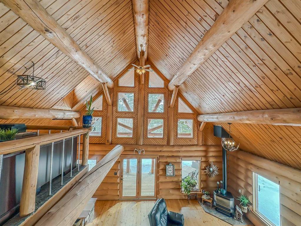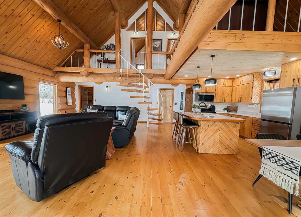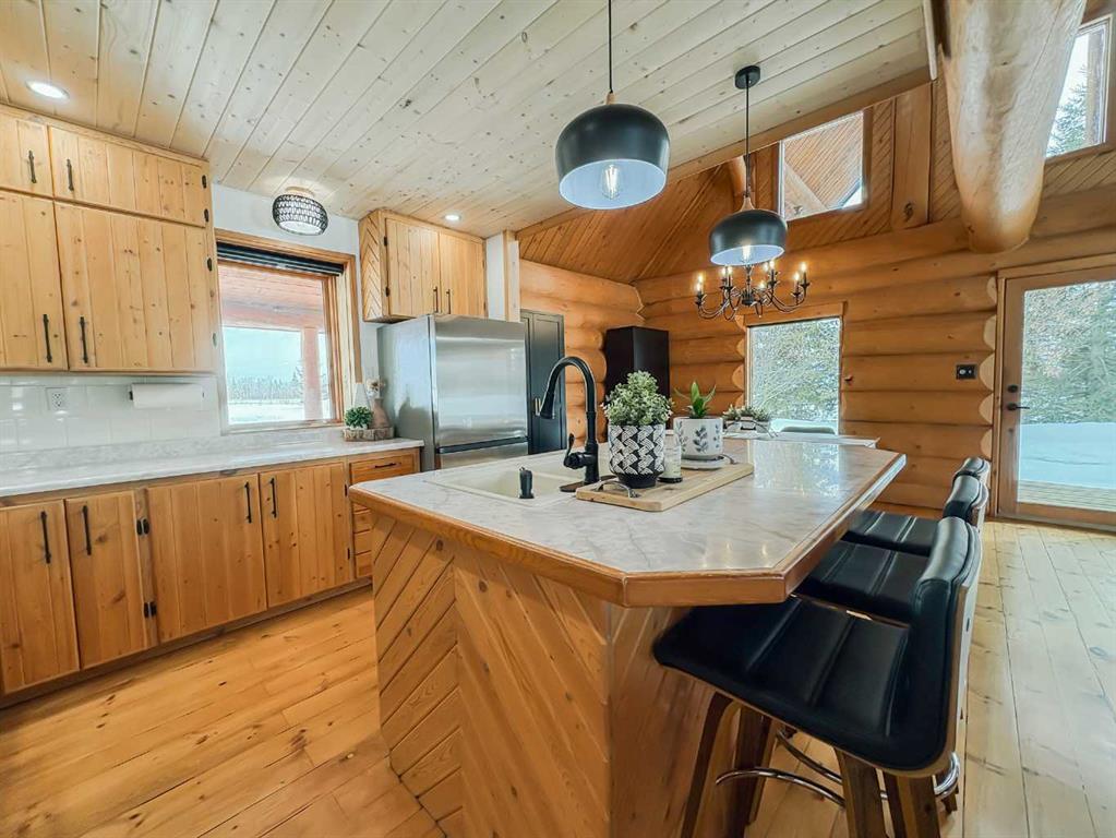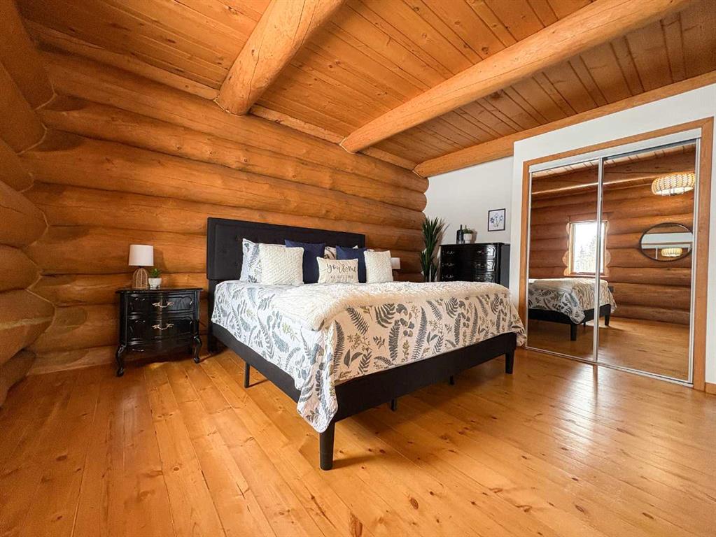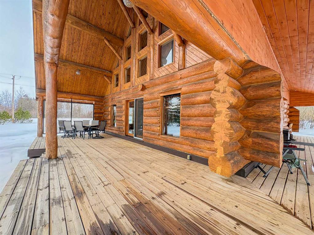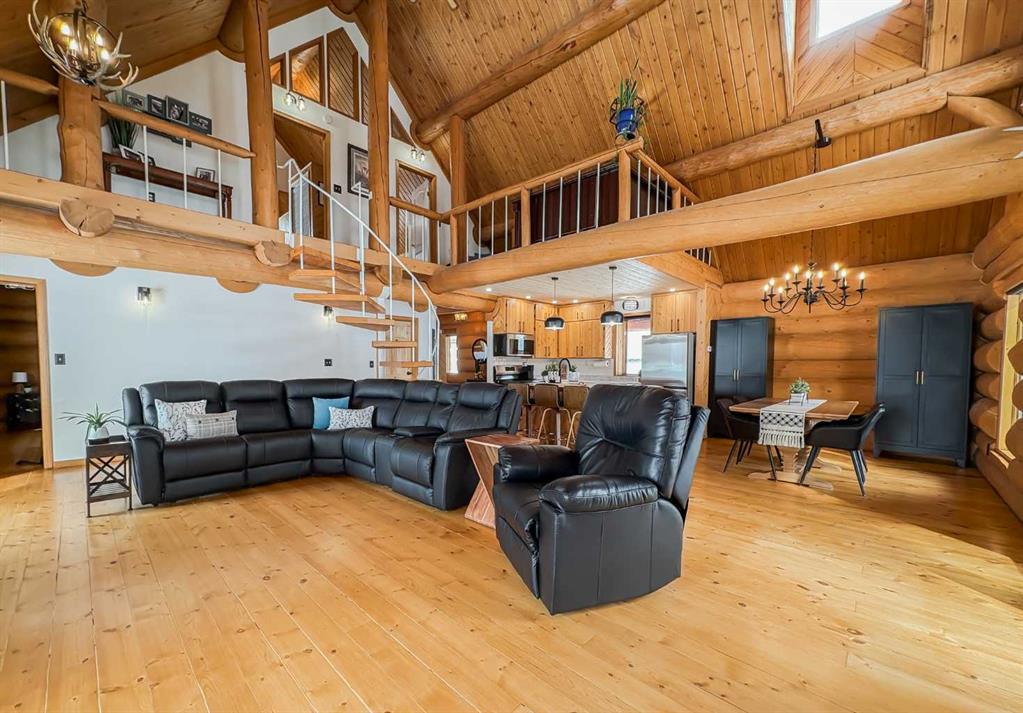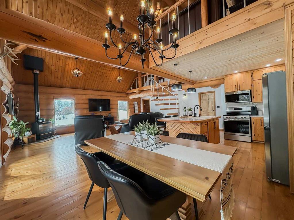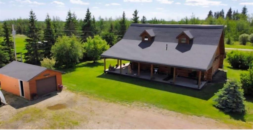 Set on 17.27 acres just over 100 km from Grande Prairie, this one-of-a-kind log home offers the perfect balance of peaceful country living and practical functionality, ideal for those looking to live, work, and unwind all in one place. Step inside and you’re immediately welcomed by soaring vaulted ceilings, exposed log beams, and a stunning open-to-below design that fills the home with natural light. The main living space is warm yet airy, anchored by large windows that frame the surrounding landscape. The kitchen is both functional and inviting, featuring ample cabinetry, a central island with seating, and a seamless flow into the dining area. The home offers 2 bedrooms and 2 bathrooms, along with the convenience of main floor laundry. The primary suite feels like a true retreat, while thoughtful touches throughout the home create a cozy, elevated cabin feel without sacrificing brightness or style. Outside, the lifestyle truly shines. A covered wrap-around porch provides the perfect spot for morning coffee or evening relaxation while taking in the peaceful surroundings. The land itself is a versatile mix of pasture and grain, fenced and ready for horses or some livestock. For those needing space to operate or expand a business, the shop setup is exceptional. Featuring 5,560 sqft. of space, multiple attached bays, including one with in-floor heat, 3-phase power, 18-foot overhead doors, office space, multiple rooms, and even a bathroom! This property is fully equipped to support a wide range of uses. An additional detached garage adds even more storage or workspace options. Located just off the highway for easy commuting, this property offers the rare combination of accessibility, privacy, and opportunity all wrapped into a stunning log home setting. Ask your agent for the full list features & upgrades!