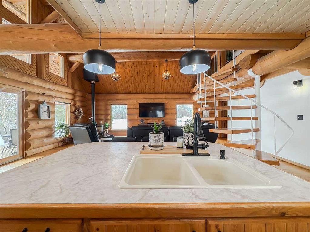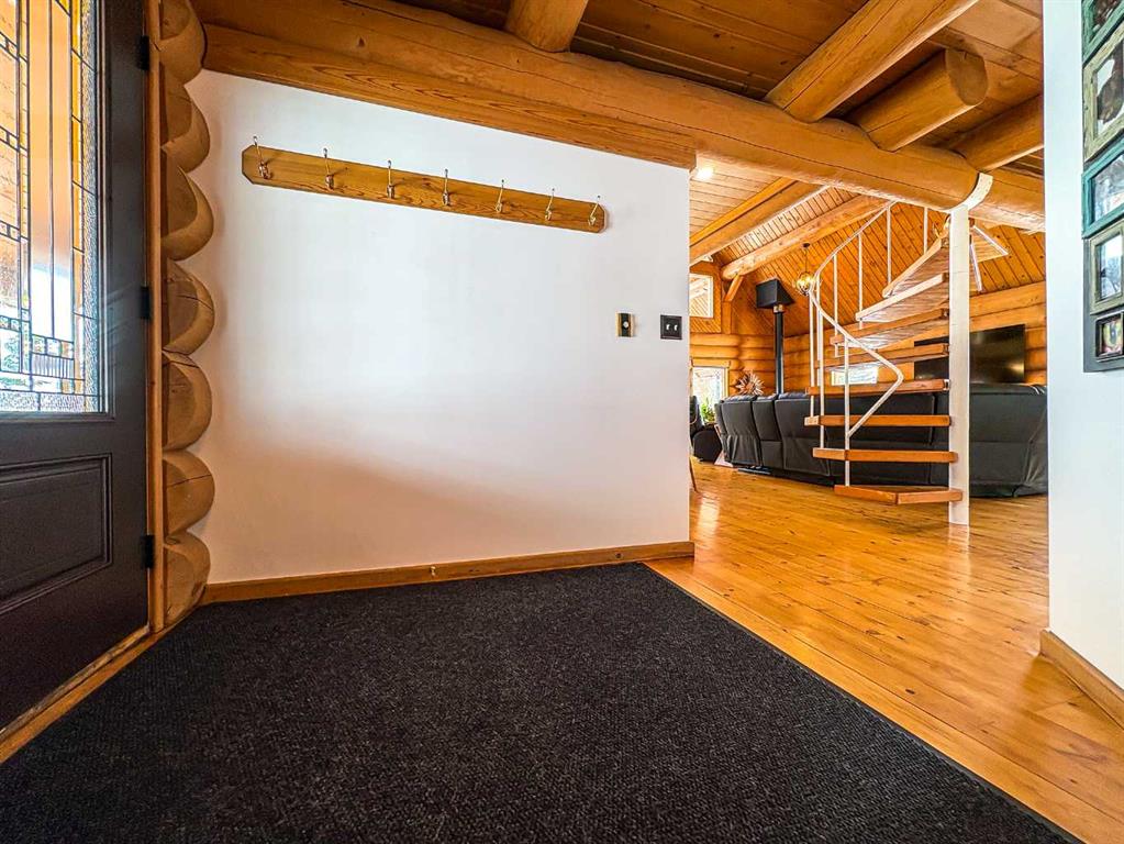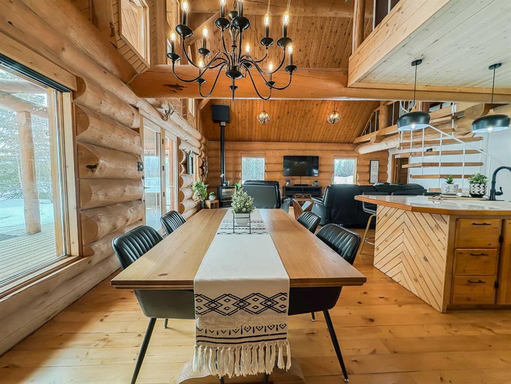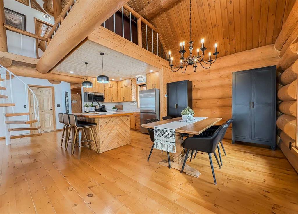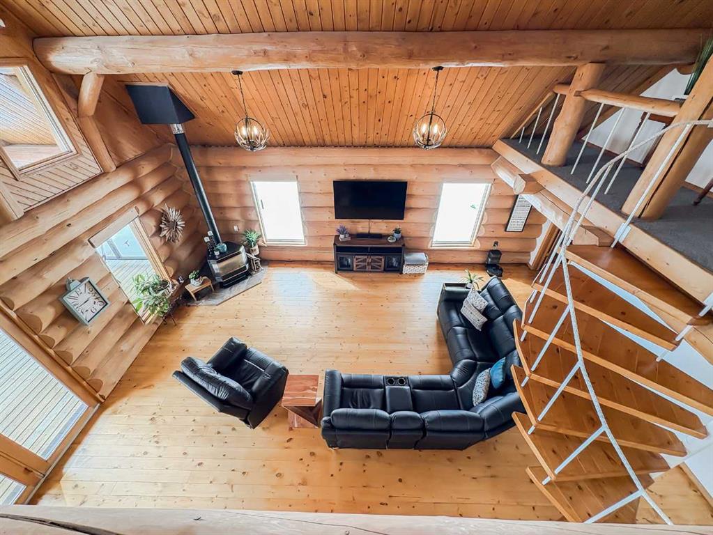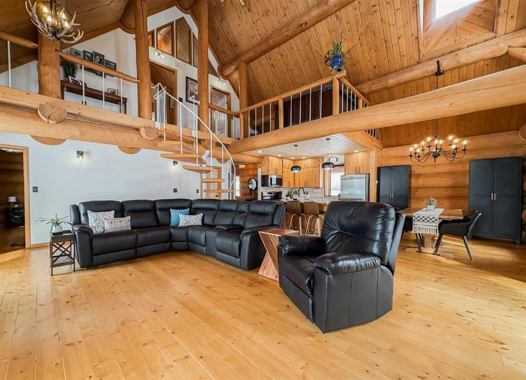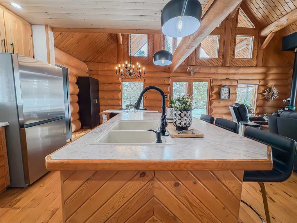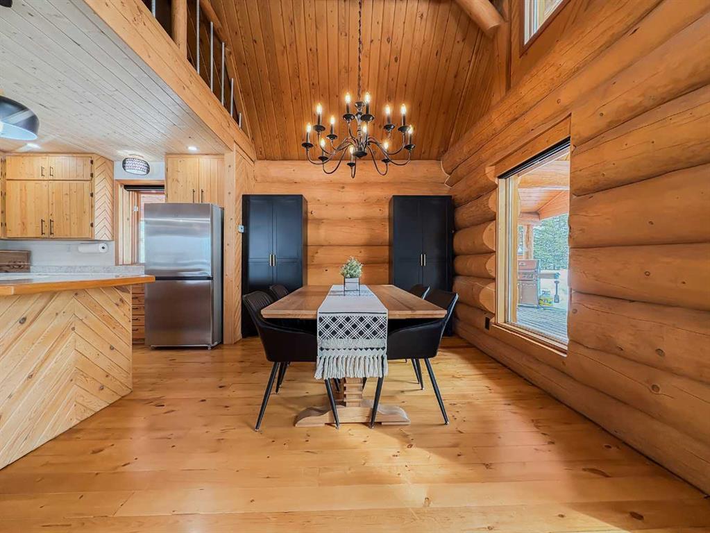 Set on 17.27 acres just over 100 km from Grande Prairie, this one-of-a-kind log home offers the perfect balance of peaceful country living and practical functionality, ideal for those looking to live, work, and unwind all in one place. Step inside and you’re immediately welcomed by soaring vaulted ceilings, exposed log beams, and a stunning open-to-below design that fills the home with natural light. The main living space is warm yet airy, anchored by large windows that frame the surrounding landscape. The kitchen is both functional and inviting, featuring ample cabinetry, a central island with seating, and a seamless flow into the dining area. The home offers 2 bedrooms and 2 bathrooms, along with the convenience of main floor laundry. The primary suite feels like a true retreat, while thoughtful touches throughout the home create a cozy, elevated cabin feel without sacrificing brightness or style. Outside, the lifestyle truly shines. A covered wrap-around porch provides the perfect spot for morning coffee or evening relaxation while taking in the peaceful surroundings. The land itself is a versatile mix of pasture and grain, fenced and ready for horses or some livestock. For those needing space to operate or expand a business, the shop setup is exceptional. Featuring 5,560 sqft. of space, multiple attached bays, including one with in-floor heat, 3-phase power, 18-foot overhead doors, office space, multiple rooms, and even a bathroom! This property is fully equipped to support a wide range of uses. An additional detached garage adds even more storage or workspace options. Located just off the highway for easy commuting, this property offers the rare combination of accessibility, privacy, and opportunity all wrapped into a stunning log home setting. Ask your agent for the full list features & upgrades!