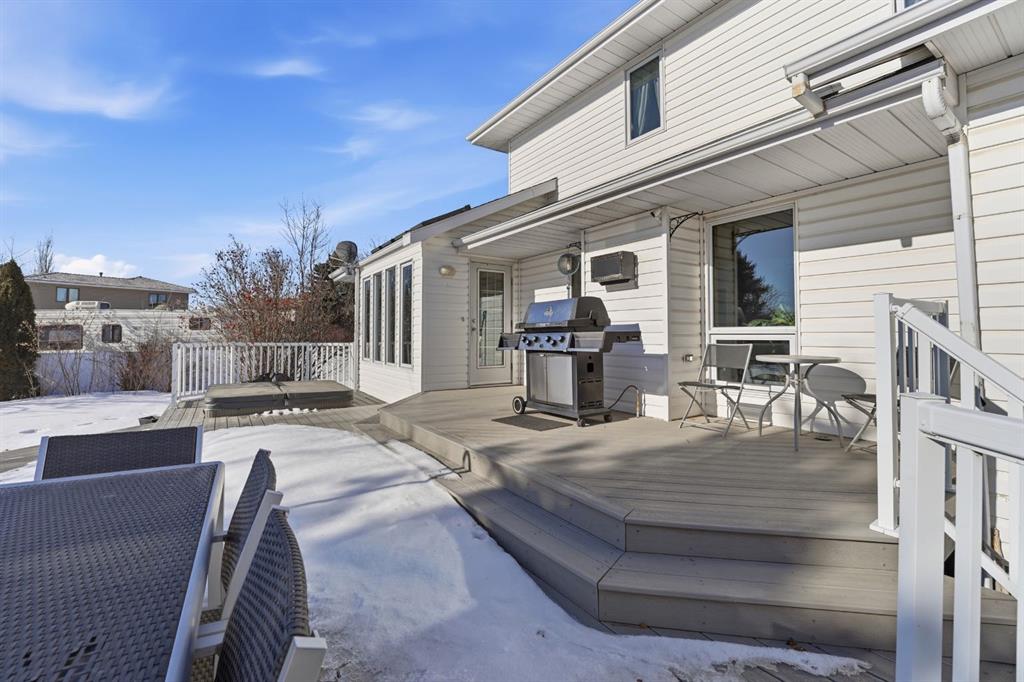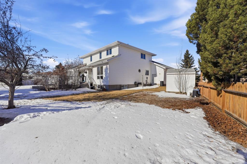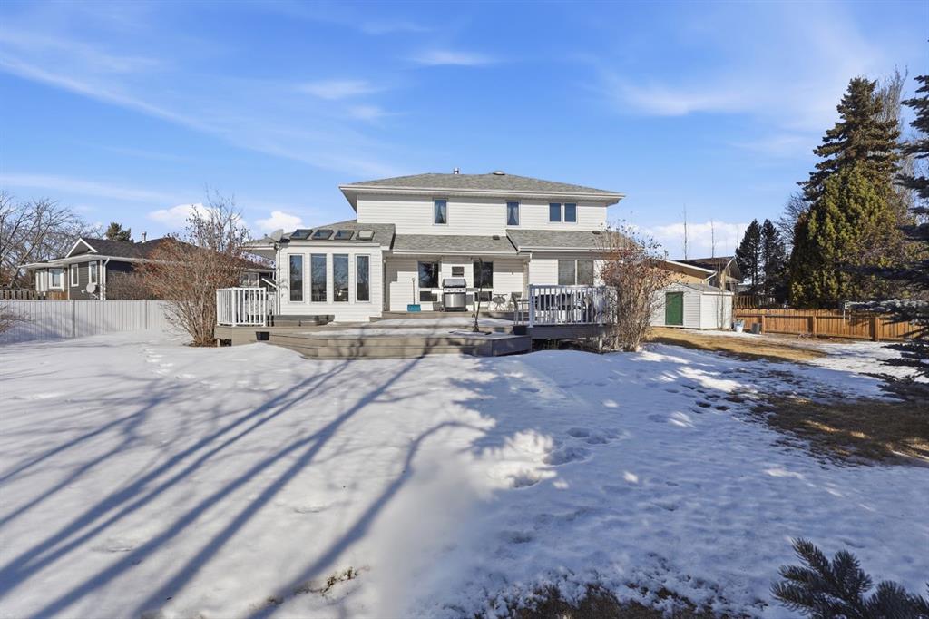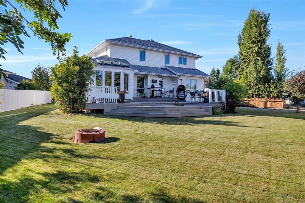 An elevated home offering space without sacrificing design — one of those places that just feels like home. Tucked into a quiet Stettler cul-de-sac, this property features a triple attached garage, 5 bedrooms (with potential for a 6th), and 4 bathrooms, creating the perfect setting to grow into and enjoy for years to come. Step inside to a welcoming foyer that opens into a bright and inviting living room, where large south-facing windows and rich hardwood flooring create a warm and comfortable gathering space. The formal dining room features tray ceilings, offering an ideal setting for family dinners and entertaining. The kitchen is both timeless and highly functional, complete with beautiful cabinetry, granite countertops, a center island with prep sink, gas range, and wall oven/microwave combo - perfect for those who love to cook and host. The adjoining breakfast nook is a standout feature, with a stunning skylight package and surrounding windows that fill the space with natural light, while a garden door leads directly to the tiered deck for easy indoor-outdoor living. The main floor also includes a versatile bedroom or office, a full bathroom, and a practical mudroom with direct access to the garage, which is equipped with an electric vehicle charger. Upstairs, you’ll find three additional bedrooms and a full bathroom, along with a spacious primary suite featuring a cozy gas fireplace, a super-sized walk-in closet, and a full ensuite — creating a comfortable and private retreat. The fully developed lower level expands your living space with a large family and games area, an additional bedroom, generous storage, and the option to create a sixth bedroom if desired. A unique highlight is the 3-piece bathroom complete with a dry cedar sauna. Outside, the private backyard is beautifully landscaped with mature trees, vinyl fencing, and RV parking with hook-up. The multi-tiered deck with inset hot tub and fire pit area creates a great space for relaxing or entertaining. With central air conditioning already in place and exceptional space throughout, this home offers a layout and lifestyle that truly works for everyday family living — a home where you can truly put down roots and grow into for years to come.