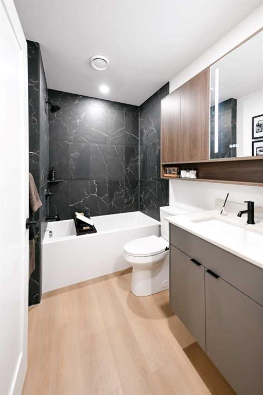 Welcome to Broadway on 17th, one of Calgary’s most exciting new urban developments, This beautifully designed studio show home offers an exceptional opportunity to own in a vibrant, amenity-rich community in the heart of the city. Thoughtfully crafted to maximize space and functionality, this studio residence delivers modern, efficient living without compromise. Clean lines, contemporary architecture, and premium appliances are paired with sophisticated finishes to create a home that feels both elevated and inviting. Every detail has been carefully considered to ensure comfort, style, and everyday practicality. Perfect for first-time buyers, investors, or urban professionals, this home offers flexibility with designer-selected colour palettes and upgrade options to personalize your space. Residents of Broadway on 17th enjoy access to an unmatched collection of resort-style amenities, including a full spa and sauna, fitness studio, co-working spaces, games lounge, arcade, sports simulator, and inviting social lounges. Pet-friendly areas and collaborative workspaces enhance both lifestyle and convenience. Take in breathtaking views from the exclusive Level 46 Fireside Sky Lounge, featuring a bar, indoor fireplace, and private dining areas overlooking downtown Calgary and the Rocky Mountains. At street level, the vibrant Broadway Plaza will offer a curated mix of restaurants, cafés, retail shops, daycare, and office spaces—bringing an energetic, walkable lifestyle right to your doorstep. Designed with intention, the tower configuration maximizes sunlight, privacy, and views, allowing residents to fully enjoy their surroundings. Located just minutes from Calgary’s top shopping, dining, and entertainment districts, this is an ideal opportunity to secure a stylish and efficient home in a highly sought-after location. Completion anticipated for October 2030. Live above the energy at Broadway on 17th by Vesta Properties.