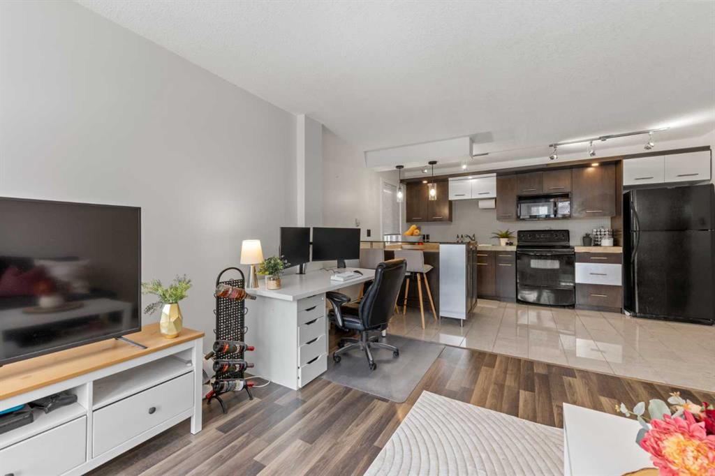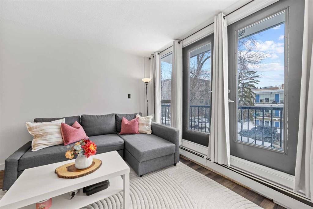 Welcome to this bright and sunny third-floor unit in a quiet 16-unit concrete building, perfectly positioned in the heart of Mission. Step inside to a spacious private foyer that opens into a warm and inviting living space filled with southwest natural light and peaceful tree-lined views. The modern kitchen features rich dark cabinetry with stainless steel accents, generous counter space, a stylish breakfast bar and a convenient window for added light and airflow. The comfortable living room is ideal for relaxing or entertaining and opens through French doors to a sunny private balcony, the perfect place to enjoy morning coffee or unwind after a walk through the neighbourhood. The spacious bedroom easily accommodates a king-size bed and offers great closet space. A well-appointed four-piece bathroom includes a vessel sink and soaker tub, while in-suite stacked laundry is conveniently tucked away in the hallway. This move-in ready home also includes an easily accessible rear parking stall. Step outside and enjoy one of Calgary’s most sought-after inner-city lifestyles. Located just moments from the vibrant restaurants, cafés, boutiques and fitness studios of 4th Street, with easy access to the Elbow River pathways, 17th Avenue, the Stampede Grounds and downtown. Whether you are meeting friends for dinner, grabbing coffee, walking to work or biking along the river, this unbeatable Mission location truly has it all. Pets allowed with board approval.