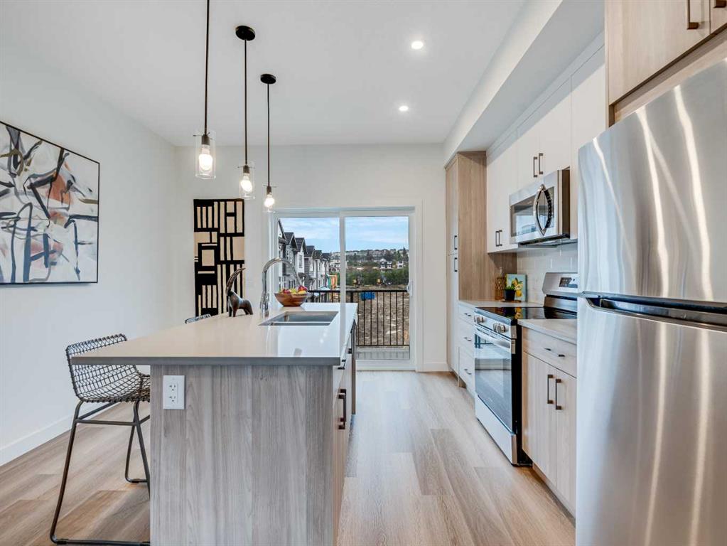 Step into a life of style and ease with this gorgeous, three-story townhome nestled in the highly sought-after Westmount, Okotoks community. Built by the trusted team at Slokker Homes, this property is your launchpad for modern living in a prime, family-friendly location. The bright, open-concept main floor is designed for seamless entertaining. You'll love the airy feel created by soaring knockdown ceilings and the flow of the durable vinyl plank flooring. The kitchen is a true showstopper: Quartz counters, high-end stainless steel appliances and chic, two-tone cabinetry with soft-close drawers. Upstairs, you'll find two generous bedrooms, including the relaxing primary suite with its own full ensuite bathroom. A well-placed laundry area on this level makes laundry a breeze. Location is everything, and this one delivers! Enjoy the security and convenience of an attached garage plus an EXTRA TITLED parking stall!. Your prime Westmount spot puts you steps from the Daily errands and weekend fun are simple with the Westmount Centre retail hub—offering essential shopping, dining, and services—just minutes away. This home beautifully blends sophistication, comfort, and unbeatable location, providing the perfect base for your vibrant life in the foothills.
