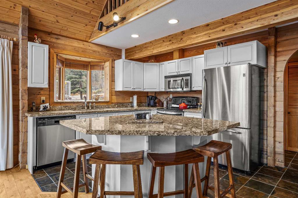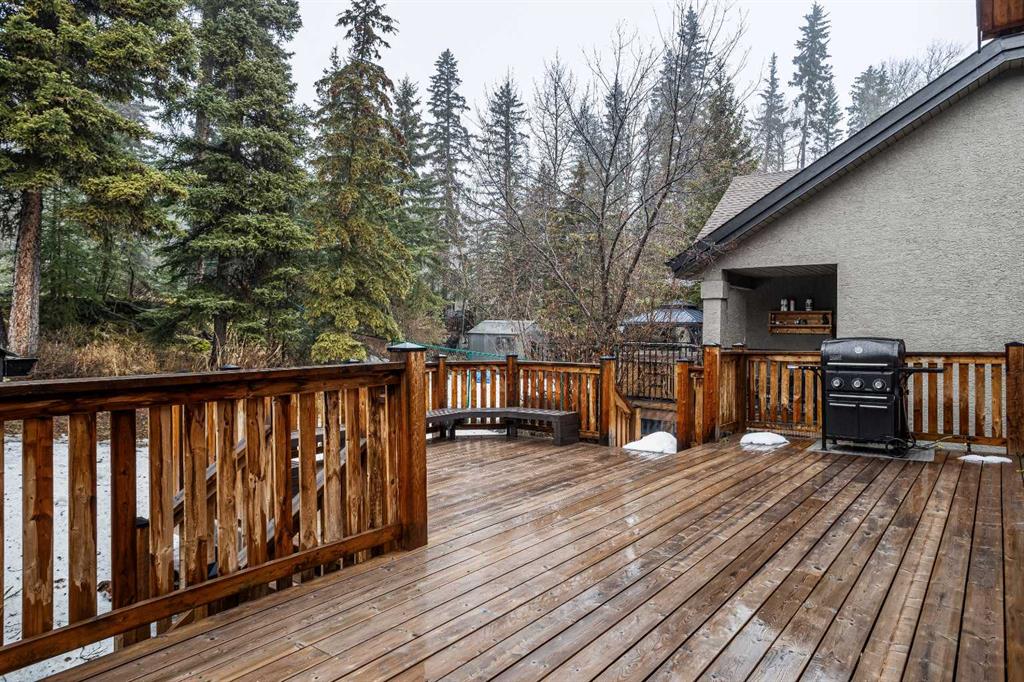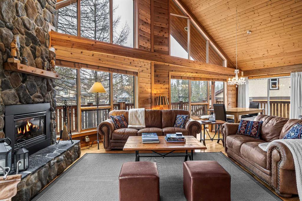 Welcome to 181 Charles Carey in Canmore—an exceptional mountain home offering over 2,662 sq ft of thoughtfully designed living space. This stunning 5-bedroom, 4-bathroom residence blends warmth and modern comfort, highlighted by soaring ceilings and expansive floor-to-ceiling windows that flood the living room with natural light while framing breathtaking alpine surroundings. The heart of the home features a modern kitchen equipped with stainless steel appliances, perfect for both everyday living and entertaining. The inviting living area is anchored by a striking stone fireplace and complemented by rich wood paneling on the ceiling, creating a true mountain retreat ambiance. Upstairs, a cozy loft overlooks the main floor, adding flexibility and charm, while spacious bedrooms provide comfort for family and guests alike. The fully developed lower level offers a second living space—ideal for recreation, relaxation, or hosting visitors. Outside, enjoy a wraparound deck and backyard setting, perfect for taking in Canmore’s natural beauty. A detached two-car garage adds convenience and functionality. This is a rare opportunity to own a spacious and beautifully appointed home in one of Canmore’s most sought-after communities