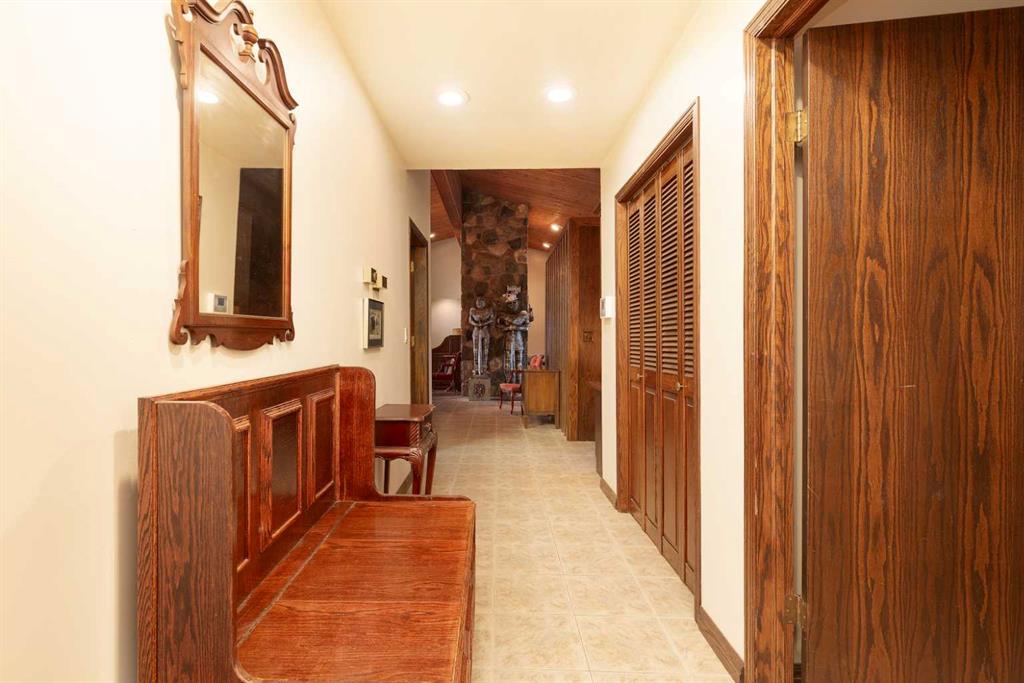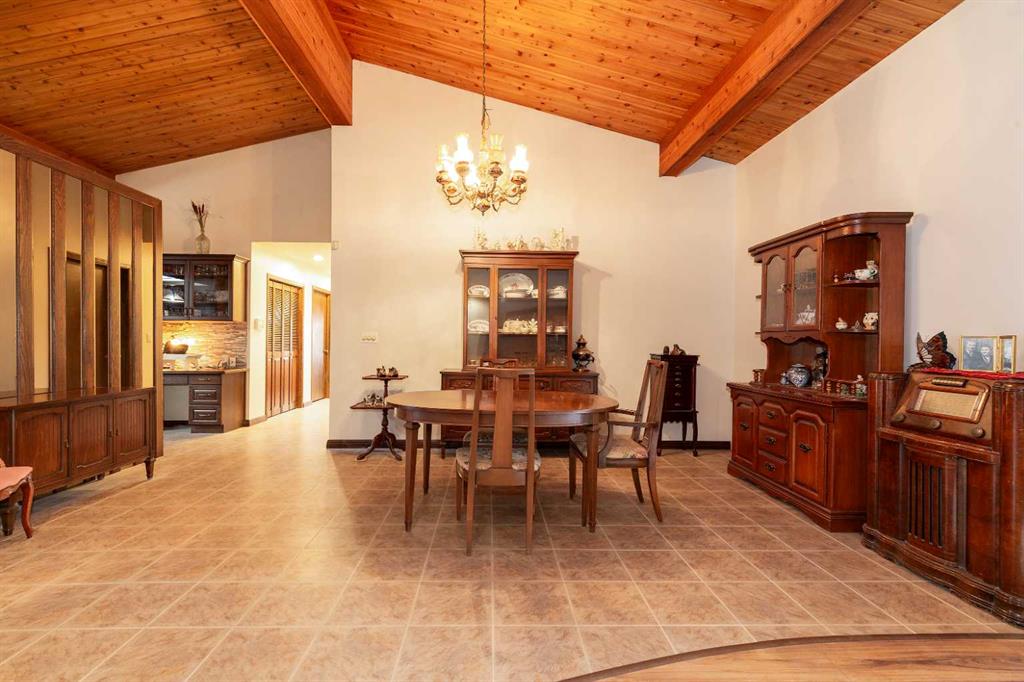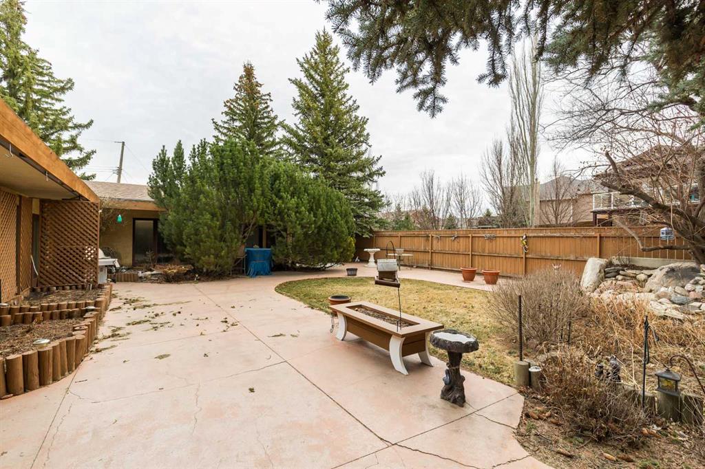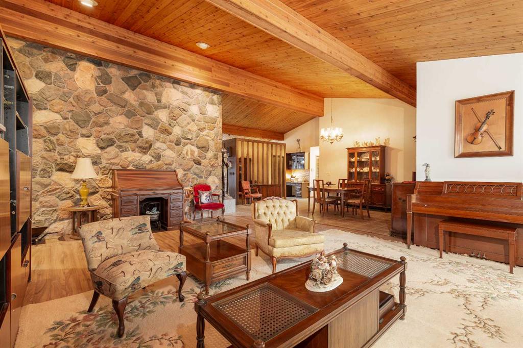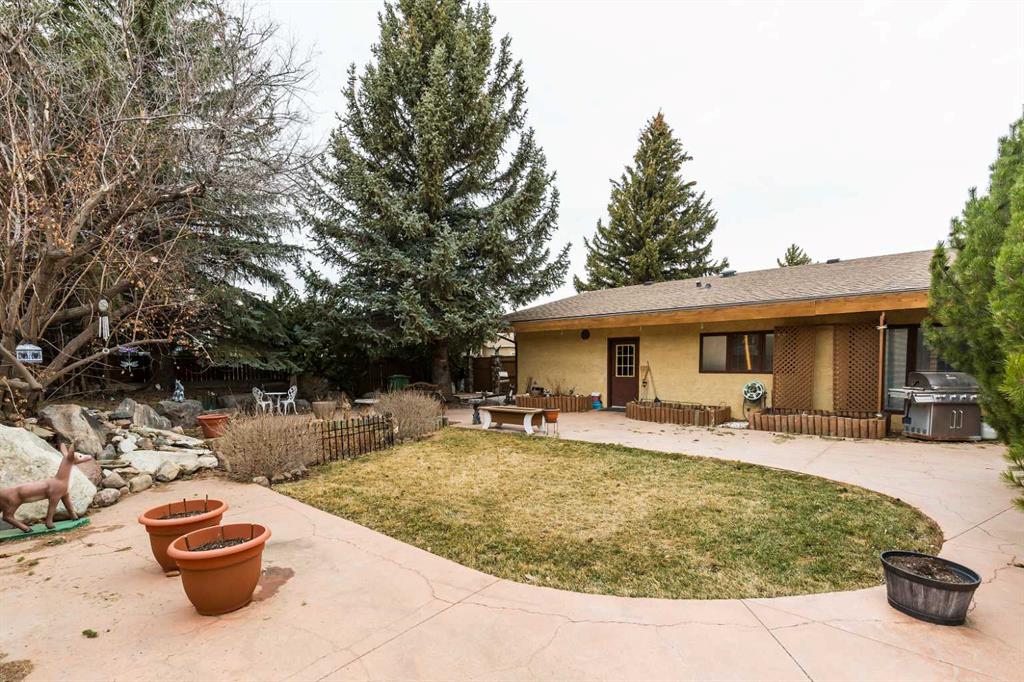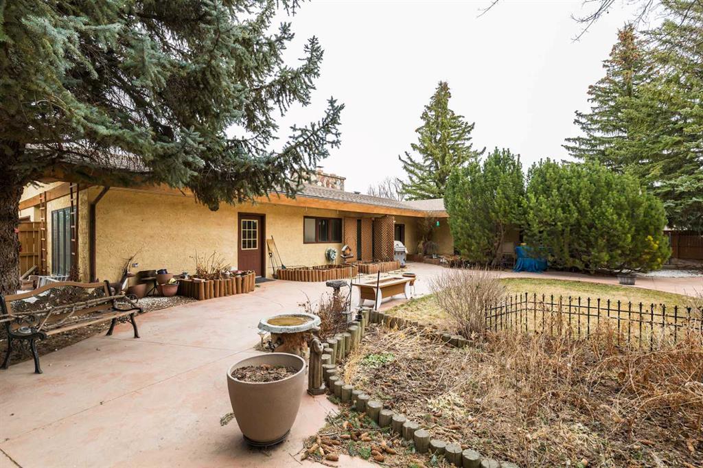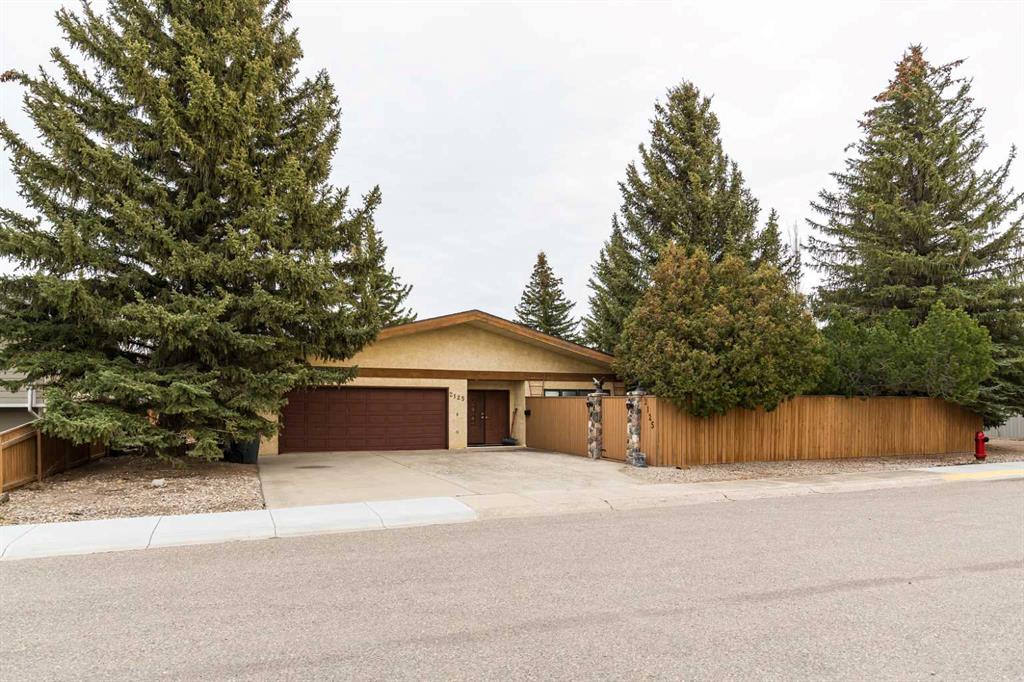 Welcome to 2125 25 St. Tucked away in a quiet cul-de-sac, this impressive 3,420 sq. ft. bungalow offers a rare blend of space, character, and refined design, all set on a beautifully treed 12,775 sq. ft. lot. Showcasing a warm mid-century modern influence, the home features timeless architectural elements, natural materials, and a layout that emphasizes both form and function. The main living area is truly striking, highlighted by soaring beamed cedar vaulted ceilings and a thoughtfully designed layout that balances formal and casual spaces. A floor-to-ceiling custom rock wood-burning fireplace serves as a stunning focal point, gracefully separating the formal living and sitting rooms from the inviting family room, kitchen, and breakfast nook. The expansive kitchen is well-appointed with a large island, built-in oven, and a distinctive brick surround stovetop. The home features 3 bedrooms, a separate office, and 3 full bathrooms, with all 3 bedrooms enjoying direct access to a bathroom, including two bedrooms with private ensuites,. The primary suite is a luxurious retreat, complete with a walk-in closet and a spacious ensuite offering dual vanities, a soaker tub, and a separate shower. Just off the primary bedroom, a private hot tub room with a skylight and sliding glass doors opens to the patio—creating a serene, spa-like escape. Outdoors, the fully fenced and landscaped yard is framed by mature trees, providing both privacy and a tranquil setting. A double attached garage and space for RV parking compliment this exceptional property. A distinctive home offering timeless appeal in a sought-after Coaldale location.