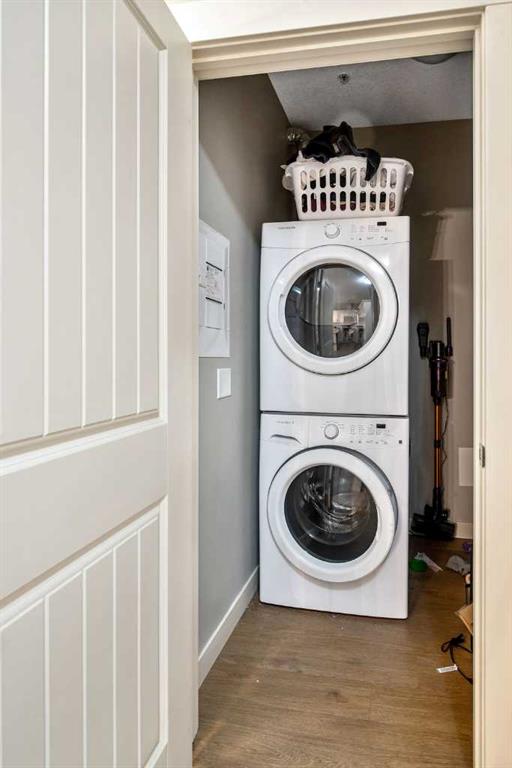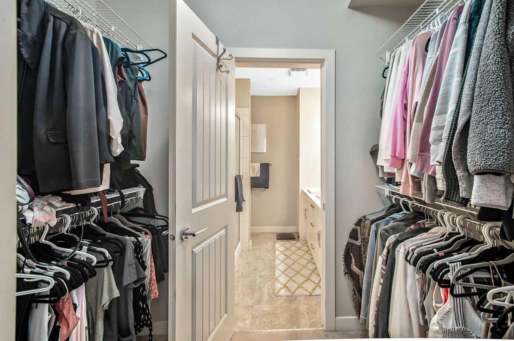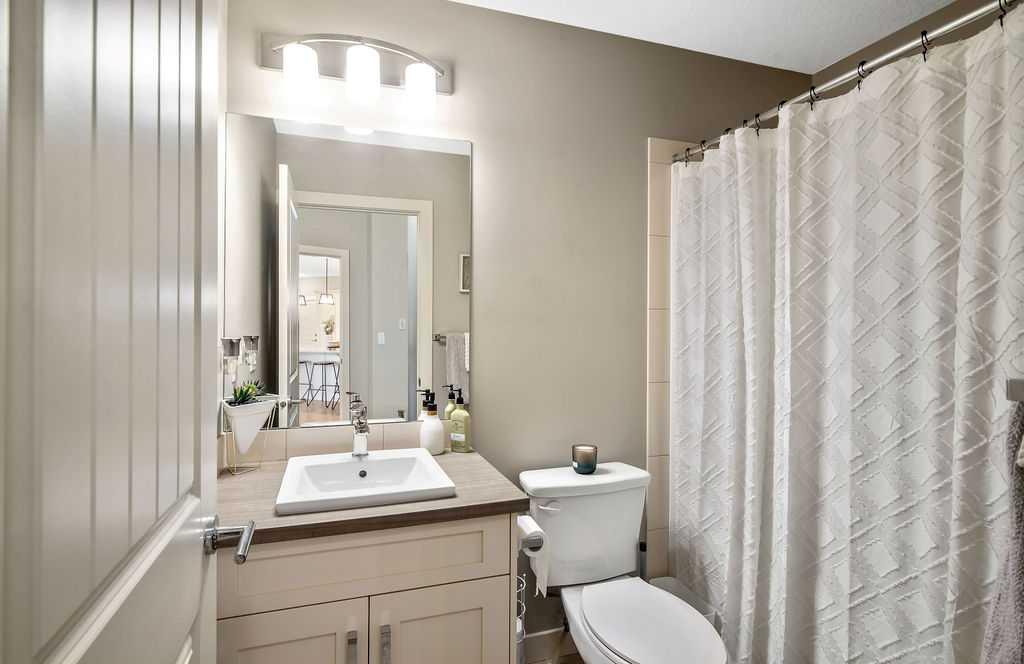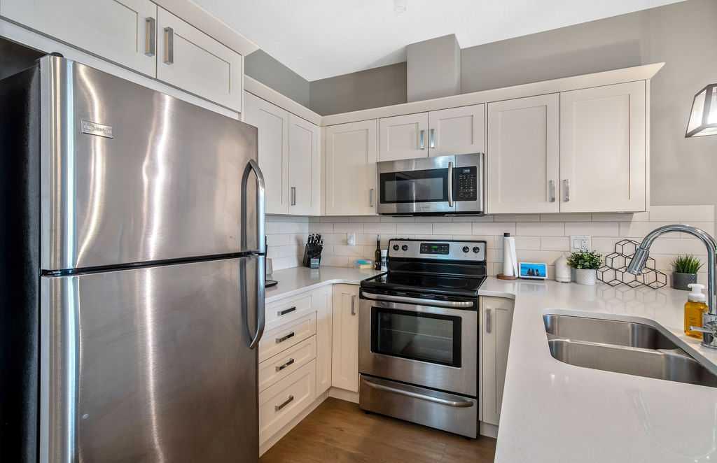Light and airy, this lovely upper floor condo in beautiful Cranston showcases upscale finishes and a great location. Sunshine floods the main living area from the east through sliding glass doors and transom windows above. Vinyl plank flooring in a rustic wood aesthetic is a grounding base for the sleek palette of whites, greys, and black accents, giving the unit an effortless, high-end look. In the kitchen, plentiful cabinetry includes pantry cupboards, and quartz counters extend into an eating bar in a layout that connects the space so conversation flows without pause as you transition between cooking, dining, and relaxing. To one side, the primary bedroom is a self-contained retreat with a walk-through closet. A gorgeous ensuite offers dual sinks, a linen cupboard, and a glassed-in shower with a bench. The other wing of the flat holds the second bedroom and another full bathroom – a roommate scenario would work well here, as would a home office or nursery for a new family. In-suite laundry is a huge perk, and the covered balcony has BBQ hookups. This unit has underground titled parking as well. The Cranford Ridge complex is well-run, with attractive green spaces. The local shops at Cranston Corner are only steps away, as is access to the community pathway system, which extends into a large natural area. Parks and playgrounds are within walking distance, and there are several options for shopping and schools in a short drive. The Resident’s Association is close, and with your HOA membership you will have access to facilities and programs there, including the outdoor rink and racquet courts. Just across Deerfoot, Seton holds a plethora of shops, services, and restaurants, as well as the South Health Campus. This area is quickly becoming a new centre for the city, with a great range of amenities available nearby. Of course, if you like adventure, this community is well-located for you to be on the highway headed out of town. You could be first out into Kananaskis Country for camping, hiking, and alpine activities, or explore small town Alberta to find hidden gems, movie sets, and so much more. Includes one parking stall.