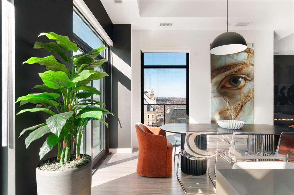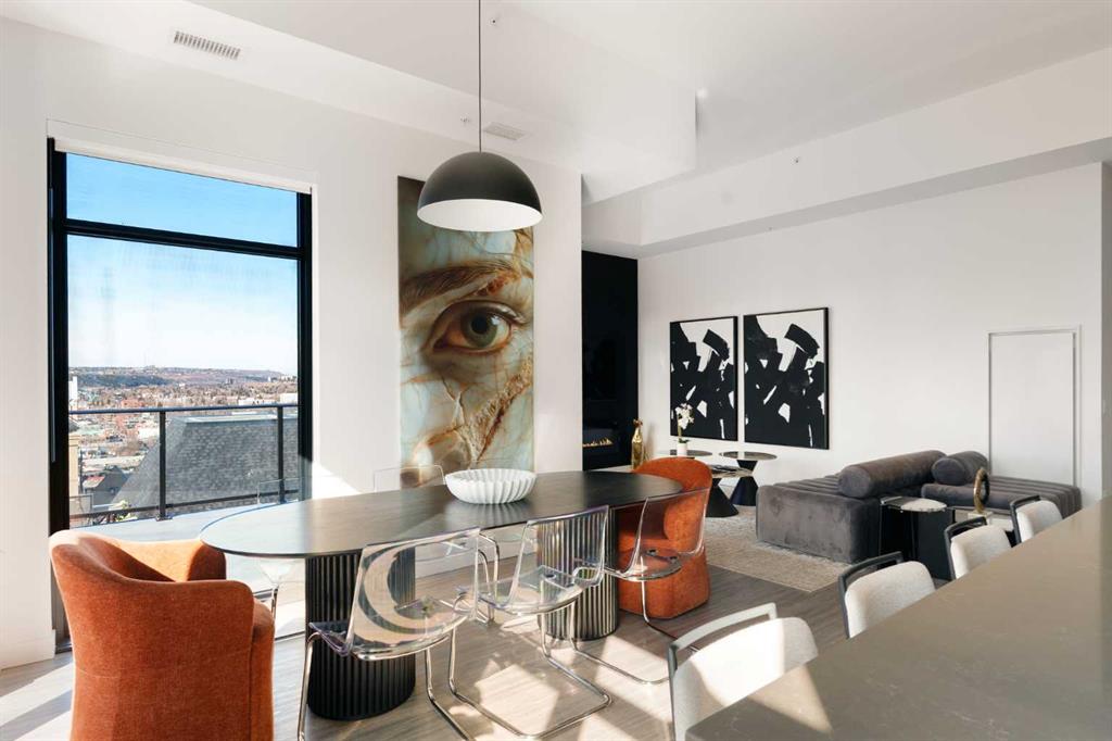 Experience elevated urban living in this luxury penthouse in Downtown Calgary, offering a rare combination of breathtaking views, modern design, and premium finishes. This exceptional 2 bedroom + den, 2 bathroom condo is thoughtfully designed with a seamless open-concept layout that connects the living, dining, and kitchen spaces—perfect for both entertaining and everyday living. The contemporary kitchen features sleek finishes and flows effortlessly into a bright and spacious living area, all framed by expansive windows that capture panoramic views of the Rocky Mountains, Bow River, and Calgary skyline. Step outside onto the expansive wrap-around balcony with west exposure, ideal for enjoying stunning sunsets and outdoor living at its finest. The primary bedroom retreat offers both comfort and sophistication, complete with a spa-inspired 5-piece ensuite featuring a soaker tub, dual vanity, and walk-in shower. A second bedroom and versatile den provide flexibility for guests, a home office, or additional living or storage space. Additional features include titled underground parking, and a dedicated storage locker. Located in the heart of Downtown Calgary, this penthouse offers unmatched access to river pathways, dining, shopping, and urban amenities—making it an ideal opportunity for buyers seeking luxury condo living in one of Calgary’s most desirable locations. A rare penthouse offering with unmatched views, location, and lifestyle—don’t miss your opportunity.