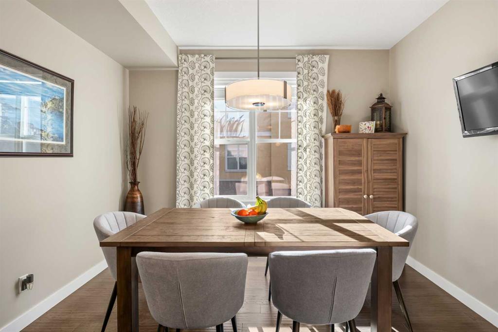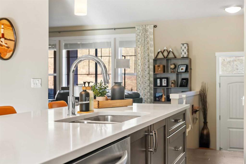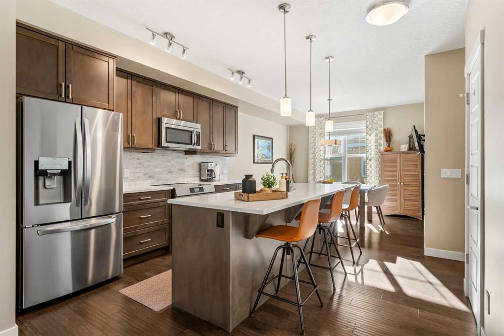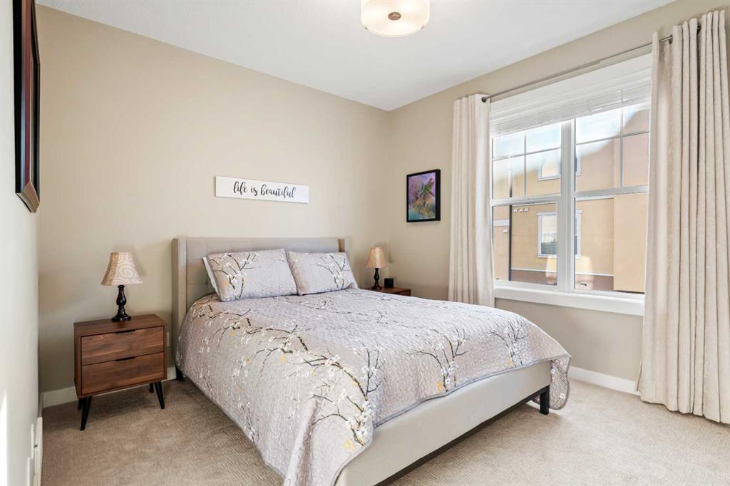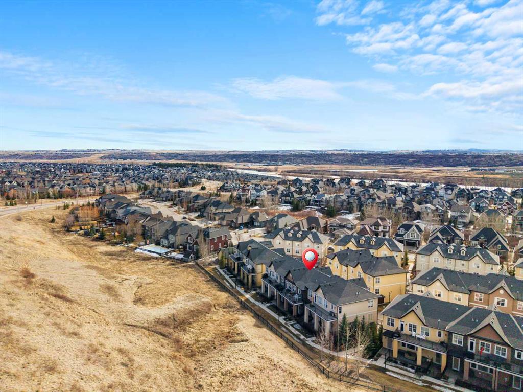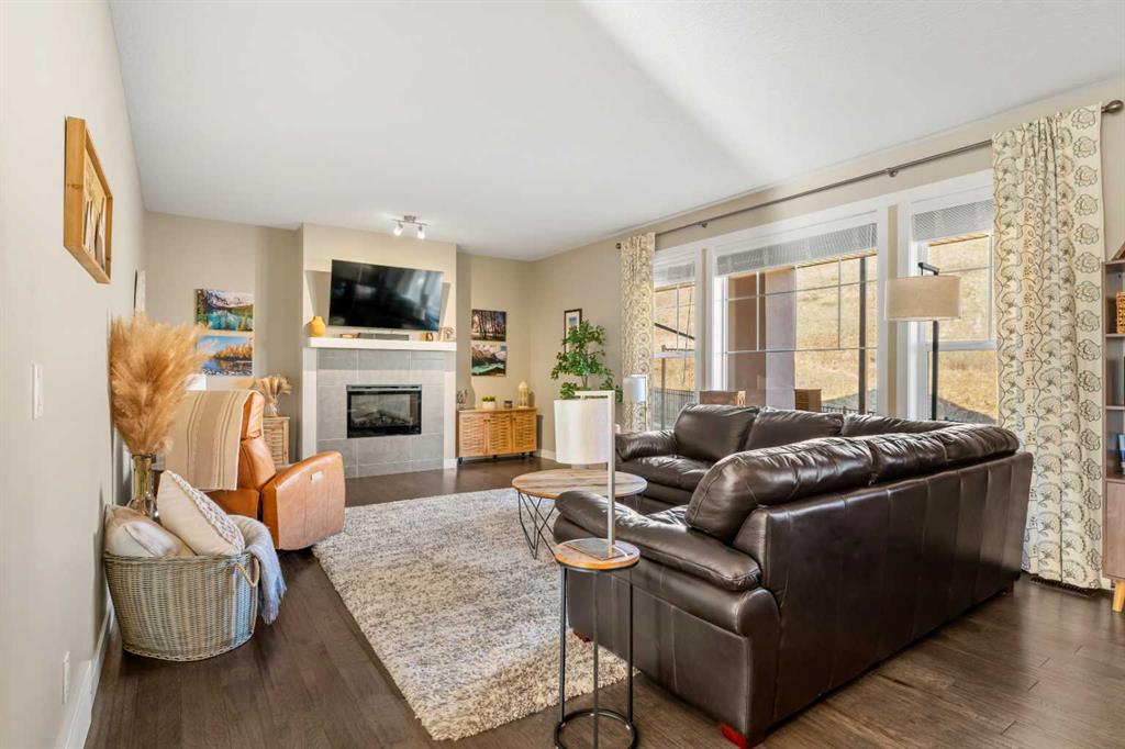 Opportunities like this, do not become available often! ESTATE living Located in the highly desirable community of Cranston Riverstone, this beautifully maintained lower level, BUNGALOW-style townhome offers the perfect blend of comfort, functionality and lifestyle—surrounded by nature and wild life. With 1732 sq. ft. of combined living space, this home is ideal for downsizers, small families, or buyers seeking low-maintenance living without compromising on style or convenience. The main level features a bright, open-concept layout with durable ENGINEERED HARDWOOD flooring, large windows, and a warm, inviting feel. The living room is centered around a cozy gas fireplace, perfect for relaxing or entertaining. The kitchen is both stylish and functional, complete with quartz countertops, a central island, modern appliances, and ample cabinetry, making everyday cooking a breeze. The adjoining dining area offers plenty of space for hosting and entertaining. This home includes two spacious bedrooms, highlighted by a comfortable primary retreat with a walk-in closet featuring built-in organizers and a private 4-piece ensuite with a double vanity. A second full bathroom provides added flexibility for guests or shared living. In-unit laundry with built-in cabinetry adds everyday convenience. Step outside to enjoy your OVERSIZED patio overlooking the scenic Riverstone HILLSIDE, where nature and wildlife are part of your everyday view. Whether you're relaxing or barbecuing, this outdoor space is perfect for year-round enjoyment. This home also features a FINISHED double attached garage with EXPOXY flooring which also includes garage cabinets, bikes racks and a tire rack. More valuable upgrades include NEW central air conditioning, window coverings, a water softener and doorbell camera. As you enter the basement, this space adds additional versatility, making it an ideal space for a home office, hobby area, or extra storage. Located within Mosaic Riverstone in Cranston, residents enjoy professionally maintained grounds with landscaping and snow removal, enhancing the low-maintenance lifestyle. The community offers easy access to walking and biking pathways, schools, shopping, parks, and the Bow River—perfect for outdoor enthusiasts. With its smart layout, quality finishes, and prime location in one of southeast Calgary’s most sought-after communities, 109 Cranbrook Villas SE is an exceptional opportunity! Book your showing today!