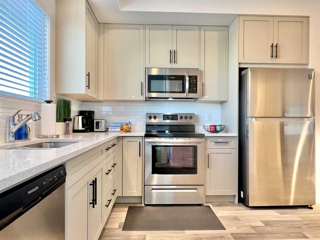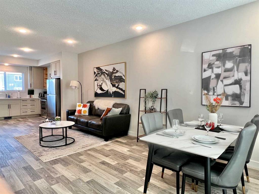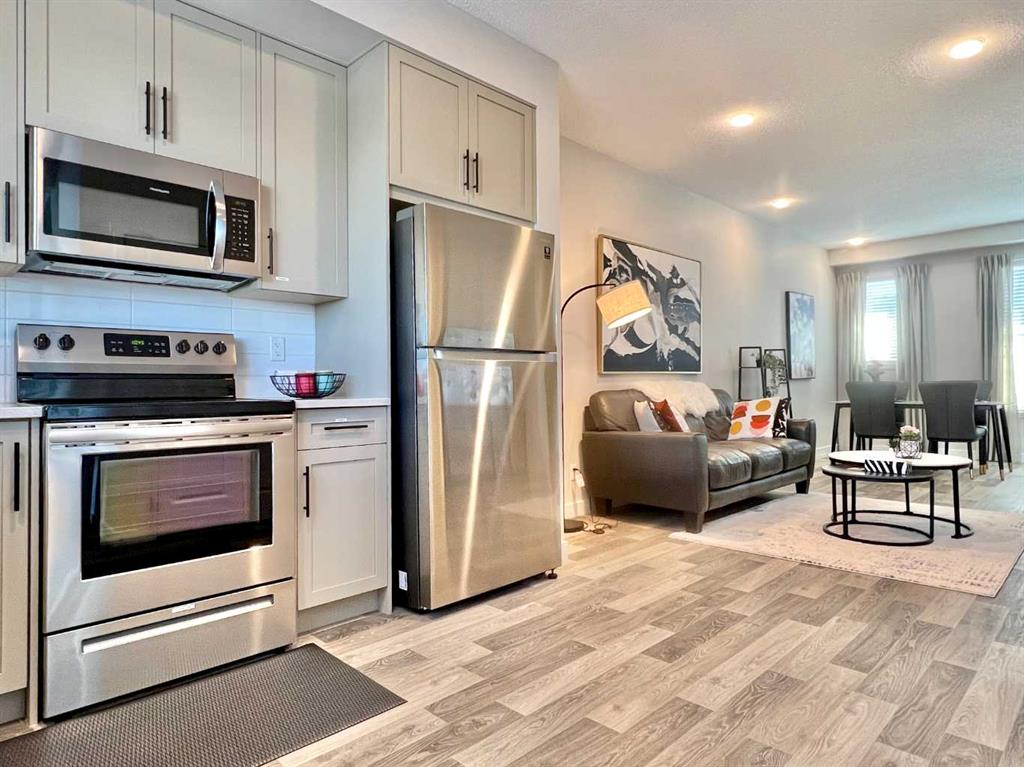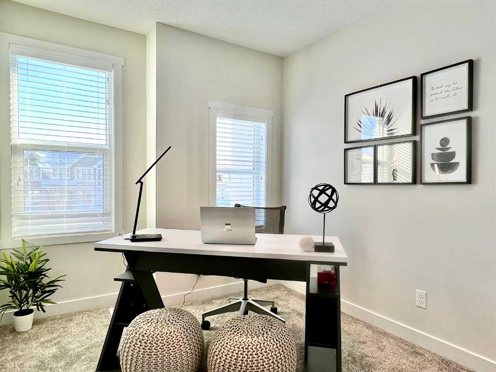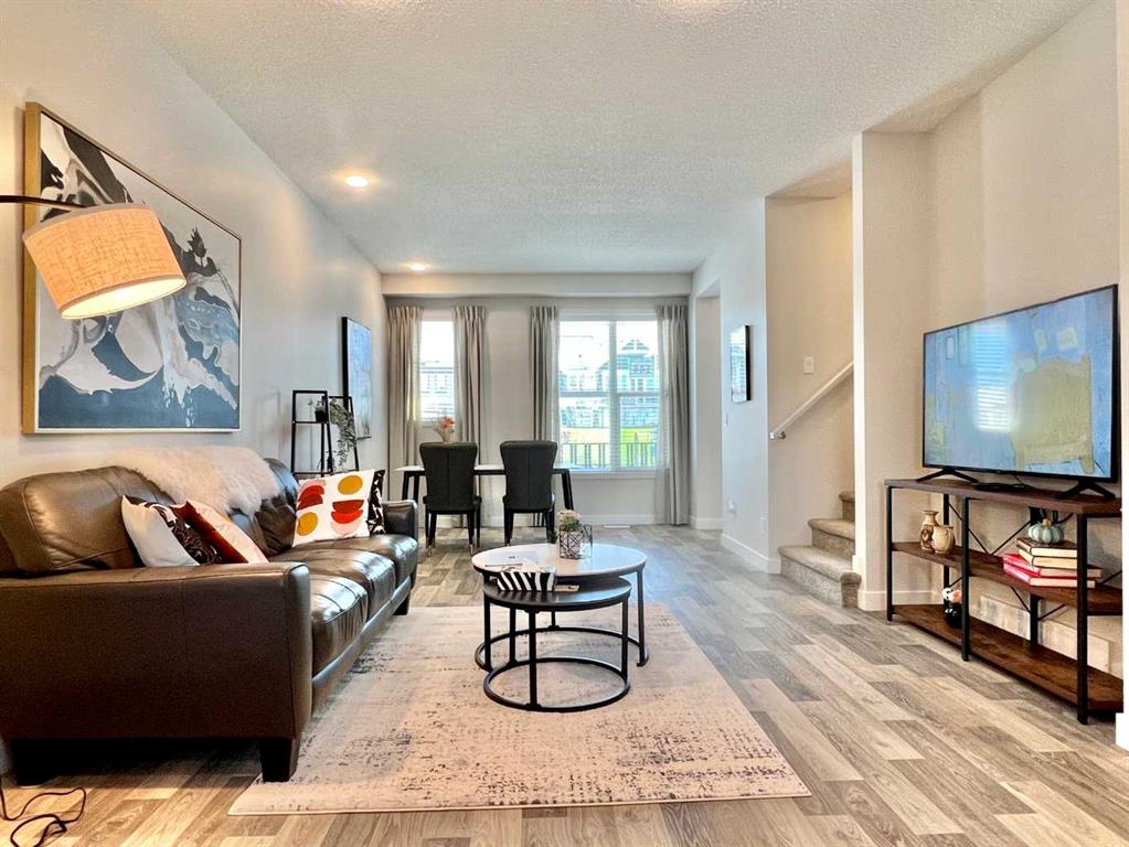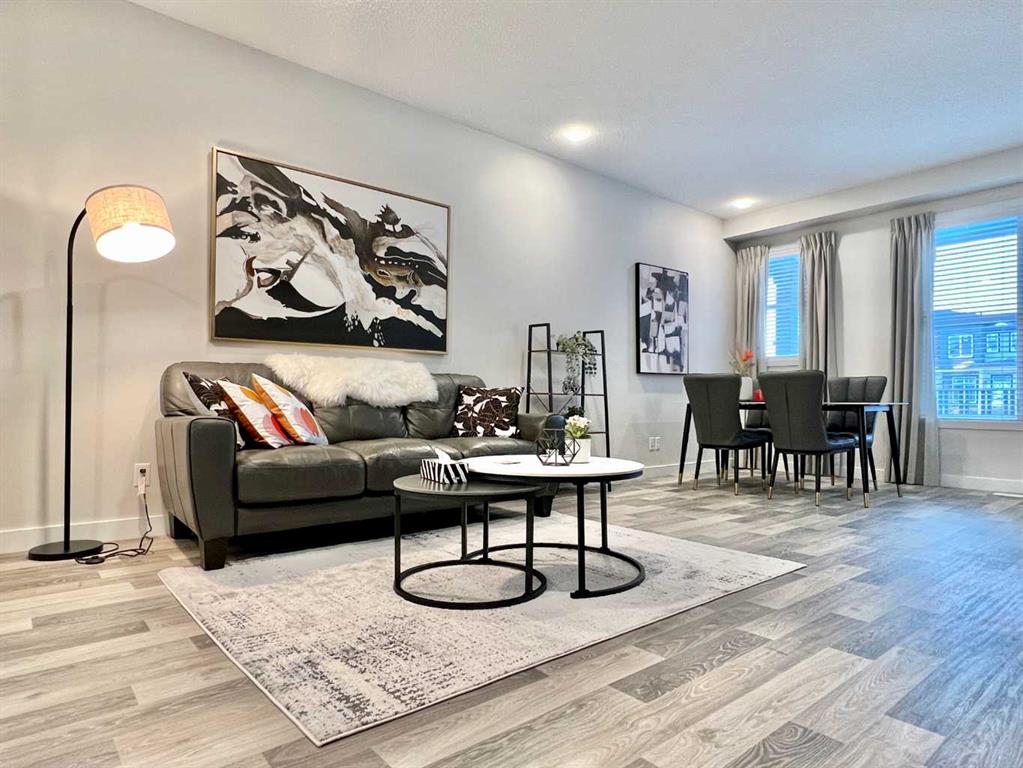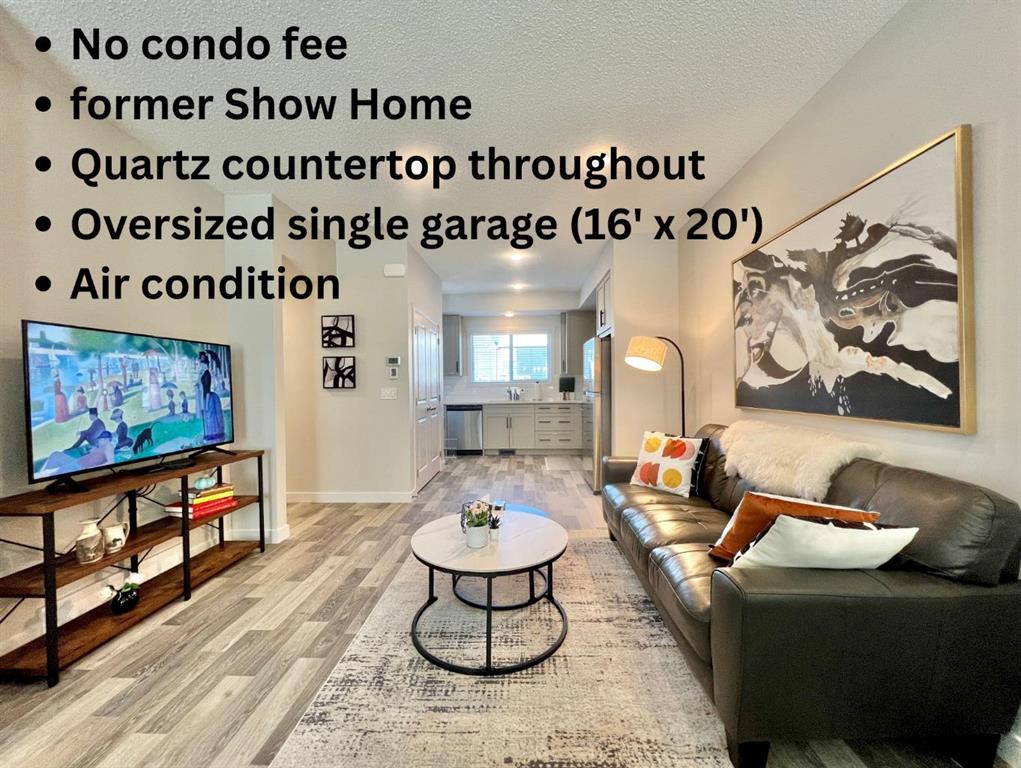 NO CONDO-FEE, FORMER SHOW HOME, LOW MAINTENANCE, A/C, OVERSIZED-SINGLE GARAGE! Welcome to this move-in ready 1,237 sq ft, 3-bedroom, 2.5-bath CONDO FEE-FREE townhouse in the highly convenient Carrington community. Just minutes from the Calgary International Airport, this FORMER SHOW HOME offers thoughtful upgrades and a functional layout that makes everyday living feel effortless and enjoyable. The bright open-concept main floor features a spacious dining area, and a living room that opens directly to the patio—ideal for morning coffee or summer BBQs with friends. Quartz countertops carried throughout the home in the kitchen and the bathrooms. The upgraded kitchen has extended cabinets and stainless steel appliances. Upstairs you’ll find three generous bedrooms, including a primary suite with its own 4-piece ensuite, a second full bath, and convenient laundry. Additional highlights include central air conditioning, a brand-new roof (2025), and an OVERSIZED 16X20 single garage that comfortably fits one car plus a bike, or provides plenty of extra storage space. The unfinished basement offers excellent potential with rough-ins for a full bathroom—perfect for creating a cozy family room, home office, guest suite, entertainment space, or additional storage tailored to your needs. This well-maintained, easy-to-show home was previously a popular Airbnb, thanks to its unbeatable proximity to the airport, making it ideal for frequent travellers, young professionals, or families seeking low-maintenance living. Move-in ready and full of potential— book your showing today!