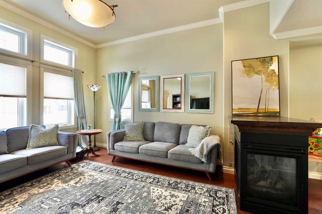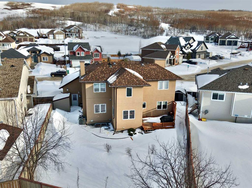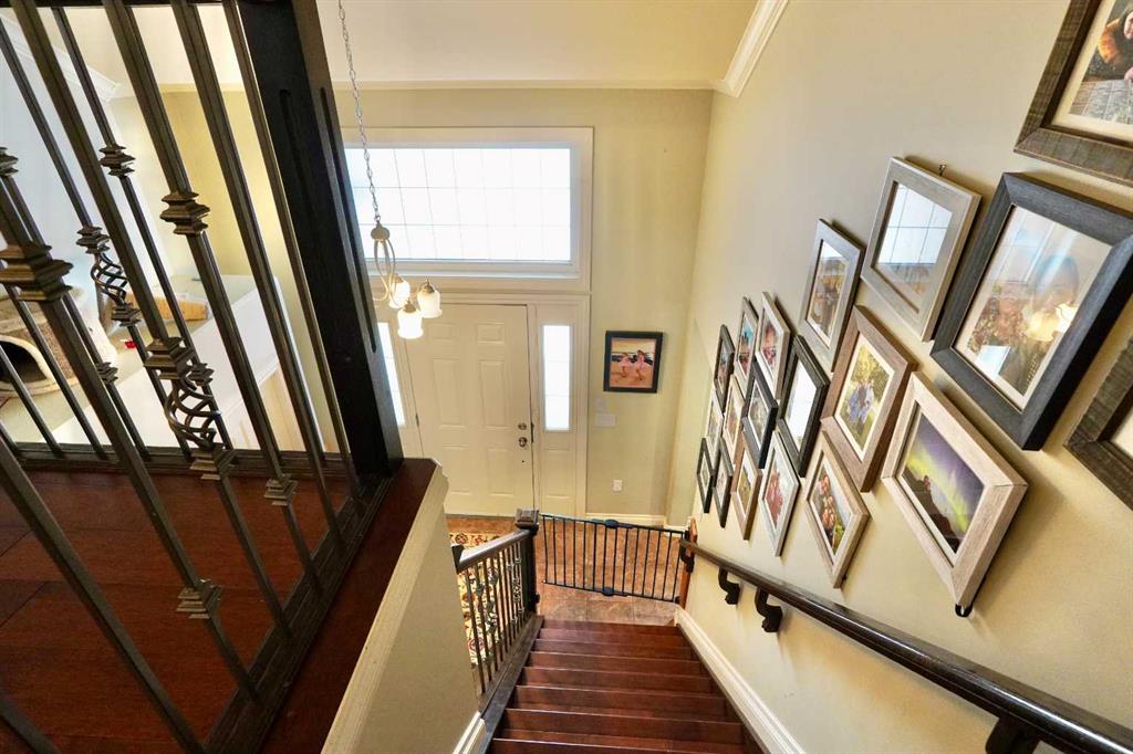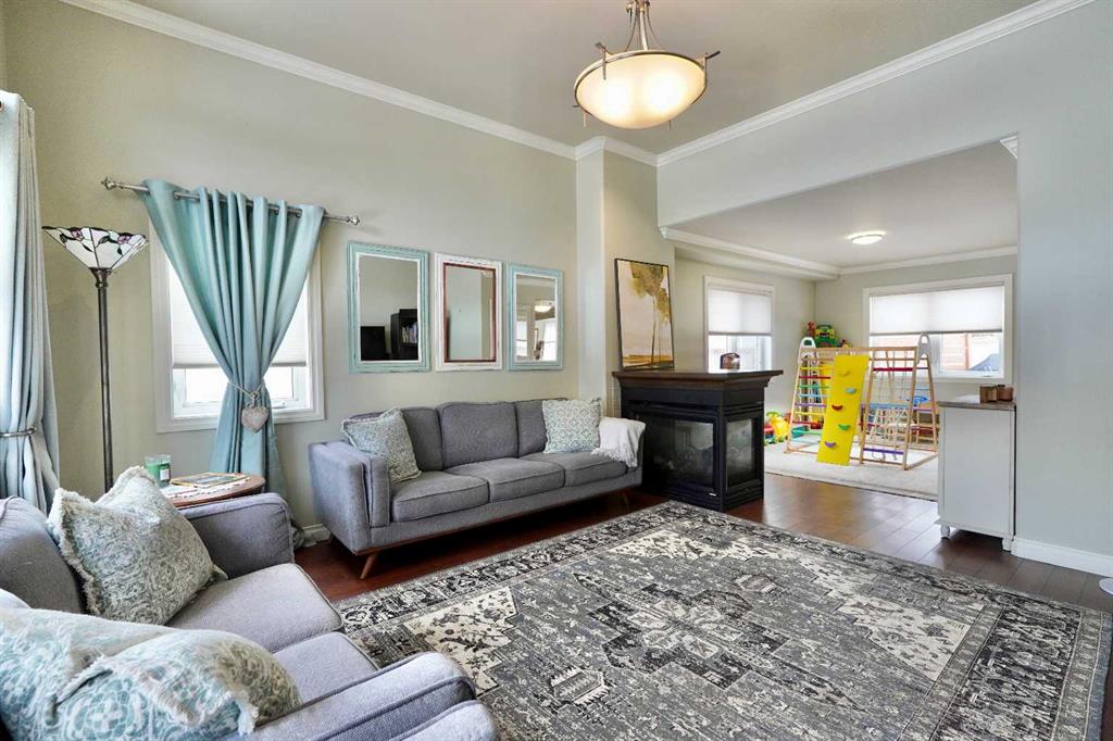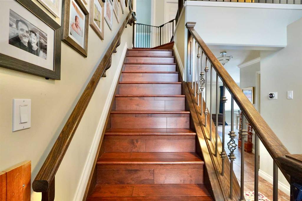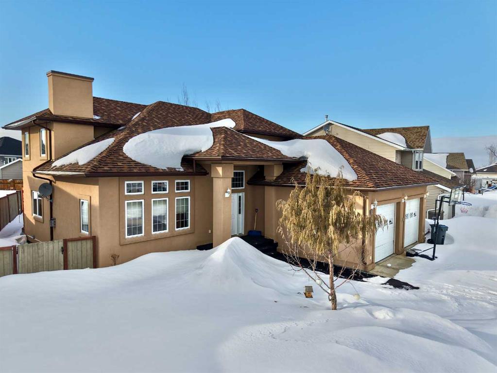 Welcome to this stunning, custom-built 1.5 story home in the highly sought-after Saddleback Ridge community—a true standout with exceptional craftsmanship, thoughtful design, and space for the whole family. Offering 5 bedrooms and 3.5 bathrooms, this property is an absolute must see. Step inside to an inviting open-concept layout centered around a gorgeous kitchen featuring rich wood cabinetry, quartz countertops, stainless steel appliances, a pantry, and an abundance of storage. The kitchen flows seamlessly into the cozy family room, complete with a gas fireplace, and an adjoining dining nook with garden doors leading to the back deck and brick patio—perfect for morning coffee or summer entertaining. On the opposite side of the kitchen, you’ll find an elegant formal living and dining area enhanced by a striking three-sided gas fireplace, creating a warm and welcoming atmosphere for gatherings. The main level also includes a convenient half bath and a well appointed laundry room with direct access to the heated double car garage. Upstairs, discover three generously sized bedrooms, including a spacious primary suite designed for relaxation. The primary retreat features a walk-in closet and a luxurious 5-piece ensuite with a large jetted tub. The additional full bathroom on this level also offers a deep soaker tub for added comfort. The finished full basement—with in-floor heating—adds even more living space. Here you’ll enjoy a large family room, two oversized bedrooms, a 3-piece bathroom, and a dedicated storage room. Outside, the beautifully landscaped and fully fenced yard is a true extension of the home. With a brick patio, retaining wall, underground sprinklers in the front and back, and a storage shed, the outdoor space is both functional and serene. Central air conditioning ensures comfort on warm summer days. This exceptional property offers incredible space, comfort, and features that cater to every member of the family. Don’t miss your chance to view this remarkable home—book your private showing today and experience all it has to offer.