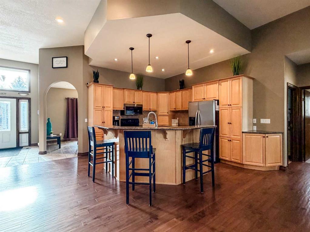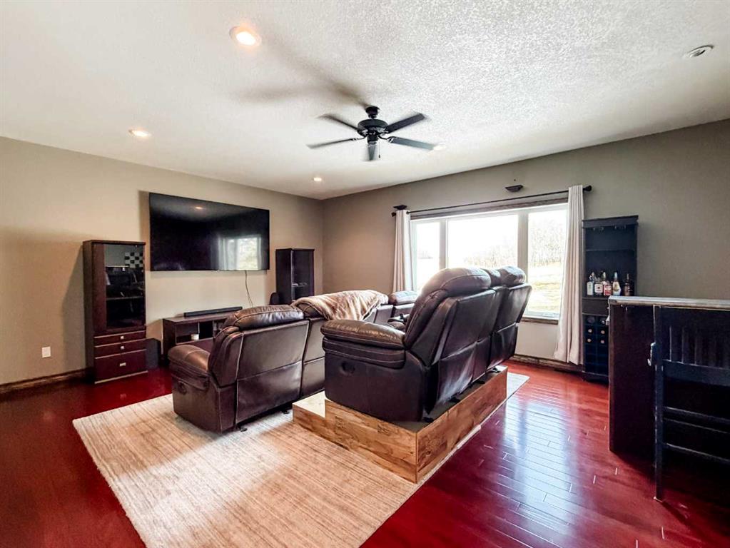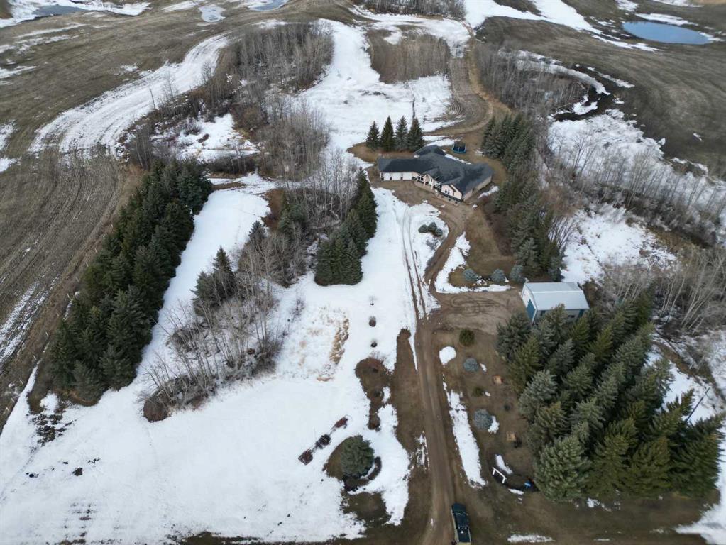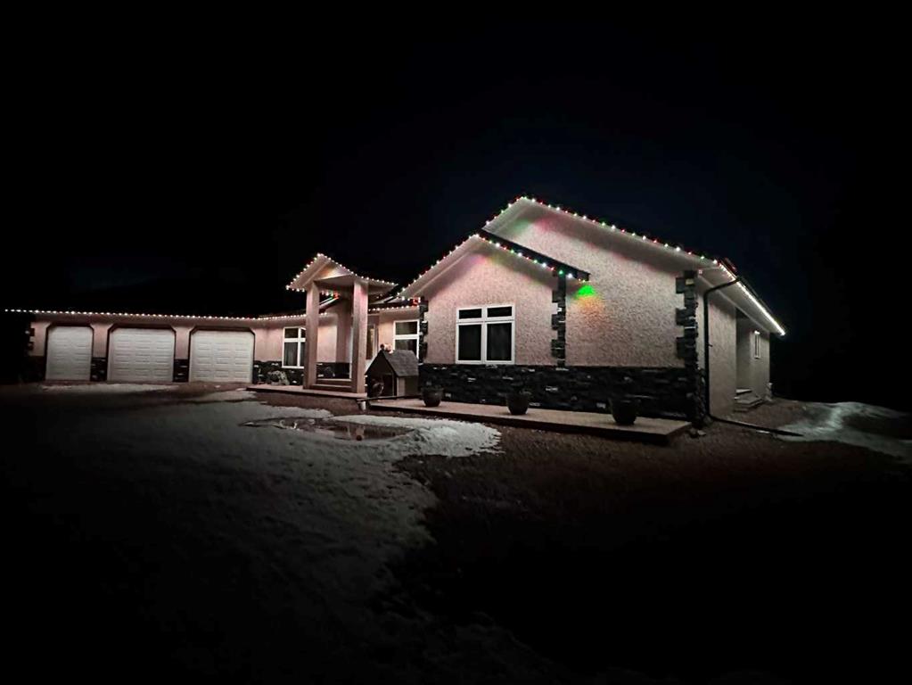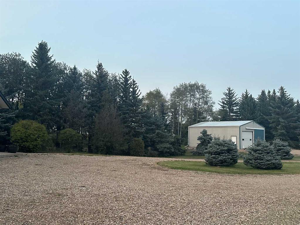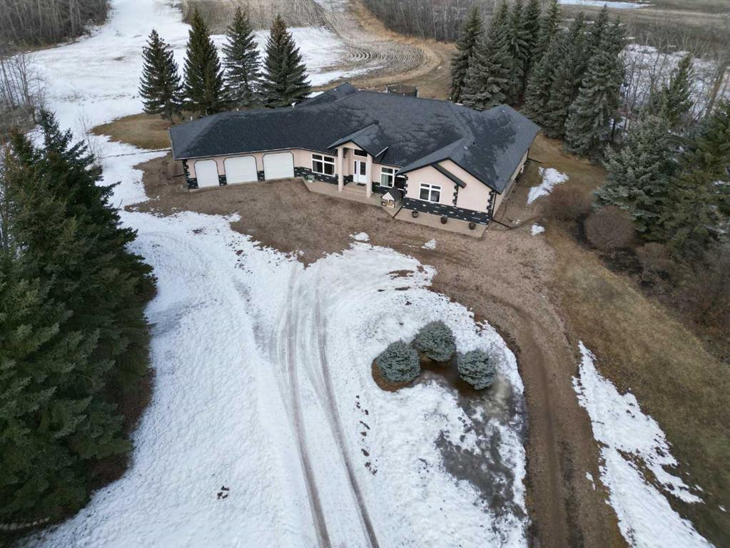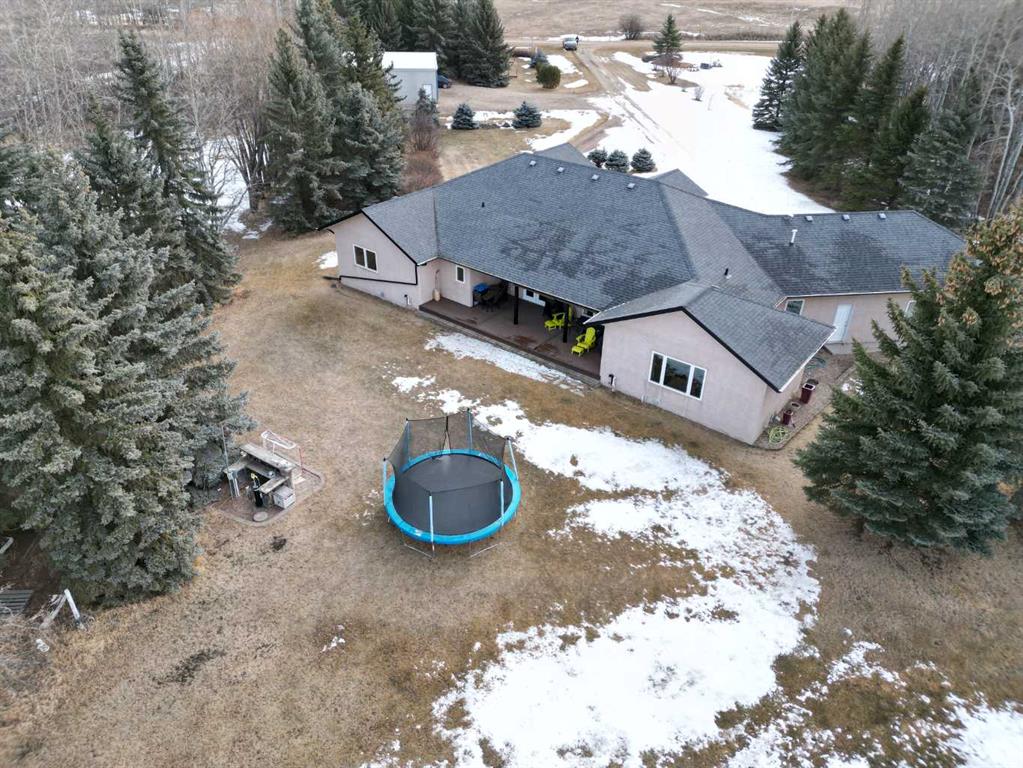 Embrace a life of luxury and convenience in this meticulously designed 3114 sq. ft. masterpiece. As you step through the threshold, you'll be captivated by the seamless flow of the open-concept living spaces, where natural light dances across gleaming hardwood floors. Featuring sleek stainless steel appliances, ample cabinetry, and a spacious island perfect for casual dining or entertaining. Unwind in the inviting living room, where large windows frame picturesque views of the surrounding landscape. The dining area provides an elegant setting for memorable family gatherings or intimate dinner parties. Retreat to the sumptuous primary bedroom, a true sanctuary, complete with an ensuite bathroom and walk in closet. Three additional bedrooms offer comfort and privacy for family or guests, while the den/home office home office provides the ideal space for remote work or pursuing your passions. Throughout the home, you'll find thoughtful touches like recessed lighting, ceiling fans, and custom window treatments that elevate the overall ambiance. The media room is set up with its own wet bar, perfect for hosting movie nights or entertaining. This single-story layout ensures easy accessibility and flow, making it perfect for those seeking a low-maintenance lifestyle without compromising on space or style. Located in the desirable Stettler County on 3.97 acres, this property offers the perfect balance of rural tranquility and modern convenience. The 34X25 attached garage gives ample room for indoor parking. If that wasn't enough, the cold storage shop 28X40 allows lots of room for toys and acreage equipment! Enjoy the summer nights with a private fire pit and seating area. Don't miss this opportunity to make your dream home a reality.