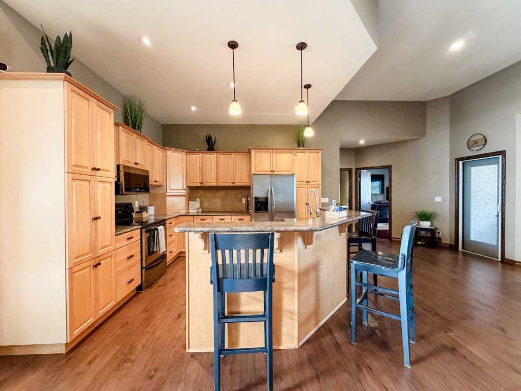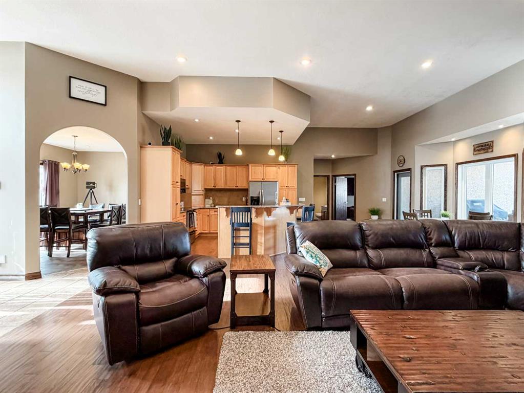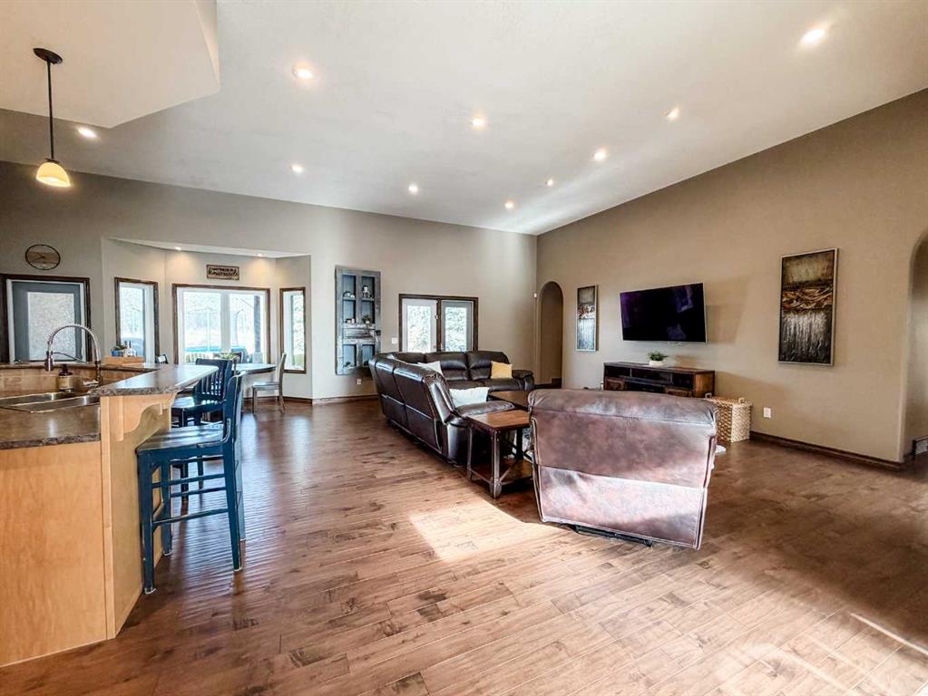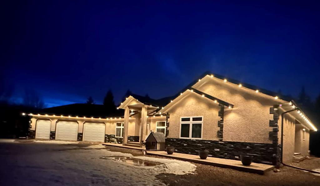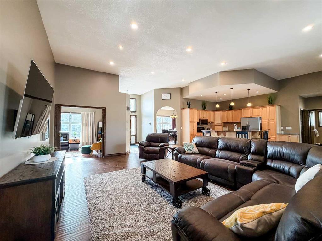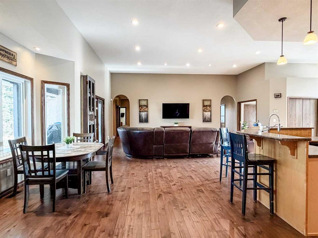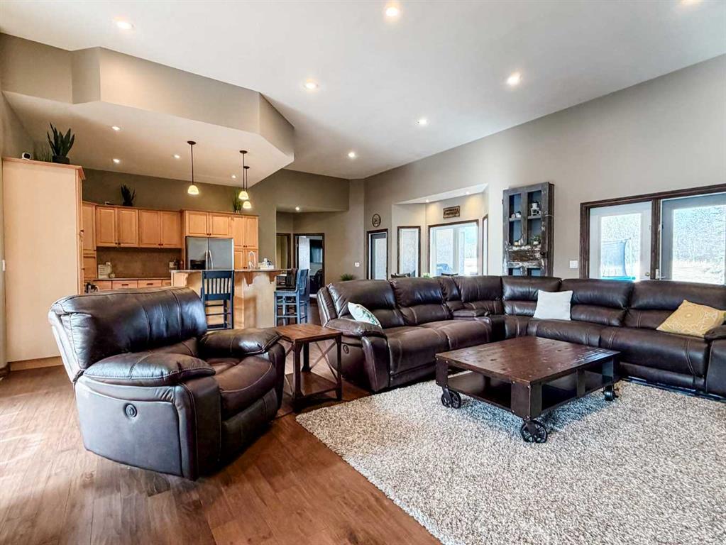 Embrace a life of luxury and convenience in this meticulously designed 3114 sq. ft. masterpiece. As you step through the threshold, you'll be captivated by the seamless flow of the open-concept living spaces, where natural light dances across gleaming hardwood floors. Featuring sleek stainless steel appliances, ample cabinetry, and a spacious island perfect for casual dining or entertaining. Unwind in the inviting living room, where large windows frame picturesque views of the surrounding landscape. The dining area provides an elegant setting for memorable family gatherings or intimate dinner parties. Retreat to the sumptuous primary bedroom, a true sanctuary, complete with an ensuite bathroom and walk in closet. Three additional bedrooms offer comfort and privacy for family or guests, while the den/home office home office provides the ideal space for remote work or pursuing your passions. Throughout the home, you'll find thoughtful touches like recessed lighting, ceiling fans, and custom window treatments that elevate the overall ambiance. The media room is set up with its own wet bar, perfect for hosting movie nights or entertaining. This single-story layout ensures easy accessibility and flow, making it perfect for those seeking a low-maintenance lifestyle without compromising on space or style. Located in the desirable Stettler County on 3.97 acres, this property offers the perfect balance of rural tranquility and modern convenience. The 34X25 attached garage gives ample room for indoor parking. If that wasn't enough, the cold storage shop 28X40 allows lots of room for toys and acreage equipment! Enjoy the summer nights with a private fire pit and seating area. Don't miss this opportunity to make your dream home a reality.