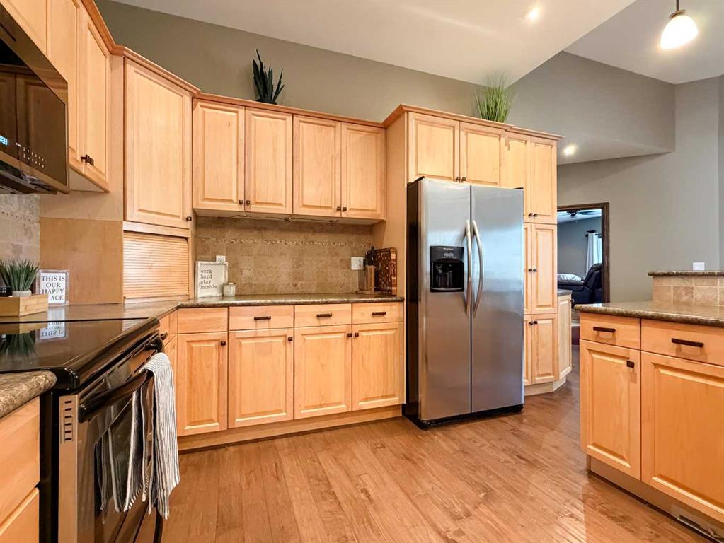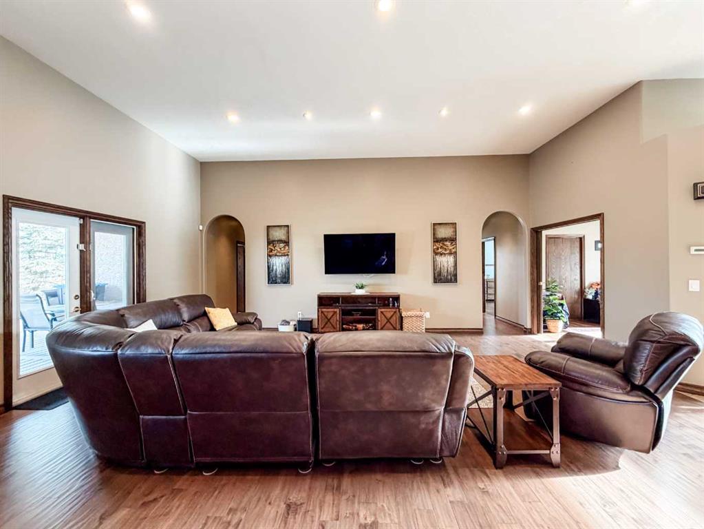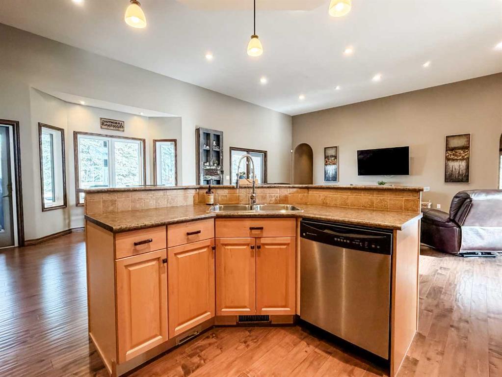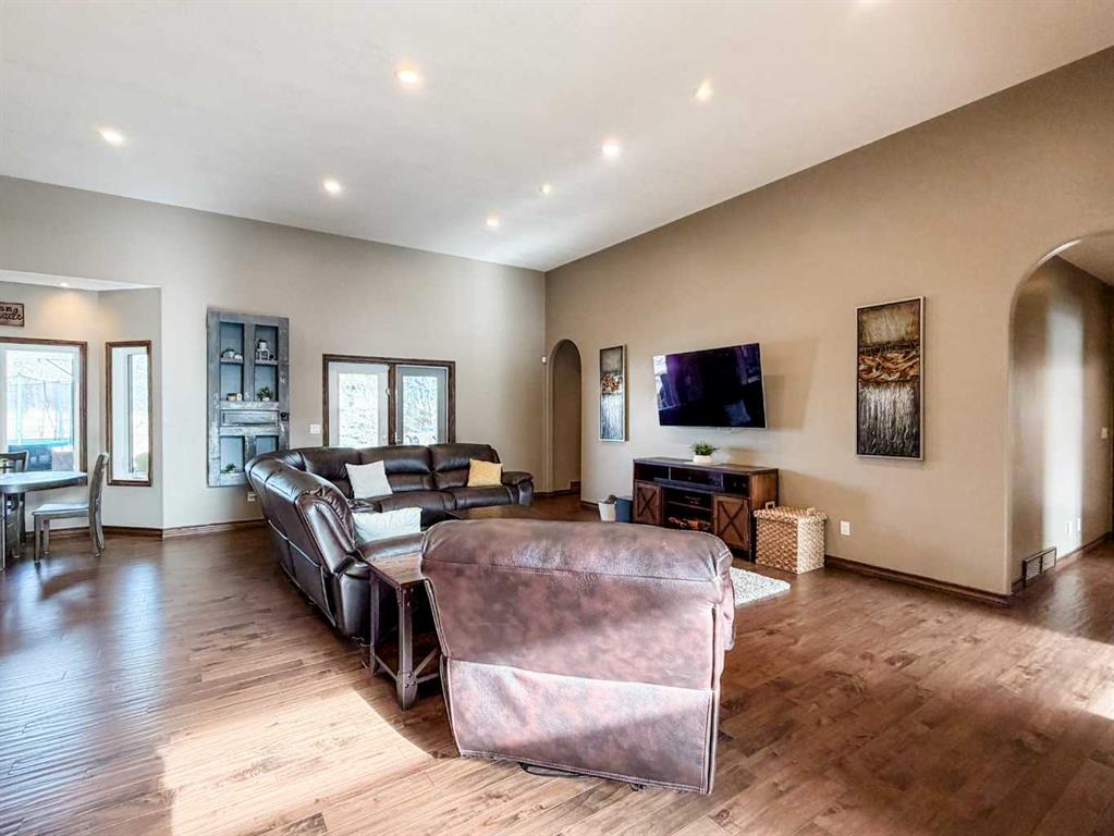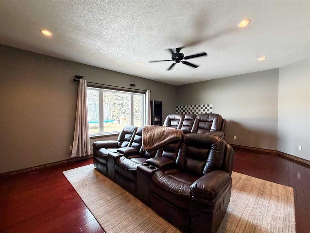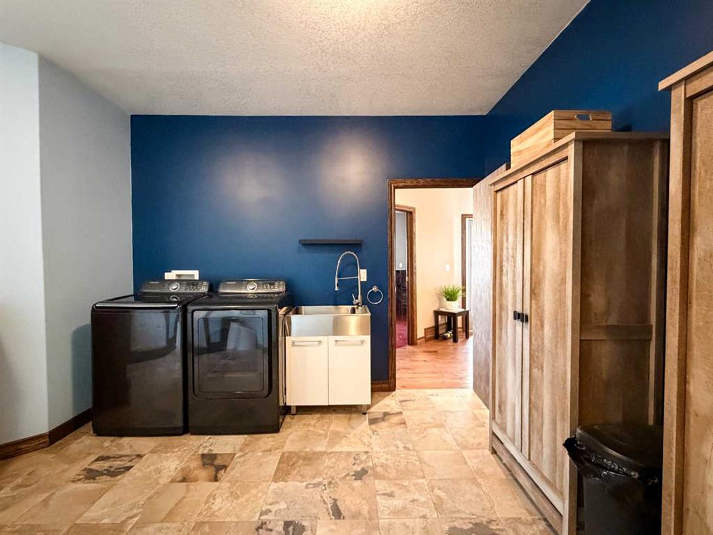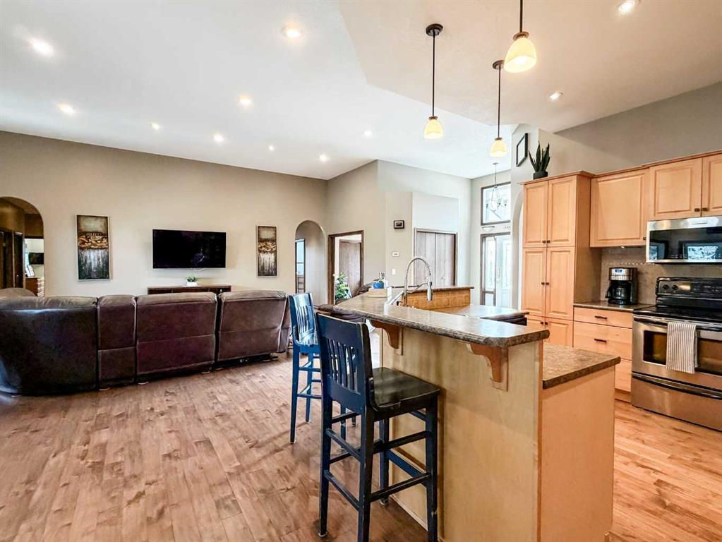 Embrace a life of luxury and convenience in this meticulously designed 3114 sq. ft. masterpiece. As you step through the threshold, you'll be captivated by the seamless flow of the open-concept living spaces, where natural light dances across gleaming hardwood floors. Featuring sleek stainless steel appliances, ample cabinetry, and a spacious island perfect for casual dining or entertaining. Unwind in the inviting living room, where large windows frame picturesque views of the surrounding landscape. The dining area provides an elegant setting for memorable family gatherings or intimate dinner parties. Retreat to the sumptuous primary bedroom, a true sanctuary, complete with an ensuite bathroom and walk in closet. Three additional bedrooms offer comfort and privacy for family or guests, while the den/home office home office provides the ideal space for remote work or pursuing your passions. Throughout the home, you'll find thoughtful touches like recessed lighting, ceiling fans, and custom window treatments that elevate the overall ambiance. The media room is set up with its own wet bar, perfect for hosting movie nights or entertaining. This single-story layout ensures easy accessibility and flow, making it perfect for those seeking a low-maintenance lifestyle without compromising on space or style. Located in the desirable Stettler County on 3.97 acres, this property offers the perfect balance of rural tranquility and modern convenience. The 34X25 attached garage gives ample room for indoor parking. If that wasn't enough, the cold storage shop 28X40 allows lots of room for toys and acreage equipment! Enjoy the summer nights with a private fire pit and seating area. Don't miss this opportunity to make your dream home a reality.