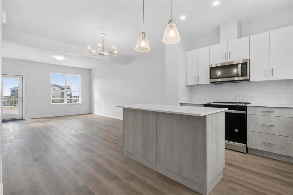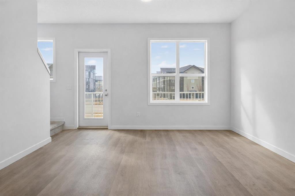 Welcome to this beautifully appointed 3-bedroom, 2.5-bathroom townhome in the highly sought-after community of Redstone. Featuring low condo fees, a double attached garage, and a versatile den/office that can easily serve as a fourth bedroom, this home offers both comfort and exceptional value. The main floor showcases an open-concept design with soaring ceilings, luxury vinyl plank flooring, and expansive windows that fill the space with natural light. The kitchen is a true highlight, thoughtfully designed with upgraded stainless-steel appliances, quartz countertops, custom white cabinetry, a spacious pantry, and a functional central island with a breakfast bar. It seamlessly overlooks the dining area and bright living room, which opens onto a sunny south-facing balcony—perfect for relaxing or entertaining. Upstairs, the generous primary bedroom features a walk-in closet and a private 4-piece ensuite. Two additional well-sized bedrooms, a second 4-piece bathroom, and a convenient laundry area complete the upper level. The ground floor offers a welcoming front entrance, a flexible den/office space, and direct access to the double attached garage with side-by-side parking. Ideally located near schools, parks, shopping, restaurants, public transit, and with quick access to major roadways, this home truly combines style, functionality, and convenience. A must-see home provides maintenance-free living with low condo fees, perfect for investors or first-time buyers. Don't miss out & Book your showing today!