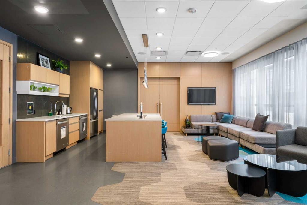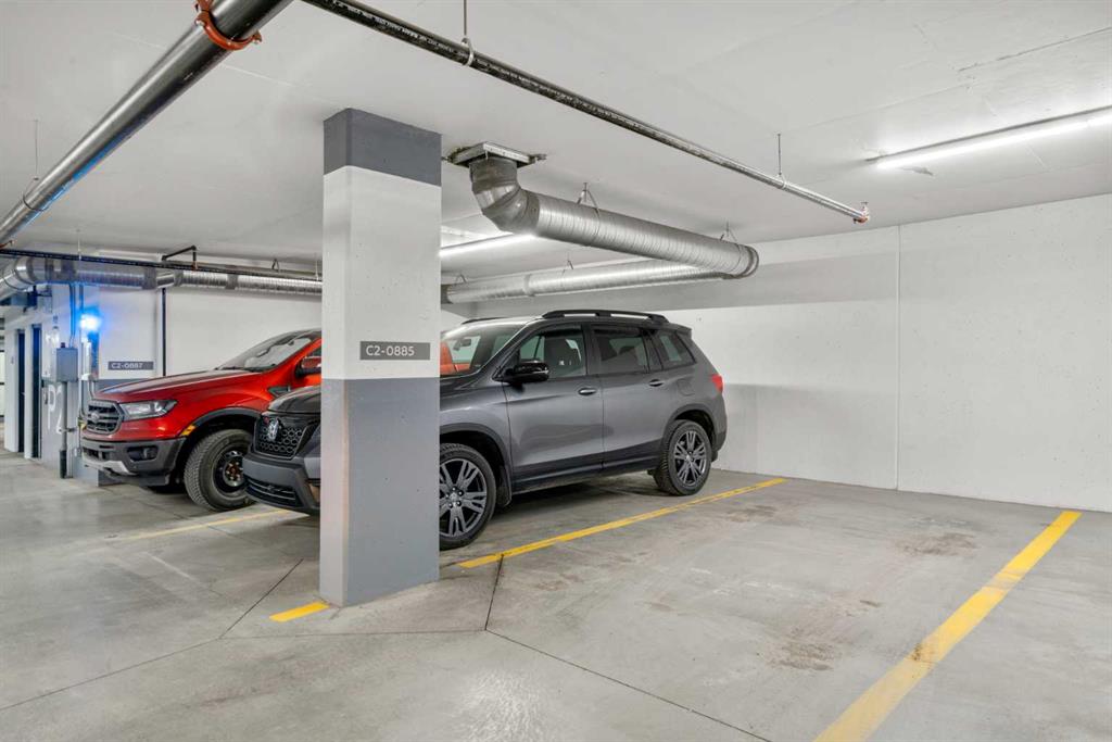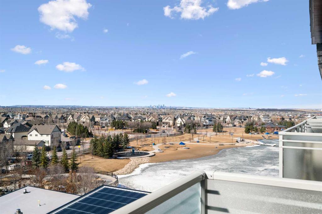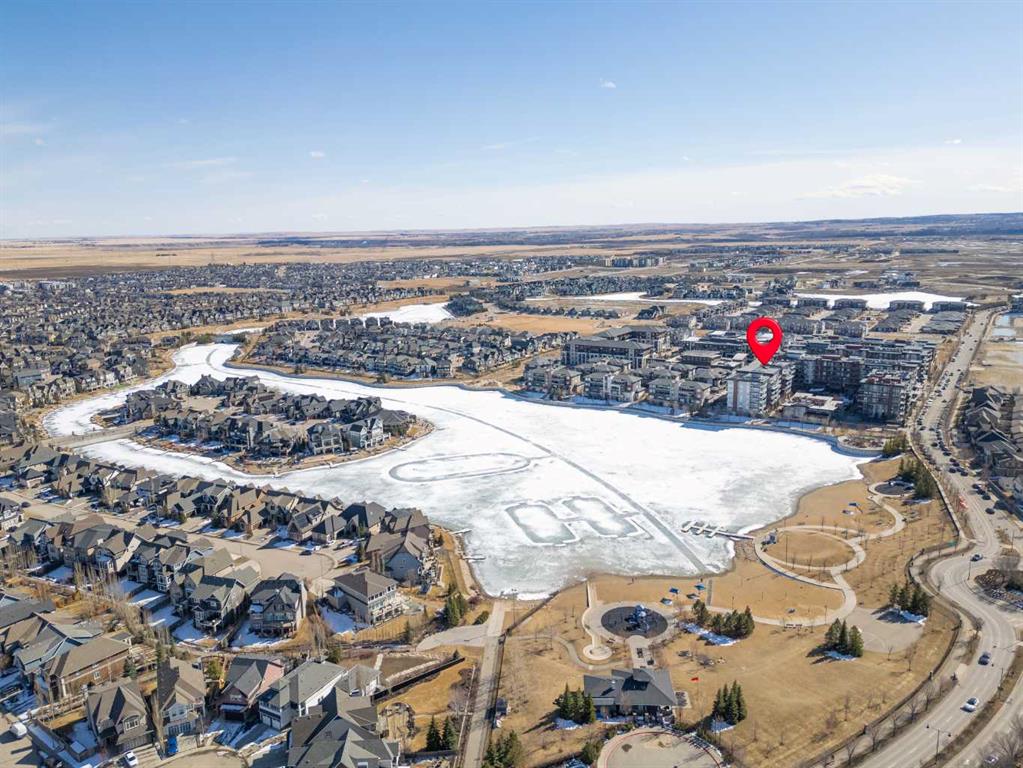 Elevated lake living meets panoramic skyline views in this rare top-floor residence at Westman Village in Mahogany. Positioned at the top of the building with soaring ceilings and expansive west exposure, this executive two-bedroom, two-bathroom luxury condo captures unobstructed mountain, lake, and downtown skyline views — a vantage point seldom available in Calgary’s condominium market. The elevated ceiling height enhances the sense of space while natural light pours through expansive windows, creating a bright and refined living environment. Top-floor positioning further enhances privacy and delivers uninterrupted sightlines that define the home’s living experience. Proudly offered by the original owner and meticulously maintained, this residence features an upgraded kitchen package with premium appliances, stone countertops, enhanced cabinetry, and a rare wrap-around U-shaped kitchen peninsula island — a highly functional layout that significantly expands prep space and creates a natural gathering area rarely found in comparable units. The open-concept design flows seamlessly through the dining and living areas and out to a private covered balcony, where sweeping sunset views stretch from the Rocky Mountains across the lake to Calgary’s skyline. The primary suite offers generous proportions, a customized walk-through closet with built-in organization, and remote-operated blackout blinds for added comfort and privacy. The ensuite is well-appointed with upgraded finishes, while the second bedroom and full bathroom provide flexibility for guests, a home office, or downsizing without compromise. Additional highlights include luxury vinyl plank flooring throughout (no carpet), a thoughtfully designed in-suite laundry space with built-in storage, central air conditioning, triple-pane windows, secure concrete construction, and two titled underground heated parking stalls. Westman Village offers one of Calgary’s most comprehensive private lifestyle environments, with full-service amenities including fitness facilities, wellness areas, social spaces, and premium features such as a wine vault, hot tubs, and steam rooms — all within the building. The complex is pet-friendly and designed for a highly connected, maintenance-free lifestyle. As a resident of Mahogany, you’ll also enjoy access to the private Mahogany Beach House, offering year-round recreational opportunities including lake access, paddleboarding, skating, fitness programming, and community events — delivering a true four-season lake lifestyle just steps from your door. This is more than a condominium — it is a top-floor, view-driven luxury residence with rare design features and double titled parking within one of Calgary’s most sought-after resort-style developments.
