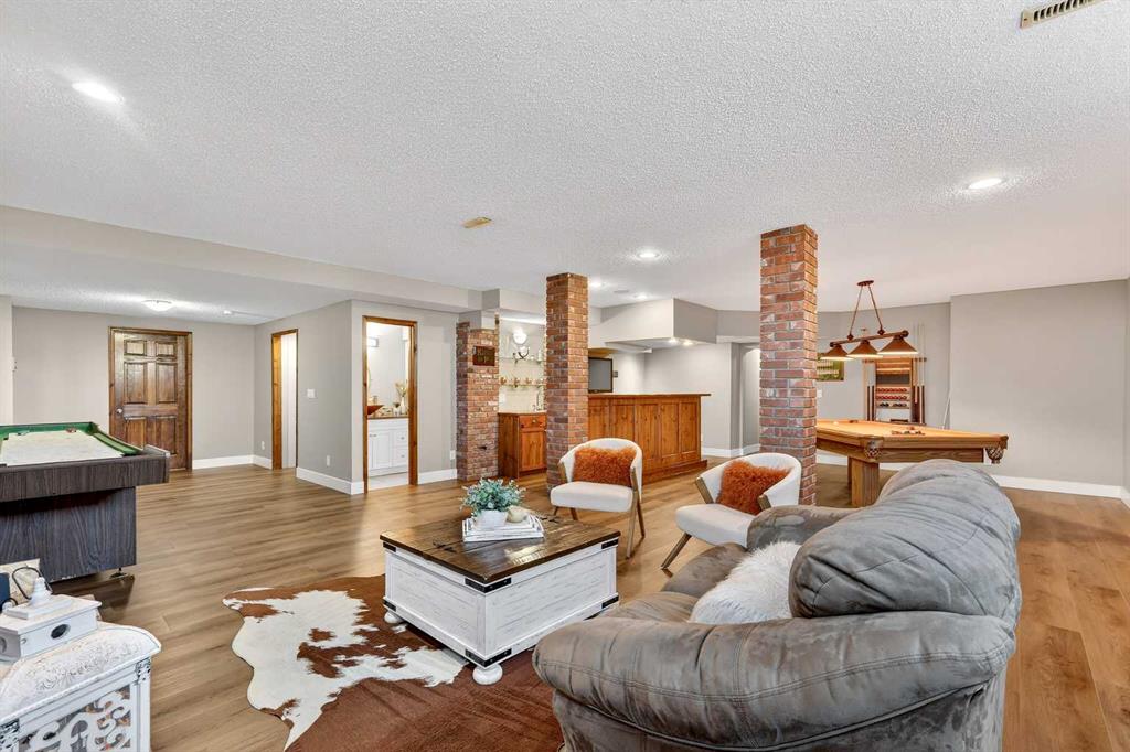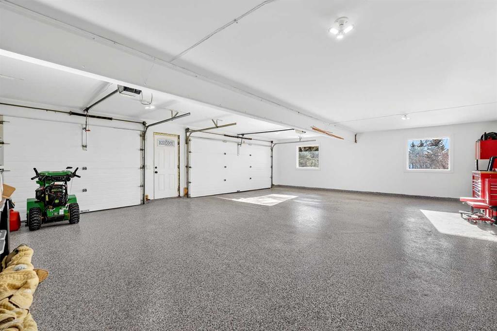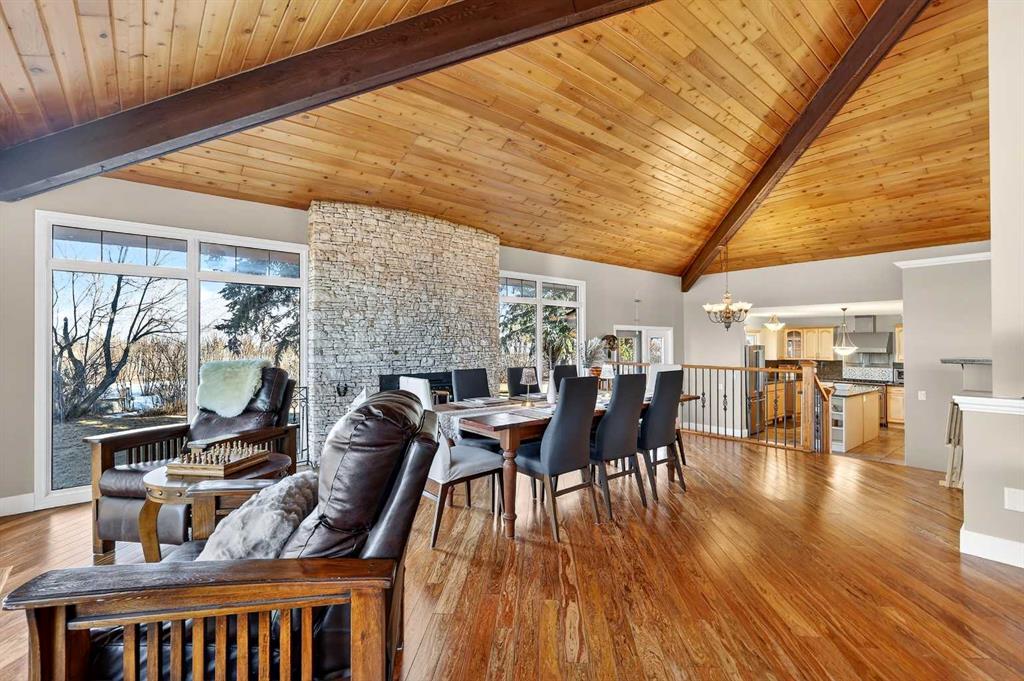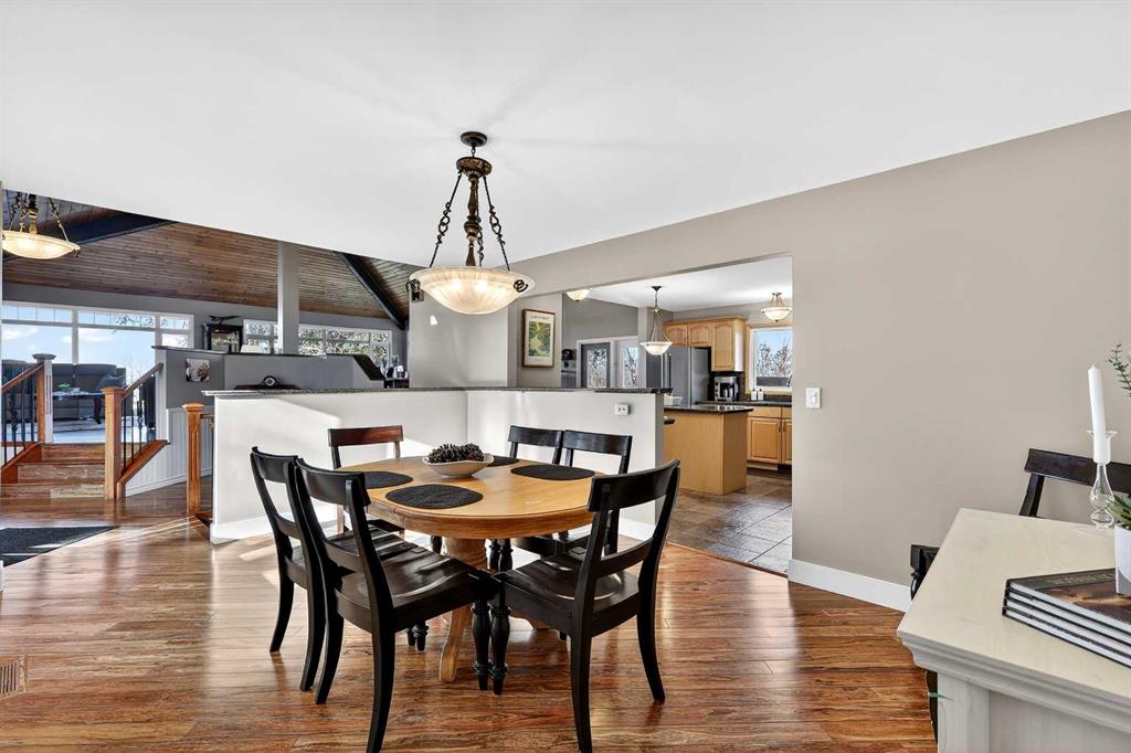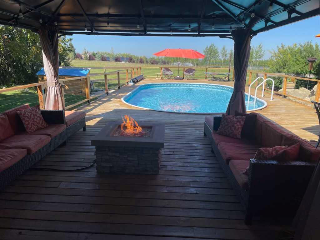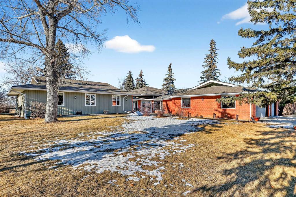 Welcome to an exceptional lifestyle property in the sought-after Red Deer Lake area, just minutes from Spruce Meadows and a short 5 minute drive to the amenities of Calgary. This beautifully maintained ranch-style home offers the perfect balance of peaceful country living and everyday convenience, making it ideal for families, professionals, and anyone seeking space, privacy, and long-term value. Designed for both comfort and functionality, the main level features four spacious bedrooms, including a private primary retreat with a spa-inspired ensuite complete with rain shower and generous walk-in closet. Thoughtful finishes such as hardwood flooring, vaulted ceilings, and quality fixtures create a warm yet refined atmosphere throughout the main living spaces. The bright, open layout connects the upgraded kitchen, dining area, and living room, making it equally suited for entertaining or relaxed daily living. The freshly updated lower level expands your lifestyle possibilities with luxury vinyl plank flooring, a full bathroom, wet bar, games area, hobby room, and extensive storage including a cold room and wine cellar, ideal for entertaining, recreation, or multigenerational flexibility. Outdoors, the property truly shines as a private retreat. Enjoy gorgeous mountain views, a semi-inground gas-heated pool, multiple patios, a gazebo with fire pit, low-maintenance landscaping, and plenty of room for play, gatherings, or quiet evenings under the sky with the Rocky Mountains as your backdrop! Families will appreciate the dedicated play structure and even a covered school bus shelter at the driveway for added convenience. Car enthusiasts, hobbyists, or business owners will recognize the exceptional value of the heated oversized triple garage with epoxy floors and workspace, plus a separate single garage perfect for equipment, storage, or projects. A renovated mudroom with lockers and direct garage access keeps daily life organized and efficient. Set in a tranquil setting only minutes to groceries, medical services, and daily essentials, this property delivers the rare combination of rural serenity, functional space, and city accessibility. With extensive upgrades already completed and pride of ownership evident throughout, this is more than a home… it’s a lifestyle opportunity in one of the region’s most desirable country residential communities.