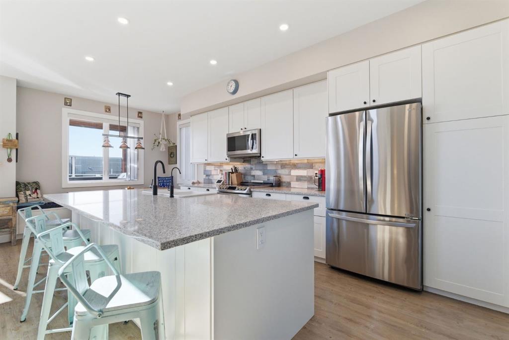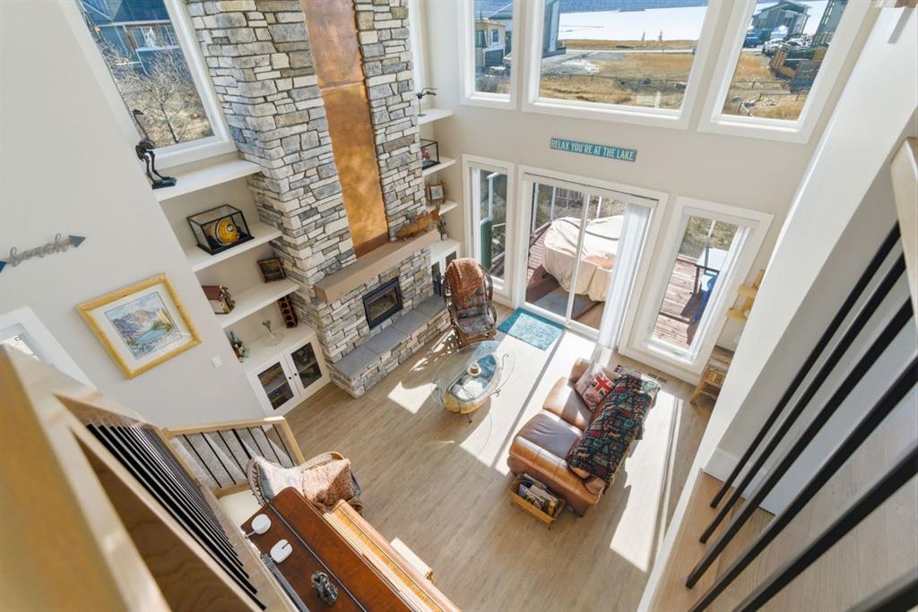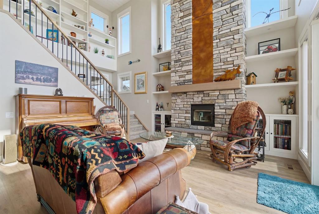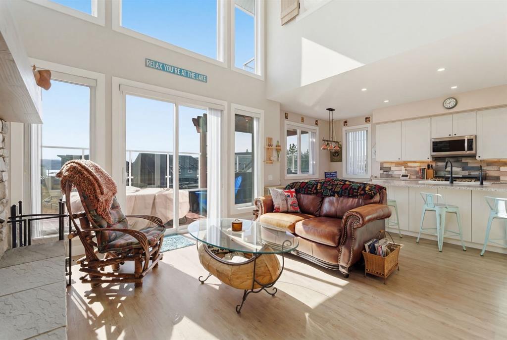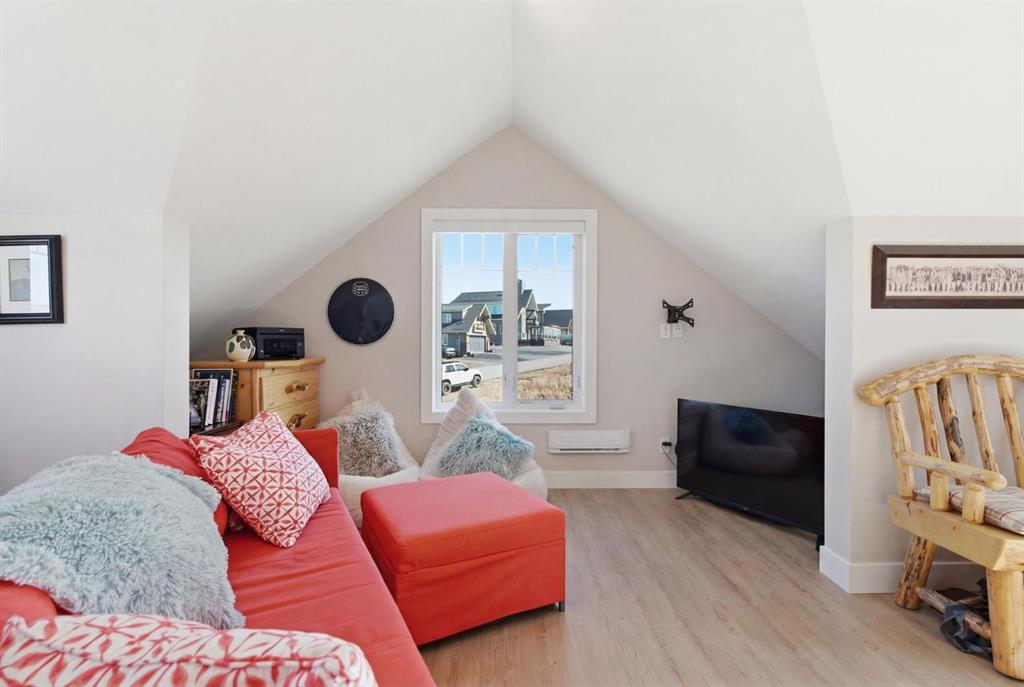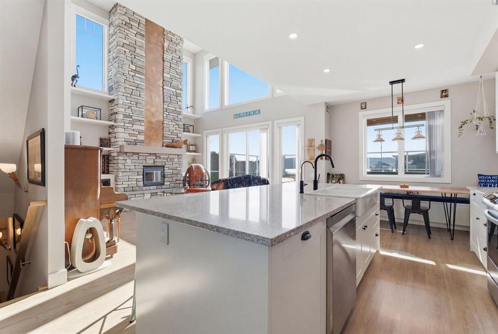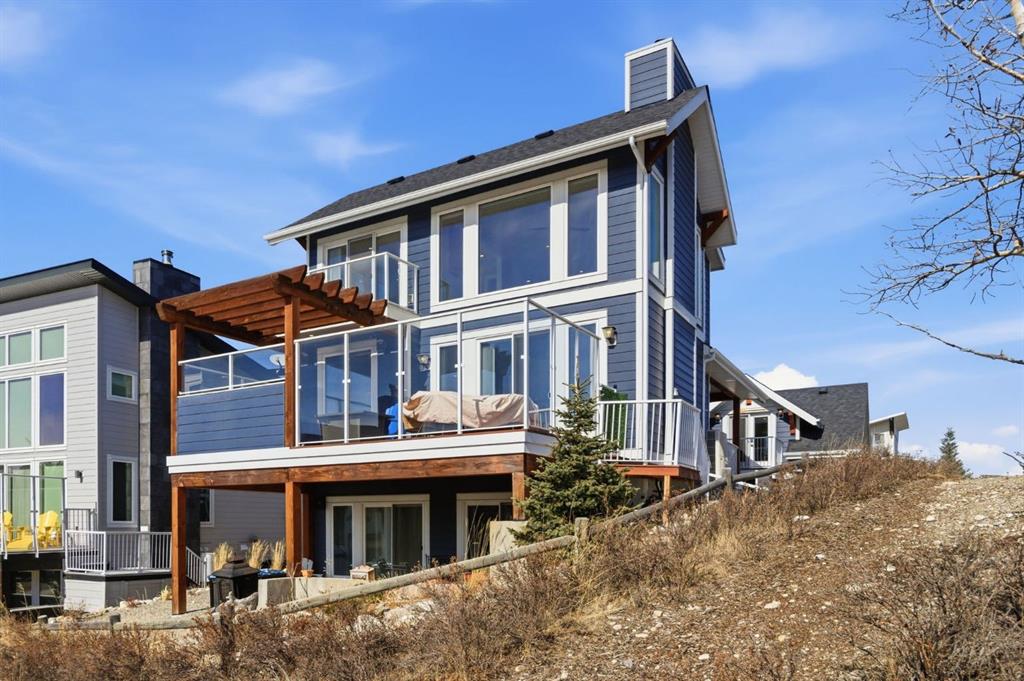 Welcome to CottageClub at Ghost Lake—where lake living meets mountain views and every day feels like an escape. Just minutes from Cochrane and an easy drive from Calgary, this vibrant, amenity-rich community offers the perfect balance of weekend retreat and full-time living. Built by Aura Quality Homes, this fully finished 1.5-storey walkout offers 2,293 of total living space and has been thoughtfully designed—offering flexibility, and highly elevated finishes throughout. Step inside and you’re immediately welcomed by an inviting entry with custom storage solutions and a stylish 2-piece bath. The heart of the home is the open-concept main living area, with soaring two-storey ceilings, a wood-burning stone fireplace with copper insert, and custom built-ins, adding both character and function. The kitchen is nothing short of impressive where attention to detail shines—from soft-close cabinetry and a stone backsplash to the oversized granite island with farmhouse sink. Added features such as a water filtration system and extensive storage space elevate both comfort and convenience. Shiplap detailing and expansive triple-pane windows bring in natural light while framing the incredible views beyond. The dining area features built-in bench seating with storage—perfect for gathering with family and friends. Step outside onto the expansive full-width deck, complete with stairs leading to the yard, creating a seamless indoor-outdoor lifestyle. Upstairs, you’ll find two versatile spaces—one is a perfect bedroom with a large walk-in closet and another ideal as a 2nd bedroom or home office—along with a 3-piece bath. A private balcony off the upper level offers a quiet place to take in the panoramic lake and mountain views. The walkout lower level is dedicated to the primary retreat, designed for relaxation with a spacious bedroom, walk-in closet, and a luxurious spa inspired 5-piece ensuite featuring in-floor heating and a glass steam shower. Barn doors allow you to create separation or maintain an open feel with a large family room. Patio doors lead directly outside, further connecting you to the natural surroundings. Laundry and additional storage complete this level. Above the double heated garage, is a bunk house with a 3-piece bath offering incredible flexibility—perfect for teens, guests, extended family, or a private workspace. This home is also equipped for modern living with smart home features, integrated network wiring, and an energy-efficient Mitsubishi Zuba heat pump providing both heating and cooling year-round. Just steps from the clubhouse, and lake access, making its location truly one of the best in the community. CottageClub is a unique community offering an unmatched lifestyle—complete with a private beach, lake access, sport courts, and walking paths. The recreation centre features a gym, indoor pool, hot tub, and library. Whether you’re looking for a weekend getaway or a full-time home, this is your opportunity to experience lake living at its finest.