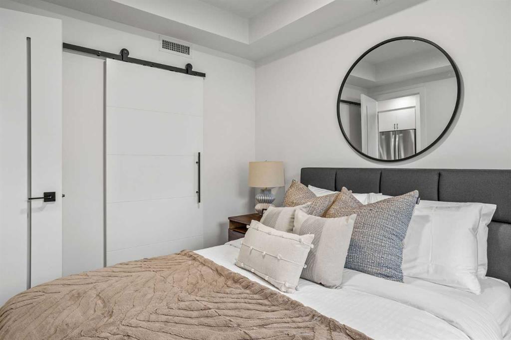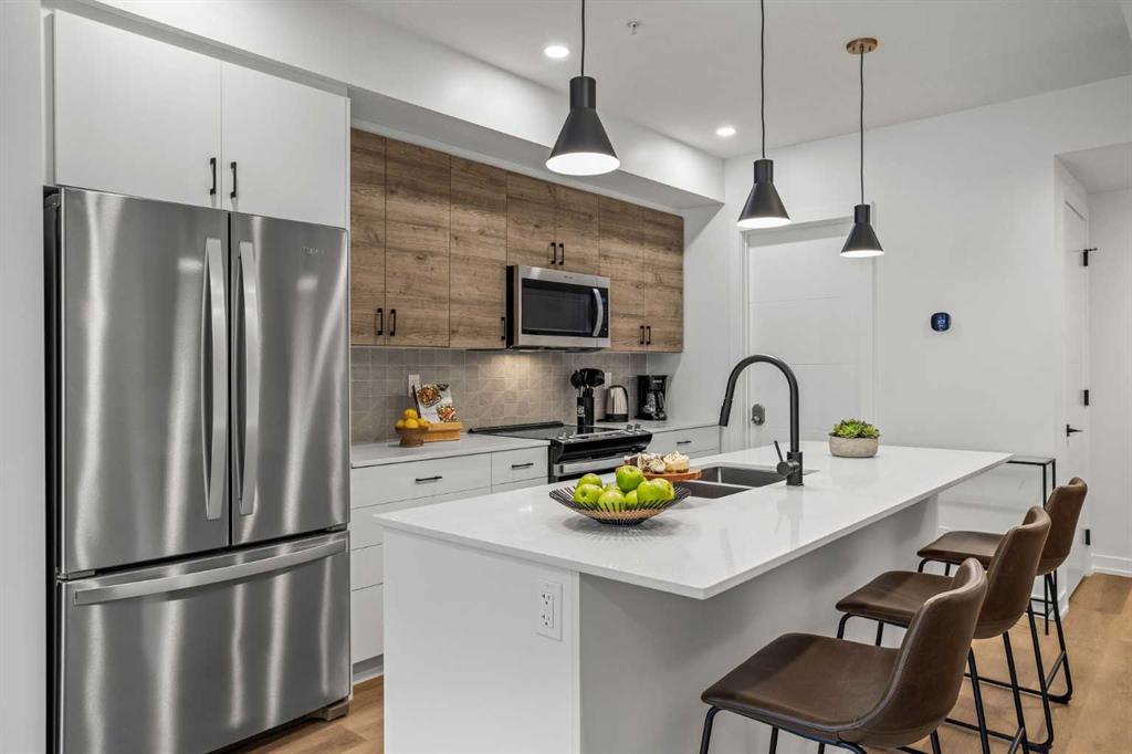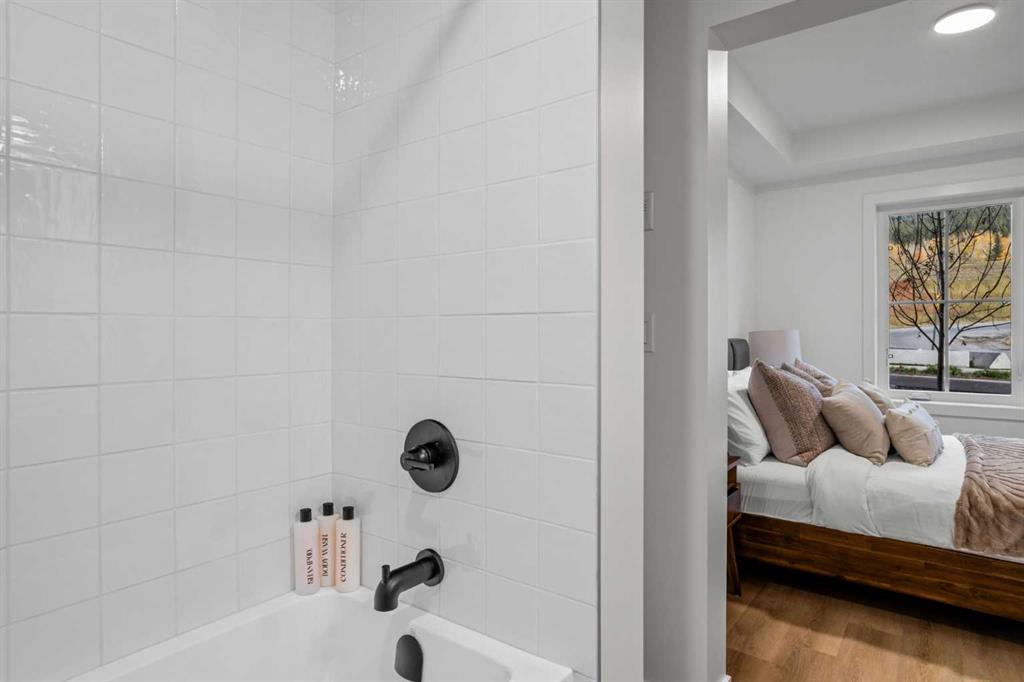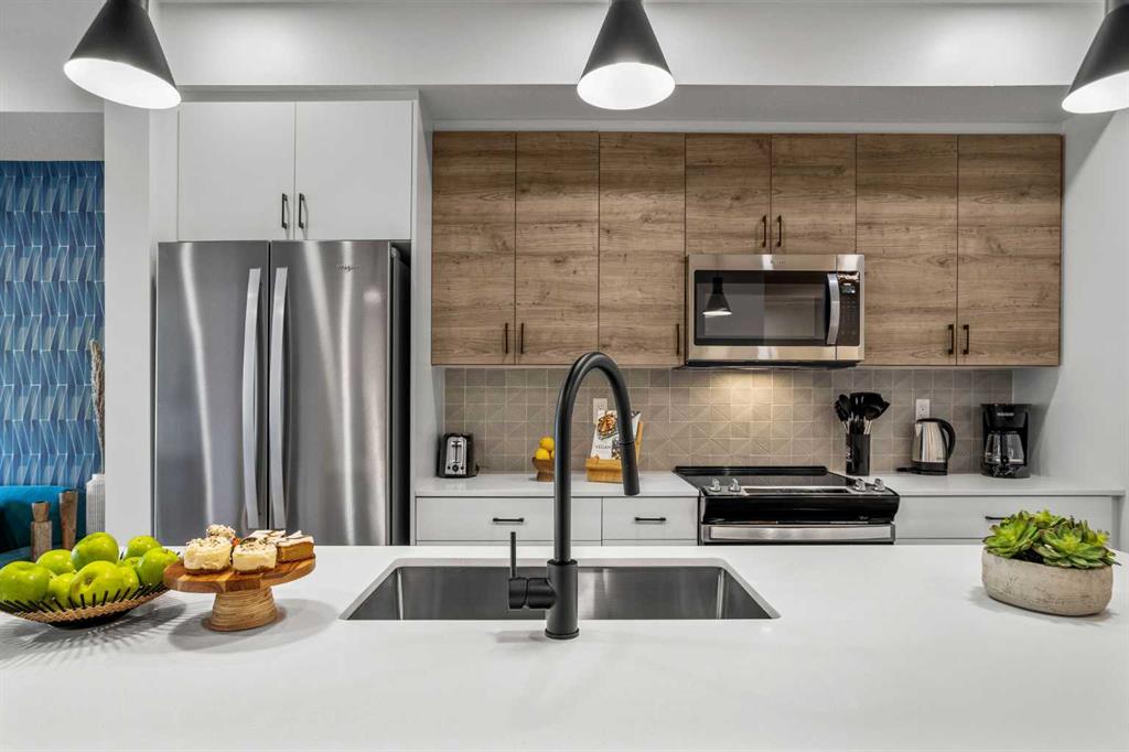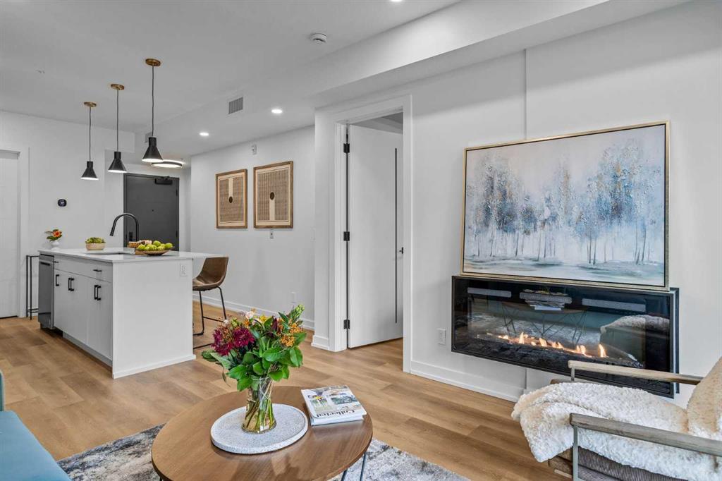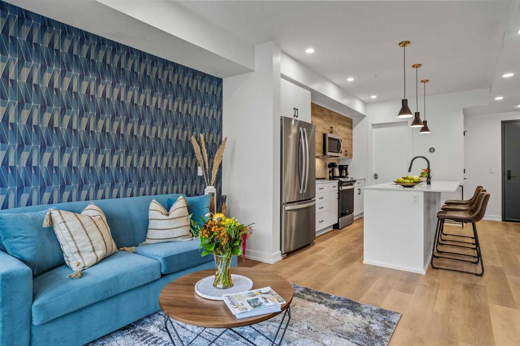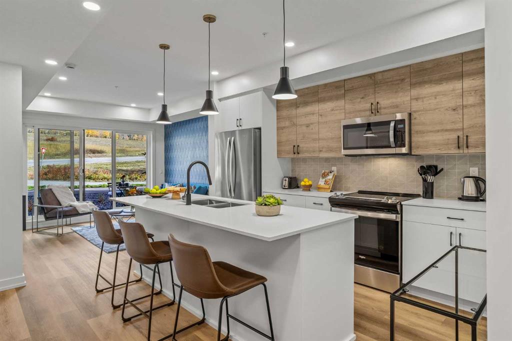 Wake up to breathtaking Rocky Mountain views in this beautifully designed one-bedroom retreat, perfectly positioned in a peaceful mountain setting. Thoughtfully designed with an open-concept layout, the home features a warm and inviting living space with large windows that fill the home with natural light. The living room offers the perfect place to unwind beside the cozy fireplace after a day exploring the mountains, while a convenient sofa bed provides additional sleeping space for guests. The modern kitchen is both stylish and functional, featuring sleek finishes, stainless steel appliances, and a spacious island. Guests will enjoy exclusive access to shared rooftop hot tubs with stunning northeastern mountain views along with a relaxing sauna, providing the ultimate alpine retreat. This unit comes fully furnished and turn-key ready, making it an incredible opportunity to capture Canmore's lucrative short term rental market. The list price includes GST. Consult an Accountant to discuss deferral options.