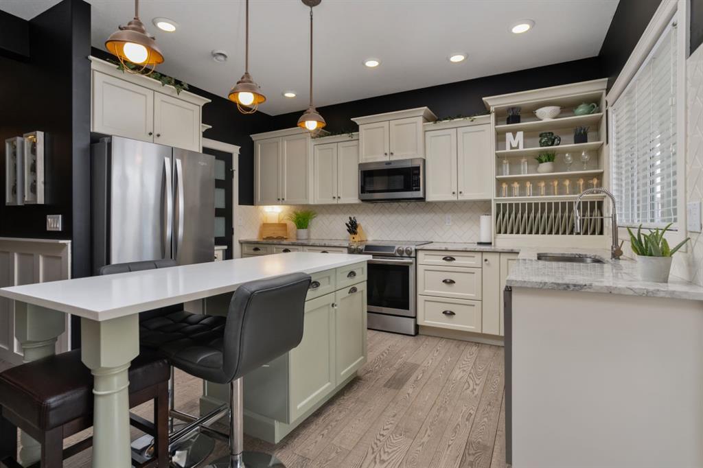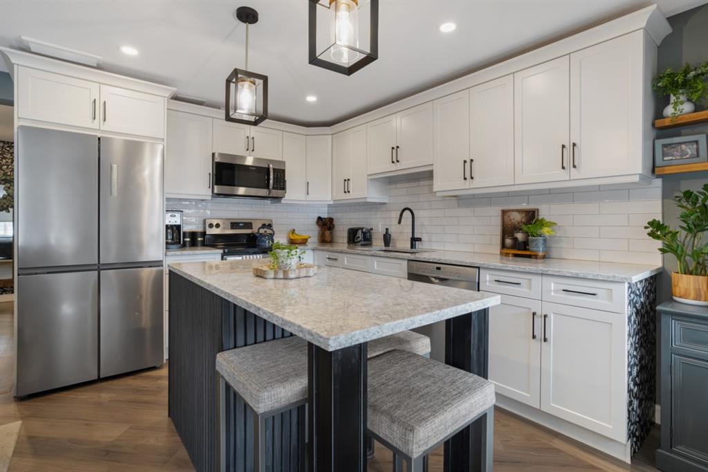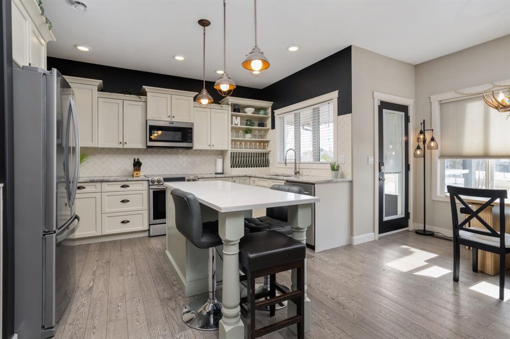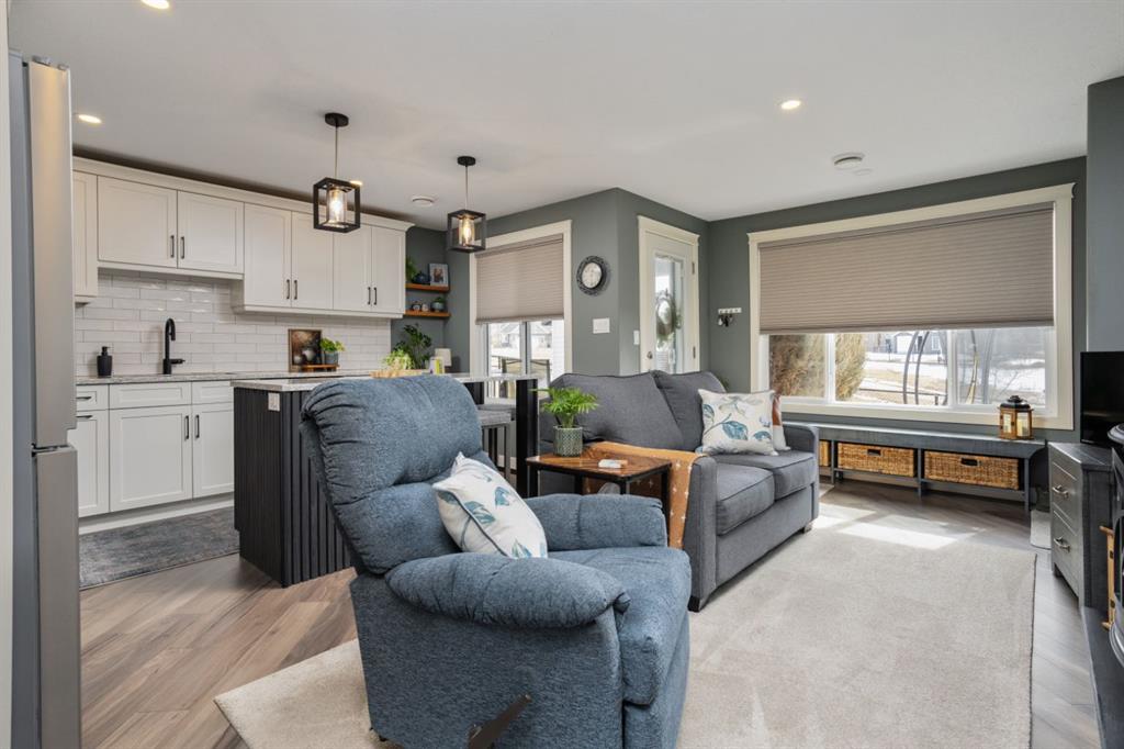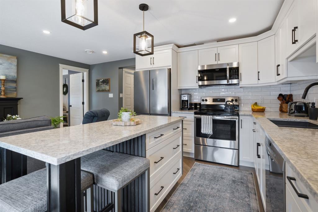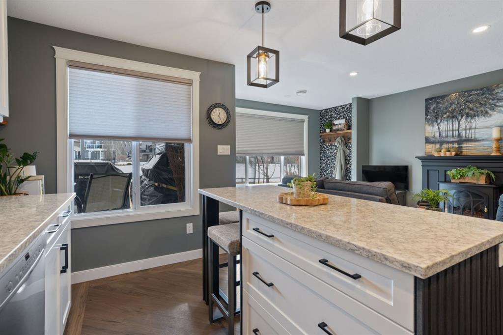 Exceptional and stunning 2,244 sq ft custom walkout two-story home, perfectly positioned backing onto green space, a nearby park, and scenic walking trails. Ideal for nature lovers and outdoor enthusiasts. Step inside to warm hardwood floors flowing seamlessly throughout the main level, elegant wainscoting, and a sophisticated flex room framed by frosted French doors-perfect for a home office, den, or quiet retreat. The heart of the home is the remarkable kitchen, boasting granite and quartz countertops, maple cabinets with soft-close drawers, a generous island, stainless steel appliances, and an exceptional walk-through pantry for effortless organization and entertaining. Adjacent, a unique coffee bar adds character and functionality, flowing into a cozy living room and a bright dining area with garden door opening to your covered deck-ideal for year-round outdoor enjoyment. Upstairs, retreat to an impressive primary suite featuring a luxurious 5-piece ensuite with heated floors, dual sinks, a spacious walk-in shower, deep soaker tub, makeup vanity, and an organized walk-in closet. A fun filled bonus room equipped with activity equipment will delight the kids and create endless play possibilities. Three additional spacious bedrooms, a 4-piece bath, and a convenient laundry room with ample cabinetry and workspace complete the upper level. The fully developed walkout basement offers independent living at its finest. Thoughtfully reconfigured by removing the stairs for a seamless, private floor plan. It includes a beautiful second kitchen with lovely cabinetry, quartz counters, stainless steel appliances, and an island. A bright family room anchored by an electric fireplace; a large primary bedroom with walk-in closet; a spare bedroom with 2-piece ensuite; dedicated laundry; and an additional 4-piece bath perfect for extended family or guests. Additional highlights include a spacious heated triple car garage with dividing wall, air conditioning, unique light fixtures, granite counters in all upper floor bathrooms, and thoughtful details throughout. This one-of-a-kind residence combines timeless craftsmanship, modern luxury, and unbeatable outdoor access!