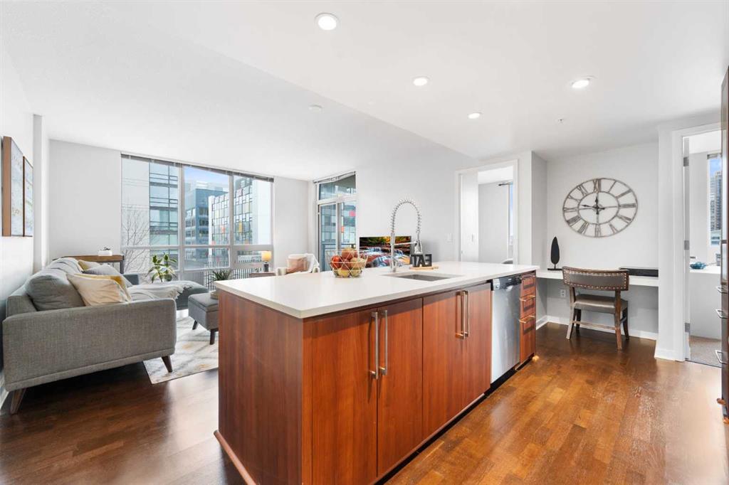 Welcome to this exceptional 2 bedroom, 2 bathroom corner unit featuring desirable west exposures, titled underground parking, in-suite laundry with additional storage, plus a separate secure storage locker. Thoughtfully designed with an inviting open-concept layout, the home is complemented by a contemporary kitchen showcasing a large central island, quartz countertops, stainless steel appliances including a gas cooktop and built-in oven, and rich wood cabinetry—perfect for both everyday living and entertaining. Floor-to-ceiling windows fill the living room and both bedrooms with an abundance of natural light. The spacious primary bedroom offers a walk-through closet and a well-appointed 4-piece ensuite complete with a deep tub and oversized vanity. The second bedroom is generously sized, making it ideal as a guest room or bright home office. Residents of Nova enjoy access to premium amenities, including a fully equipped fitness facility with separate men’s and women’s steam rooms, an owners’ lounge with wet bar, guest suites, 24-hour concierge service, and heated underground parking. Ideally located with a walk score of 92, this property is just steps from the restaurants, pubs, shops, and parks along 17th Avenue, Prince’s Island Park and Eau Claire, and only a 5-minute walk to the C-Train. Co-Op grocery store is also conveniently located just one block away. Whether you’re searching for a place to call home or a strong investment opportunity in as established building, this unit is a must-see.
