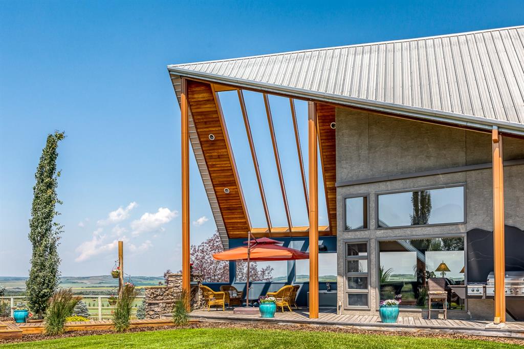 Simply spectacular this fully furnished original owner property features 5700 sq ft of developed living space. This gorgeous Jeremy Sturgess built & designed home sits on a scenic 65-acre plot just minutes west of Okotoks with the foothills framing a view of the Rockies. Reminiscent of a traditional alpine farmhouse complete with vehicle storage, stables & a tool shed all connected under a functional carriage way. The edgy design was purposeful in capturing the stunning 360-degree vistas from every room & unveils the patchwork of prairie fields rolling to meet the front ranges of the Rockies. The outdoor living space is sheltered behind the angular roof line perfectly protecting the courtyard area complete with a pavilion, hot tub, built in entertaining areas, gardens, pathways & surround sound speakers. Enter through the grand breezeway & prepare to be awed with the soaring vaulted ceilings & the cozy open/functional floor plan. On the main there are floor to ceiling windows meant to move the outside living space to the indoors & the grand stone double sided fireplace which separates the living room from the kitchen & eating spaces. Entertain in your gourmet kitchen with top-of-the-line appliances,10 ft Island, an abundance of counter & cabinet space & choose if you will dine along side the fireplace or in the Sunroom. The entire home features in-floor heat for our chilly winter nights. The private Master suite features views to the west, the pavilion & the outdoor living area. It features a luxurious ensuite, large walk-in closet & laundry. There is also a powder room & a large country mudroom to complete this level. Upstairs the 2 generous bedrooms feature work spaces with desks, Jack and Jill bathroom & one features a small tree house feel deck. Over looking the main floor past the willow handrails in the loft is a home office space, guest bedroom suite complete with living area & a full bath. At the end of the evening retreat downstairs to the Media room for a movie or entertain guests in the family/ games room. Pool, darts, poker & a cold beverage while enjoying your favorite sports on TV. The oversized triple garage has been transformed into the ultimate car enthusiast retreat with heated epoxy floors, custom cabinets & more. Outside attached through the carriage way is a heated 5 stall barn with rubber mats, waterers, loft, feed room, tack room & wash bay. There is an outdoor 125 x 250 ft sand ring for riding & all the grass & sand paddocks with shelters your horse’s hearts desire. With 55+ acres in crop and the horse paddocks newly seeded to perfect horse grass mixture the property could be close to self sustaining. The heated drive through 1500 sq ft shop has been designed to accommodate all equipment, feed, delivery trucks & supplies. Extensive irrigated landscaping allows for perfectly manicured grounds all around the home which is completely fenced with post & rail electric fencing. Simply Exquisite , just bring your suitcase and your animals !!!