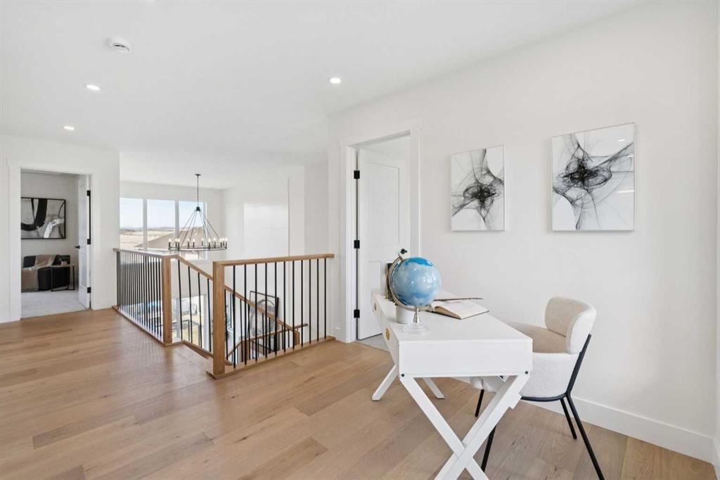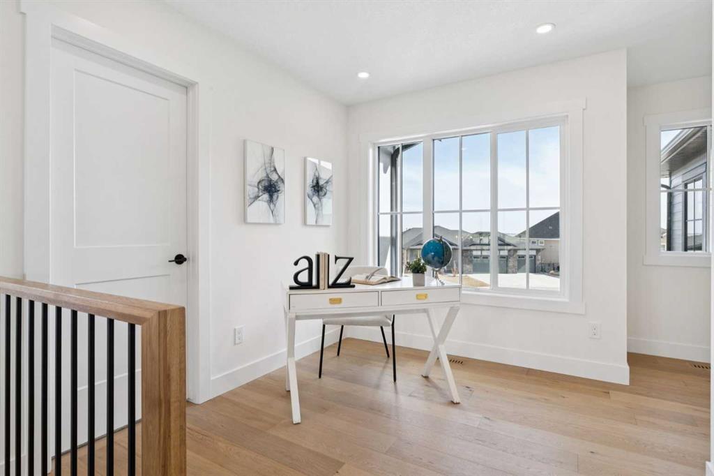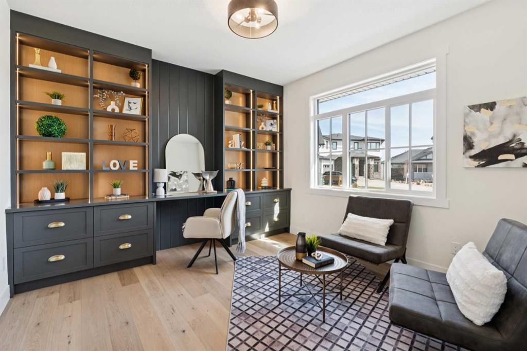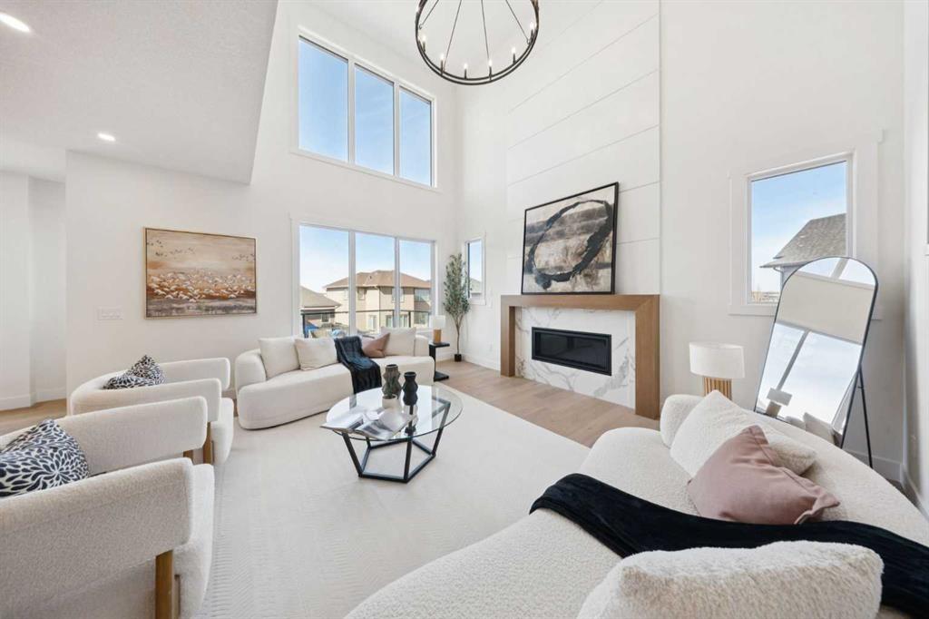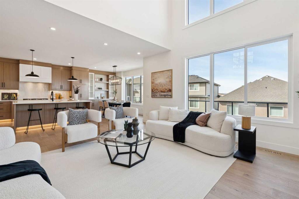 Welcome to an extraordinary walkout estate set on a premium 0.24-acre walkout lot in one of Okotoks’ most exclusive cul-de-sacs. Thoughtfully crafted, this home blends striking architectural presence with an elevated, design-driven interior—offering a truly refined luxury living experience. From the moment you enter, the home makes a lasting impression. A dramatic 17’ open-to-above great room is framed by oversized windows, flooding the space with natural light while showcasing a stunning fireplace with custom full-height millwork, and warm engineered hardwood floors. The scale, light, and craftsmanship create a sense of both grandeur and warmth rarely found. The kitchen is a true showpiece—designed to impress and built to perform. Featuring custom white oak cabinetry, quartz countertops, and a premium KitchenAid appliance package, the space is anchored by a sculptural hood fan and elevated by thoughtful details throughout. Subtle under-cabinet and toe-kick lighting enhance the ambiance, while the oversized island and adjacent dining area complete with a coffee bar create the perfect setting for both intimate dinners and large-scale entertaining. A fully built-out main floor office offers a boutique workspace with custom millwork, integrated lighting, and designer finishes—ideal for professionals working from home. The mudroom continues the elevated aesthetic with shiplap detailing, checkerboard tile flooring, champagne brass hardware, and built-in storage that blends function with style. Upstairs, the oversized primary retreat is a private sanctuary, complete with tray ceilings, designer feature wall, ambient LED lighting, and peaceful mountain views. The spa-inspired ensuite is equally refined, featuring a freestanding soaker tub, glass-encased shower, dual vanities, and warm, modern finishes that create a calming, hotel-like experience. Additional bedrooms, a bonus/media room, and a designer laundry space complete the upper level. The walkout basement remains unfinished, offering the opportunity to work directly with the builder to create a fully customized lower level tailored to your lifestyle—whether that be a home theatre, wellness space, or extended living area. Outdoor living is equally well considered, with a rear deck complete with a gas line for BBQ—perfect for entertaining while taking in the surrounding views. Positioned at one of the highest elevations in Okotoks, this home captures sweeping views of the Sheep River Valley and Rocky Mountains. The oversized, pie-shaped lot offers exceptional privacy and flexibility for future outdoor living at scale. Completed with a triple attached garage and timeless exterior finishes, this home is covered by Alberta New Home Warranty. Price includes GST. A rare opportunity to own a move-in ready estate home where design, craftsmanship, and setting come together in perfect balance.