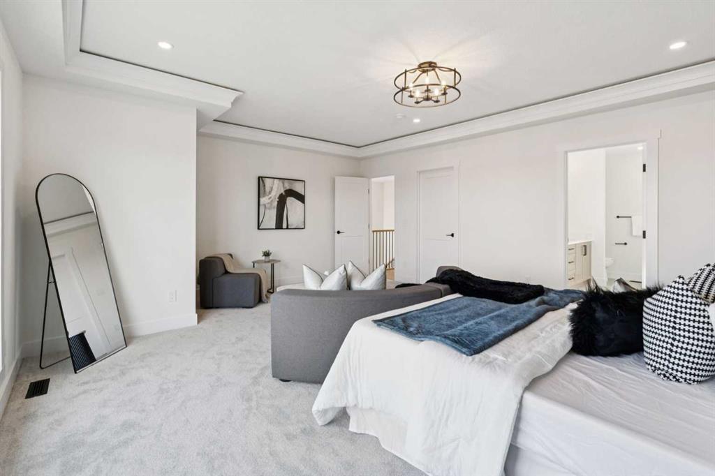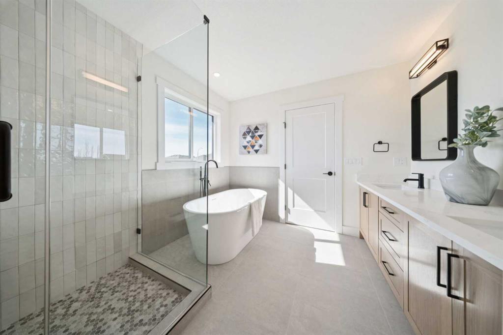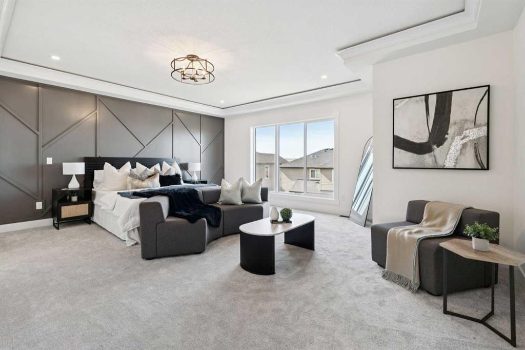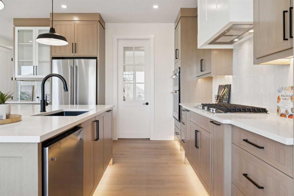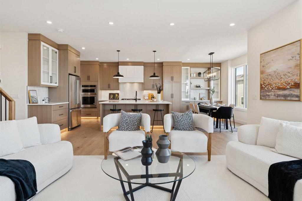 Welcome to an extraordinary walkout estate set on a premium 0.24-acre walkout lot in one of Okotoks’ most exclusive cul-de-sacs. Thoughtfully crafted, this home blends striking architectural presence with an elevated, design-driven interior—offering a truly refined luxury living experience. From the moment you enter, the home makes a lasting impression. A dramatic 17’ open-to-above great room is framed by oversized windows, flooding the space with natural light while showcasing a stunning fireplace with custom full-height millwork, and warm engineered hardwood floors. The scale, light, and craftsmanship create a sense of both grandeur and warmth rarely found. The kitchen is a true showpiece—designed to impress and built to perform. Featuring custom white oak cabinetry, quartz countertops, and a premium KitchenAid appliance package, the space is anchored by a sculptural hood fan and elevated by thoughtful details throughout. Subtle under-cabinet and toe-kick lighting enhance the ambiance, while the oversized island and adjacent dining area complete with a coffee bar create the perfect setting for both intimate dinners and large-scale entertaining. A fully built-out main floor office offers a boutique workspace with custom millwork, integrated lighting, and designer finishes—ideal for professionals working from home. The mudroom continues the elevated aesthetic with shiplap detailing, checkerboard tile flooring, champagne brass hardware, and built-in storage that blends function with style. Upstairs, the oversized primary retreat is a private sanctuary, complete with tray ceilings, designer feature wall, ambient LED lighting, and peaceful mountain views. The spa-inspired ensuite is equally refined, featuring a freestanding soaker tub, glass-encased shower, dual vanities, and warm, modern finishes that create a calming, hotel-like experience. Additional bedrooms, a bonus/media room, and a designer laundry space complete the upper level. The walkout basement remains unfinished, offering the opportunity to work directly with the builder to create a fully customized lower level tailored to your lifestyle—whether that be a home theatre, wellness space, or extended living area. Outdoor living is equally well considered, with a rear deck complete with a gas line for BBQ—perfect for entertaining while taking in the surrounding views. Positioned at one of the highest elevations in Okotoks, this home captures sweeping views of the Sheep River Valley and Rocky Mountains. The oversized, pie-shaped lot offers exceptional privacy and flexibility for future outdoor living at scale. Completed with a triple attached garage and timeless exterior finishes, this home is covered by Alberta New Home Warranty. Price includes GST. A rare opportunity to own a move-in ready estate home where design, craftsmanship, and setting come together in perfect balance.