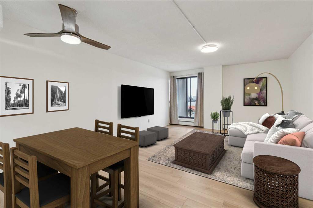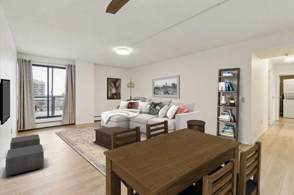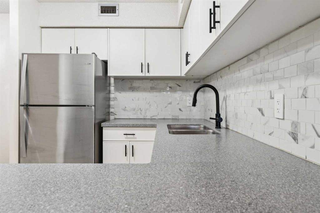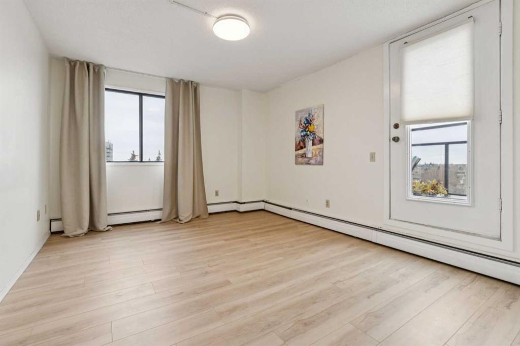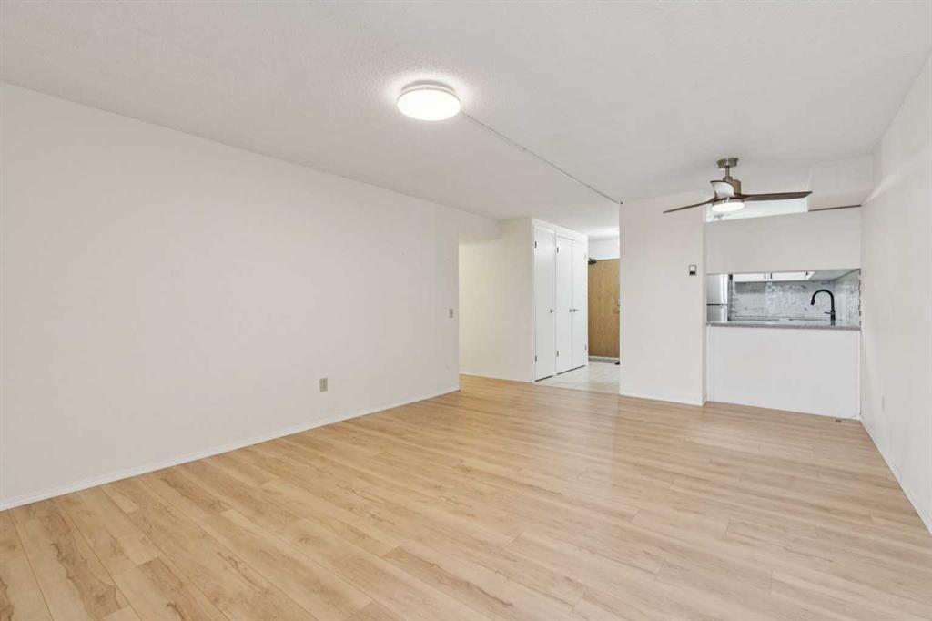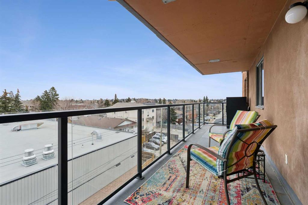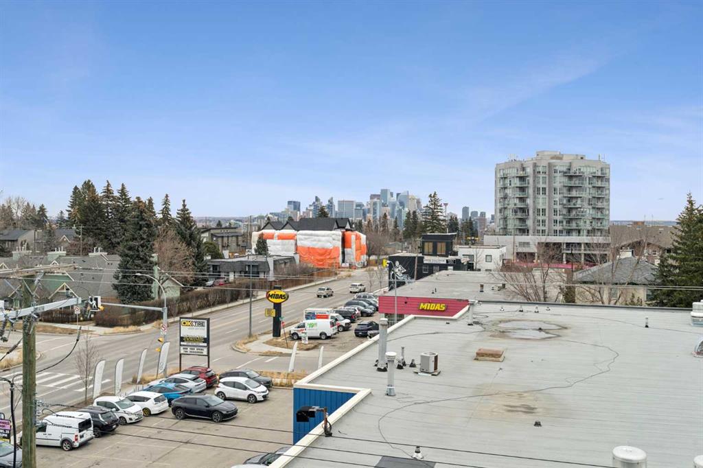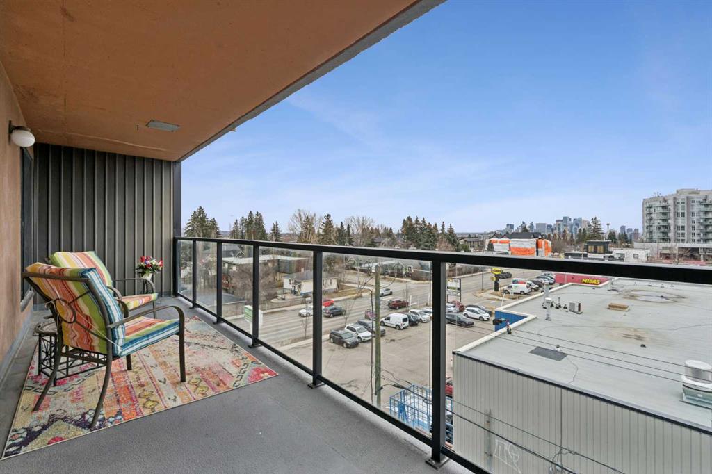 This is a large 2-bedroom, 1 bathroom, 860 SQ foot, 5th floor CORNER UNIT condo, in a concrete building, just off trendy 17th Avenue, but far enough away to enjoy the tranquility of what the Killarney community has to offer. From the TWO PRIVATE BALCONIES you will get a great look at the downtown skyline and from the other, a panoramic south view as far as the eye can see ! Between the two there is about 300 square feet of patio, with one of them catching the Calgary sunshine all day. Recently updated with a brand-new kitchen, including new cupboards, counter tops, and new S/S appliances, the 4-piece bathroom also had an impressive re-fresh, and there is new Luxury Vinyl plank flooring throughout the entire space! You will appreciate how spacious each of the bedrooms are, as they will fit virtually any size bed and bedroom furniture! The living room/ dining area are open to the kitchen and can accommodate a full-size dining table and still give you lots of options of how to place your furniture! No need to downsize in this space, in fact you may want to go buy a bigger couch ! The IN-SUITE LAUNDRY area features a full-size stackable washer & dryer and is conveniently tucked away at the end of the hallway. With only 6 floors, there will be virtually no waiting for the two elevators to take you up to your corner unit, access to the 7th floor ROOF TOP PATIO, or down to your HEATED & SECURED UNDERGROUND PARKING STALL. And if you have a special furry friend, they are most welcome with board approval. The condo fees cover heat & water, your will only need to pay for electricity ! Killarney is a wonderful community home to walking & bike pathways, parks, a community garden, outdoor courts, the Killarney pool, skating rinks, shopping, transit, and dog parks, all within walking distance ! Also close by is the Shaganappi golf course, the C-train, trendy restaurants, coffee shops, yoga studios, and more ! With easy access to Crowchild trail and Westbrook mall, you won’t have to travel far for anything ! This is inner city living without all the problems of being downtown. Wheelchair access at the front will make moving in a breeze, so what are you waiting for? Call your favorite Realtor® and come see this one soon !