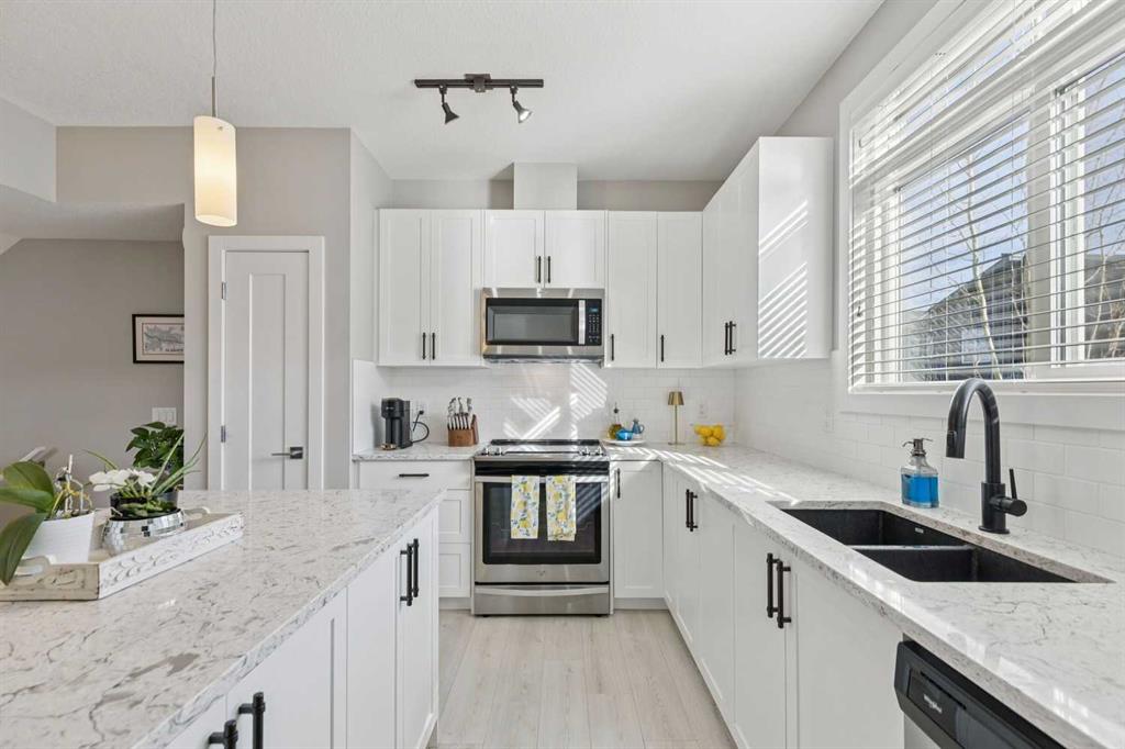 Welcome to this beautifully appointed end-unit townhome in the sought-after community of Sage Hill. As a former show home, this property showcases upgraded finishes, thoughtful design, and exceptional pride of ownership throughout. Sage Hill is one of northwest Calgary’s most desirable and rapidly growing communities, known for its scenic pathways, rolling green spaces, and convenient access to major routes like Stoney Trail and Shaganappi Trail. With an ever-expanding selection of nearby shopping, dining, and amenities, this location offers convenience and a connected outdoor lifestyle. This end-unit townhome benefits from added privacy, with only one shared wall, extra natural light, and a functional layout designed for everyday living. The open-concept main floor features durable luxury vinyl plank flooring and a beautifully designed kitchen complete with quartz countertops, timeless shaker-style cabinetry, an upgraded appliance package, and elegant pendant lighting over the island. A large adjacent dining area provides space to host family and friends, making this space ideal for both entertaining and daily living. Upstairs, you’ll find a double primary bedroom layout, with two bedrooms, each offering its own private ensuite. Convenient upper-level laundry adds to the thoughtful design, making day-to-day living that much easier for homeowners. The oversized single-attached garage is a standout feature, providing ample space for a vehicle plus a motorbike, recreational gear, or even a workshop area. A full driveway offers parking for an additional vehicle. With low condo fees and a pet-friendly complex, this home delivers incredible value in a thriving community. Whether you’re a first-time buyer, investor, or downsizer, this turnkey property is ready to impress.