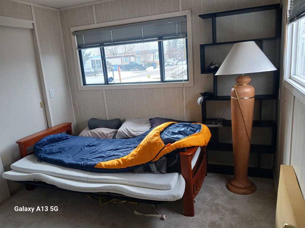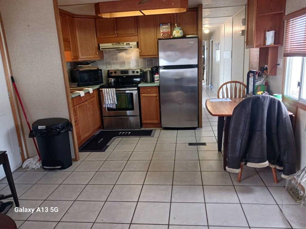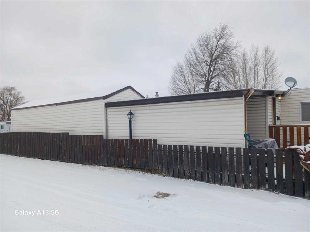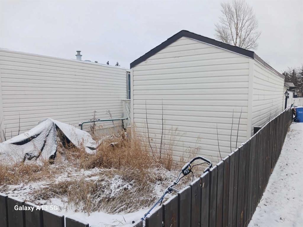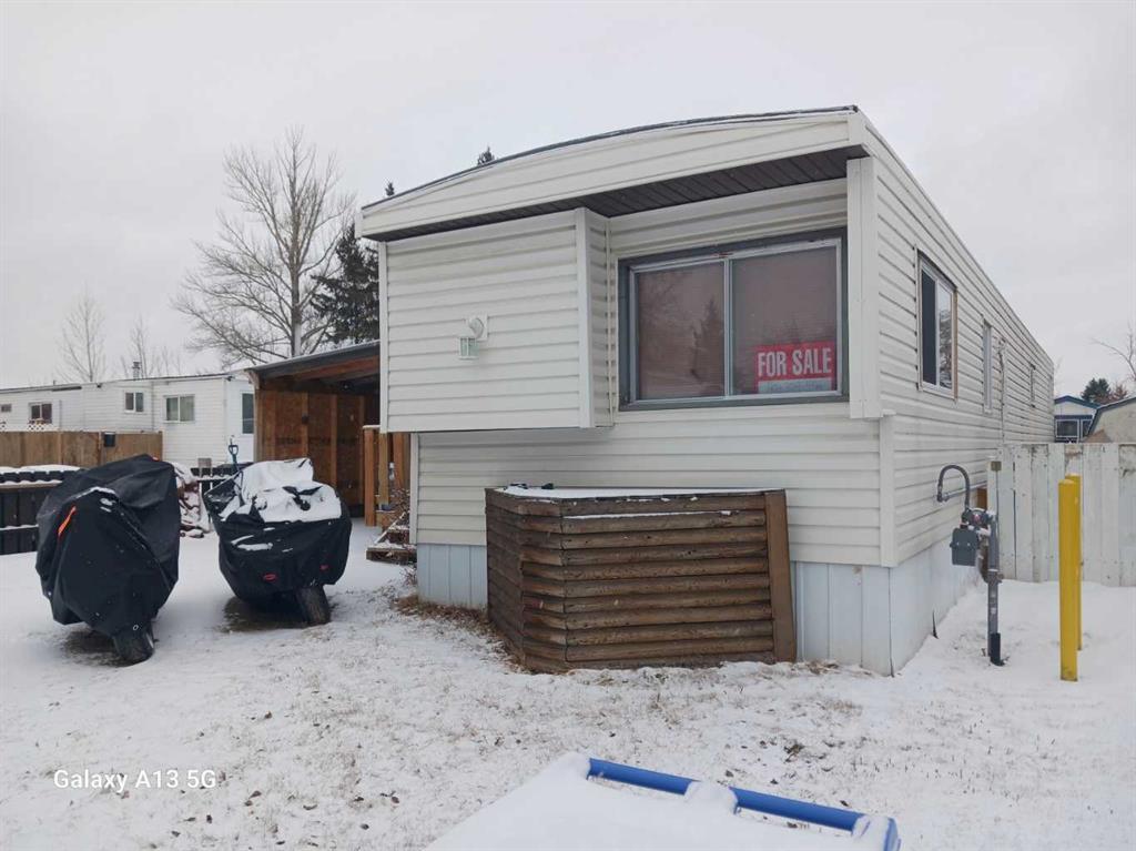 JUST FOR YOU. One bedroom home on Red Deer's north end in Mustang Acres. Renovated some time ago and offers up tiled flooring in the kitchen/dining area, and hallway. Balance of flooring is again an updated laminate in the bedroom, bath and office. Kitchen cabinets were an upgrade with adjustable shelving so you can re-jiggle where the pans go, where you can stack the dishes so it all fits best for you. Appliances are staying so you save a little money and you save a lot of time. The living room is very functionable so no need to worry about room for your relaxing sofa, recliner, foot stool and or your coffee table. Down the hall, first room on your left is a huge 13'.5" x 8'.6" office, games room or can be easily converted back to a second bedroom if the need presents itself. Office also features patio doors facing south and is perfect to access the 10' x 14' south west facing deck. Primary bedroom is at the very back of the home and it too has upgrades in regard to light fixtures and. carpet for flooring. More value in the 8' x 14'6" addition currently acting as a great entrance/porch/storage area. With the home being 692 sqft and the addition being 116 sqft now you have a total of 808 sgft all to yourself. It's going to be fantastic for you. Not only is there some open, paved parking but a 11' 6" x 16' carport to protect your ride. A GARAGE, yes, a 9'x24' detached garage for doing your thing, whether that means more cars, bikes or hobby playroom. This home is set up on a corner lot and a fence backyard backs on to empty green space. Shopping, playgrounds, Casino, Schools and other needed retail is all within walking distance or a very short drive. Pets welcome subject to park approval. Quick, quick possession is possible and preferred. Now is go time. Go see.