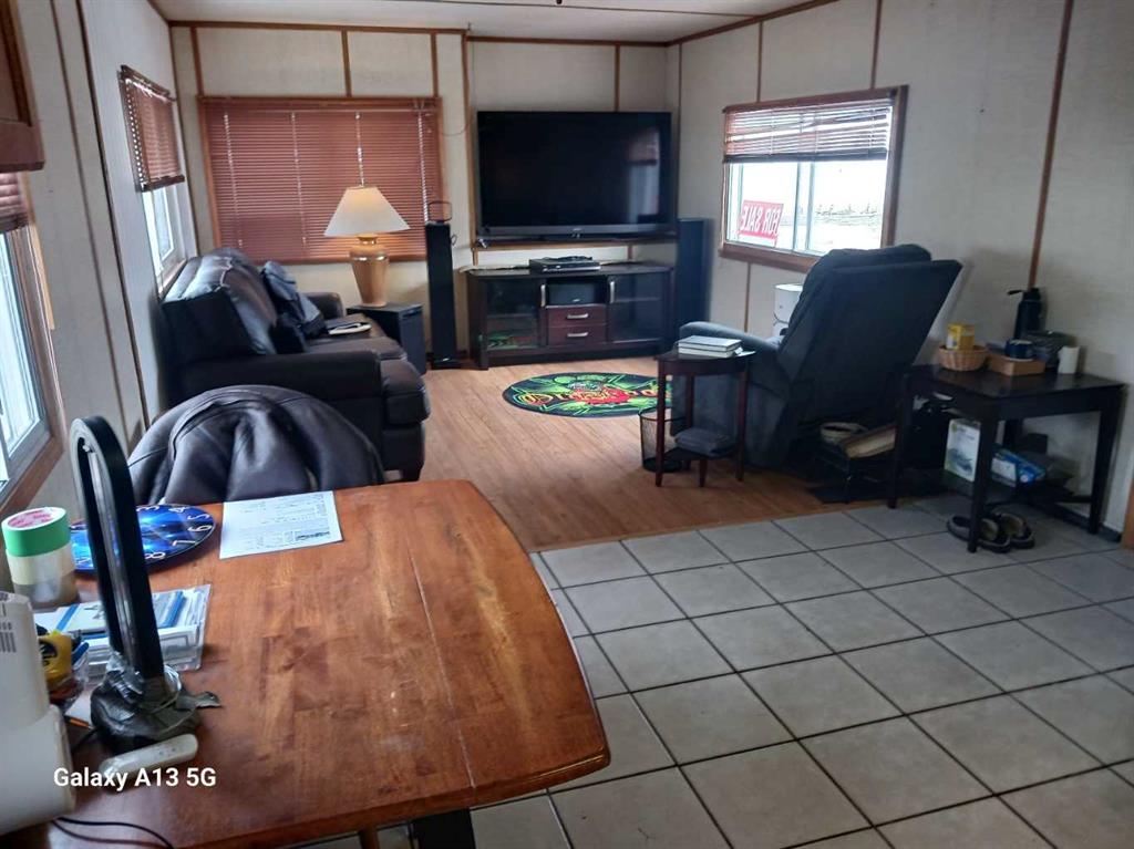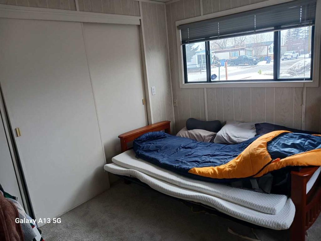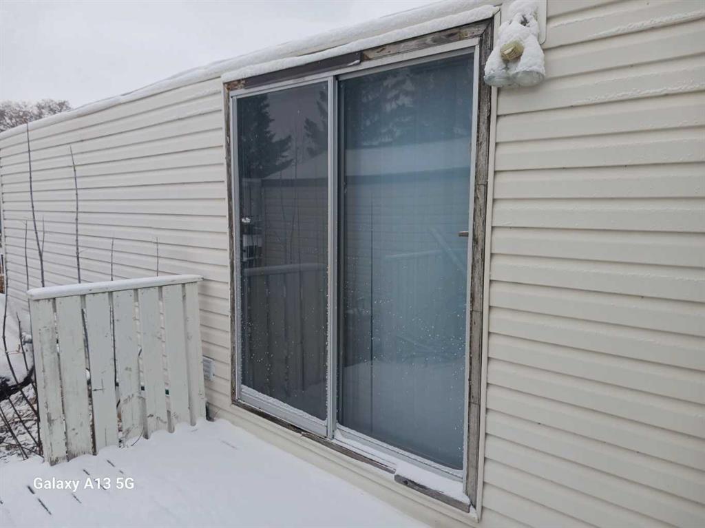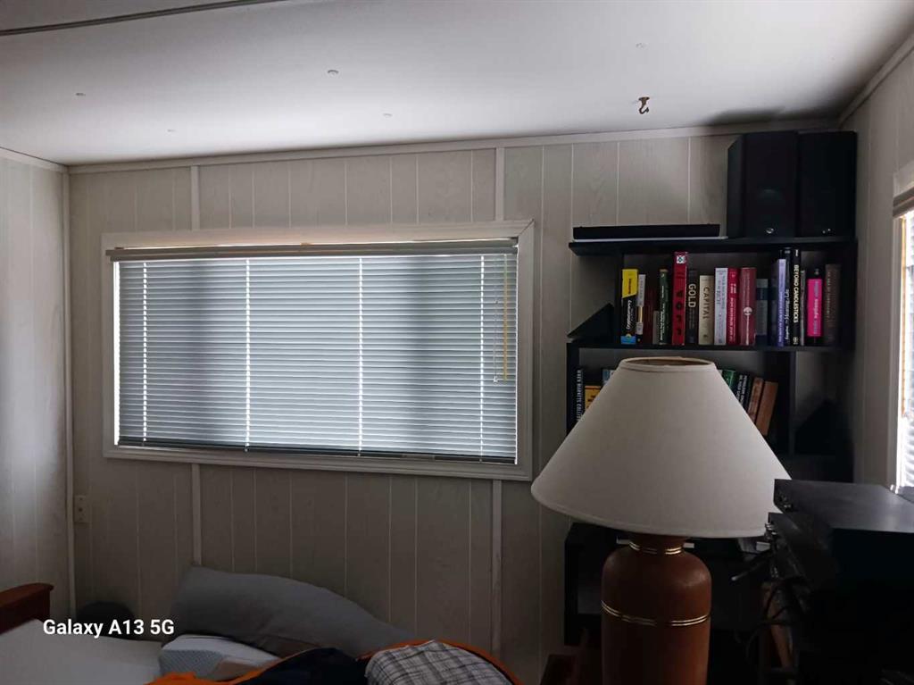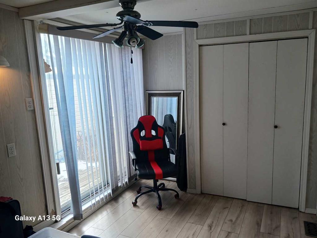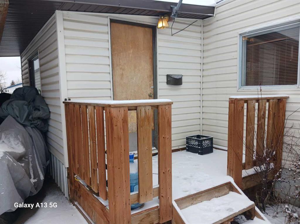 JUST FOR YOU. One bedroom home on Red Deer's north end in Mustang Acres. Renovated some time ago and offers up tiled flooring in the kitchen/dining area, and hallway. Balance of flooring is again an updated laminate in the bedroom, bath and office. Kitchen cabinets were an upgrade with adjustable shelving so you can re-jiggle where the pans go, where you can stack the dishes so it all fits best for you. Appliances are staying so you save a little money and you save a lot of time. The living room is very functionable so no need to worry about room for your relaxing sofa, recliner, foot stool and or your coffee table. Down the hall, first room on your left is a huge 13'.5" x 8'.6" office, games room or can be easily converted back to a second bedroom if the need presents itself. Office also features patio doors facing south and is perfect to access the 10' x 14' south west facing deck. Primary bedroom is at the very back of the home and it too has upgrades in regard to light fixtures and. carpet for flooring. More value in the 8' x 14'6" addition currently acting as a great entrance/porch/storage area. With the home being 692 sqft and the addition being 116 sqft now you have a total of 808 sgft all to yourself. It's going to be fantastic for you. Not only is there some open, paved parking but a 11' 6" x 16' carport to protect your ride. A GARAGE, yes, a 9'x24' detached garage for doing your thing, whether that means more cars, bikes or hobby playroom. This home is set up on a corner lot and a fence backyard backs on to empty green space. Shopping, playgrounds, Casino, Schools and other needed retail is all within walking distance or a very short drive. Pets welcome subject to park approval. Quick, quick possession is possible and preferred. Now is go time. Go see.