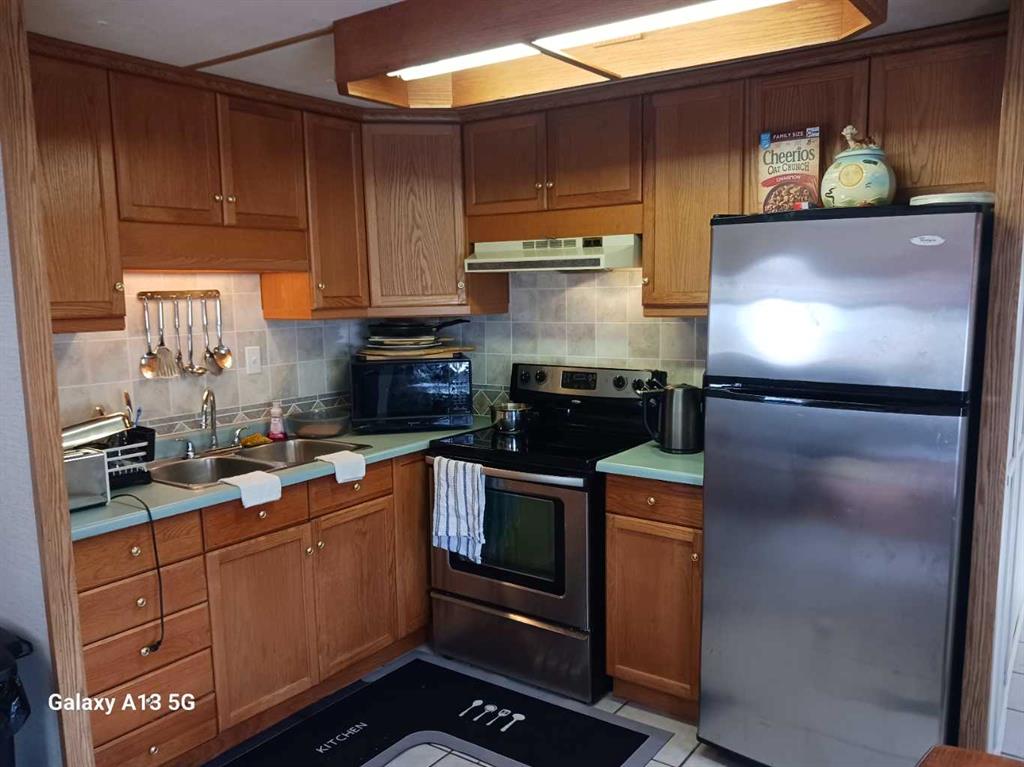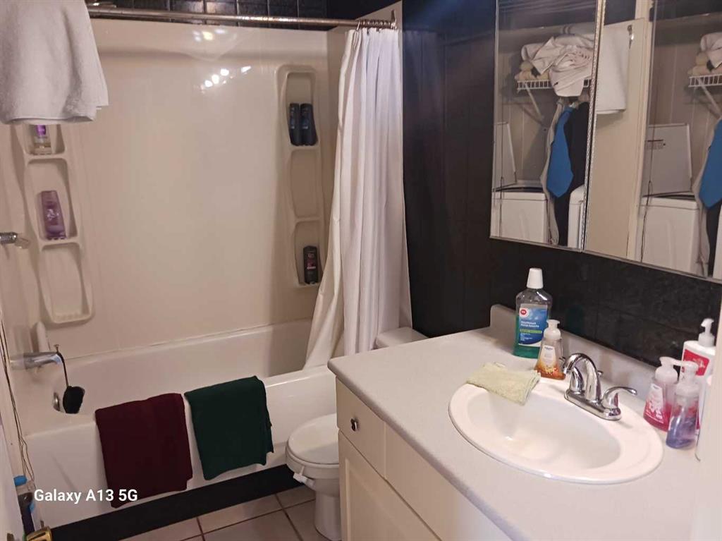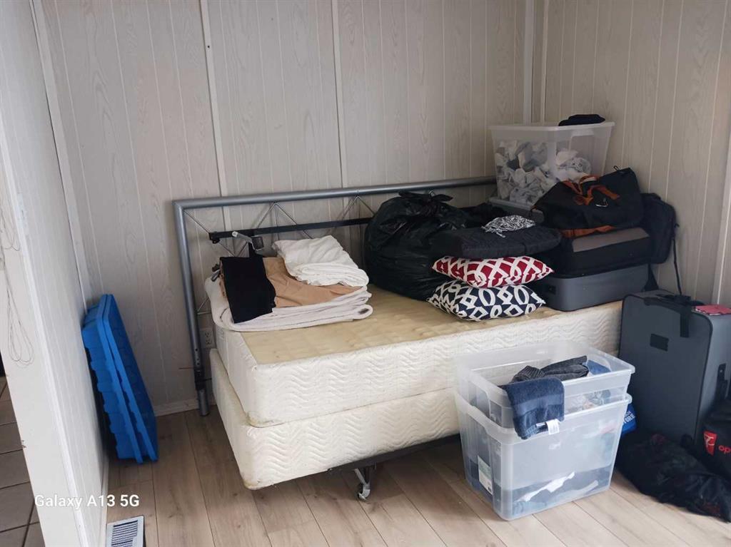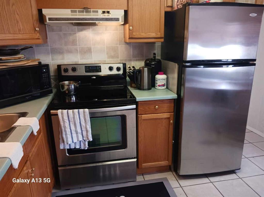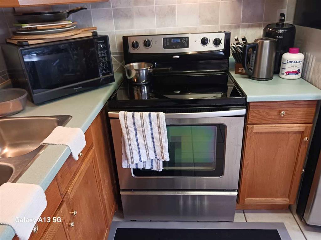 JUST FOR YOU. One bedroom home on Red Deer's north end in Mustang Acres. Renovated some time ago and offers up tiled flooring in the kitchen/dining area, and hallway. Balance of flooring is again an updated laminate in the bedroom, bath and office. Kitchen cabinets were an upgrade with adjustable shelving so you can re-jiggle where the pans go, where you can stack the dishes so it all fits best for you. Appliances are staying so you save a little money and you save a lot of time. The living room is very functionable so no need to worry about room for your relaxing sofa, recliner, foot stool and or your coffee table. Down the hall, first room on your left is a huge 13'.5" x 8'.6" office, games room or can be easily converted back to a second bedroom if the need presents itself. Office also features patio doors facing south and is perfect to access the 10' x 14' south west facing deck. Primary bedroom is at the very back of the home and it too has upgrades in regard to light fixtures and. carpet for flooring. More value in the 8' x 14'6" addition currently acting as a great entrance/porch/storage area. With the home being 692 sqft and the addition being 116 sqft now you have a total of 808 sgft all to yourself. It's going to be fantastic for you. Not only is there some open, paved parking but a 11' 6" x 16' carport to protect your ride. A GARAGE, yes, a 9'x24' detached garage for doing your thing, whether that means more cars, bikes or hobby playroom. This home is set up on a corner lot and a fence backyard backs on to empty green space. Shopping, playgrounds, Casino, Schools and other needed retail is all within walking distance or a very short drive. Pets welcome subject to park approval. Quick, quick possession is possible and preferred. Now is go time. Go see.