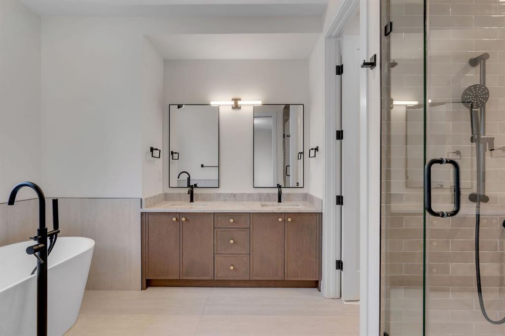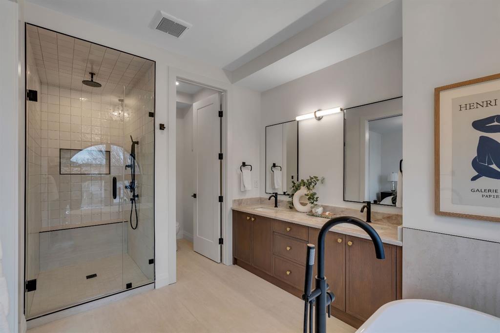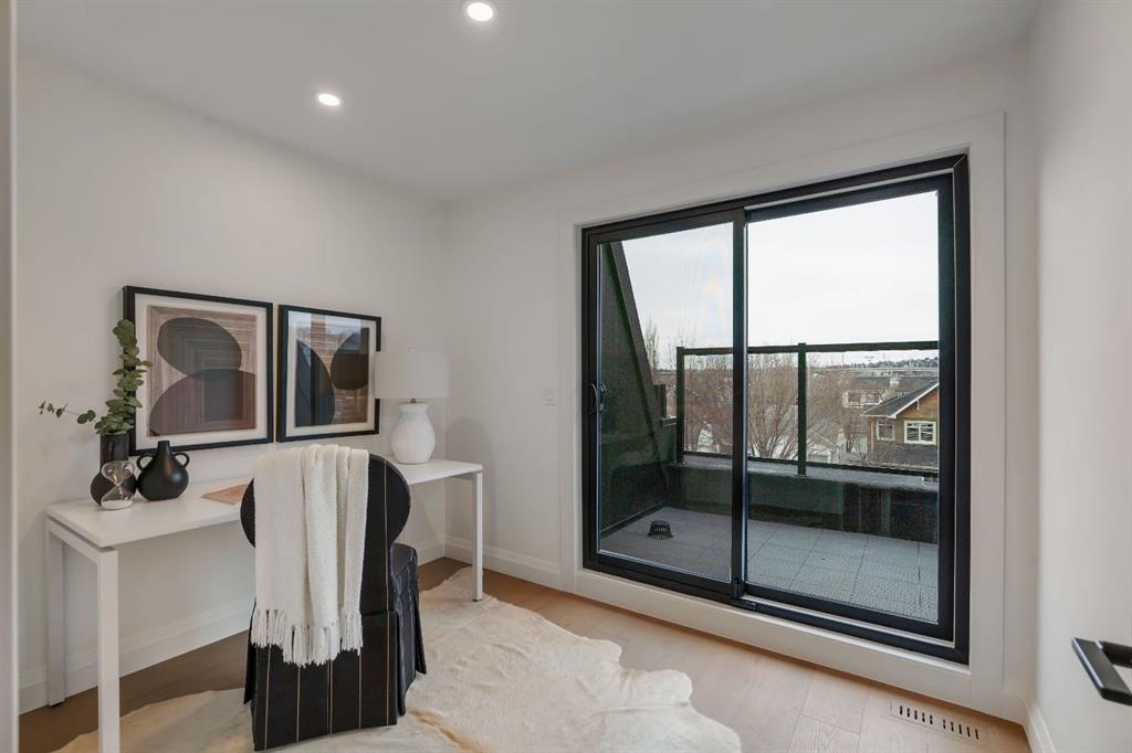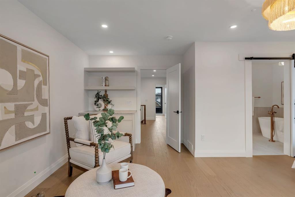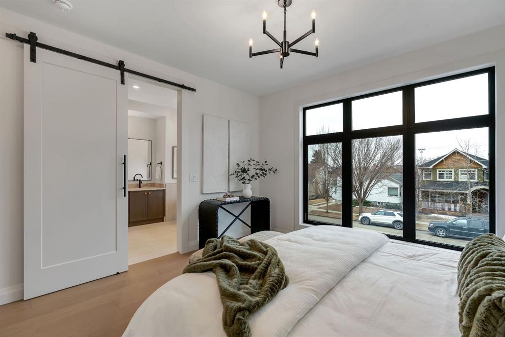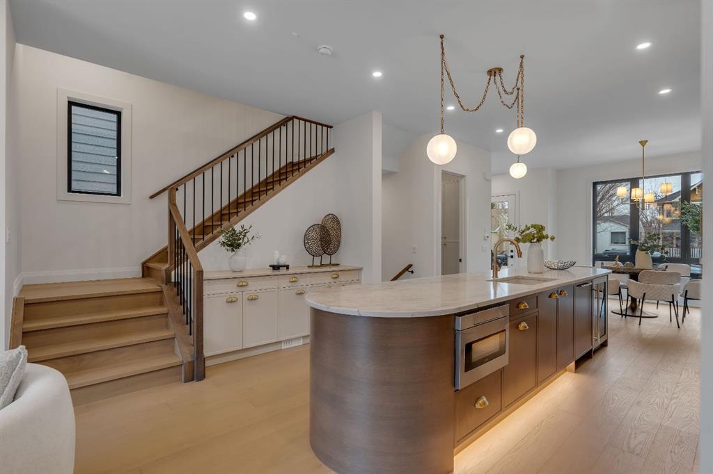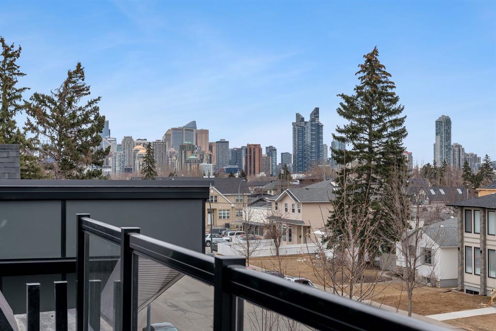 Unit 2 is sold with only Unit 1 remaining, presenting a rare opportunity to own a brand new exceptional three storey semi detached infill offering a total of over 3,700 sqft of thoughtfully curated living space across four levels in the sought after West Hillhurst. This residence showcases elevated inner city living with impeccable craftsmanship and refined contemporary design, highlighted by wide plank hardwood flooring and striking custom oak detailing throughout. The open concept main floor is defined by 10 foot ceilings and a formal dining area with custom wainscoting and large south facing windows that fill the space with natural light, while the kitchen stands out as a true centrepiece with a dramatic 12 foot curved oak island, quartz countertops and backsplash, premium built in appliances, gold and black hardware, two tone cabinetry, a plaster finished curved hood fan, gold pot filler, and under cabinet lighting, complemented by a thoughtfully concealed walk in pantry with custom cabinetry. The living room offers a warm yet sophisticated atmosphere with a designer gas fireplace featuring fluted tile, quartz accents, and curved oak built ins, stepping out to a very large backyard, while a spacious mudroom with built ins leads to a beautifully finished powder room with oak cabinetry, half panelled walls, and under mount lighting. The upper level features two luxurious primary suites, each complete with double oak vanities, freestanding soaker tubs, fully tiled showers, and in-floor heating, along with a versatile bonus room and a full laundry room, all enhanced by carefully selected designer lighting and elegant sconces. The third level loft creates a private retreat with an additional expansive primary bedroom, a large walk in closet with an oak finished island, make-up desk, a spa inspired ensuite with double oak vanity, in-floor heat, and a steam shower, as well as a dedicated office space that opens onto a private balcony with unobstructed downtown views. The fully developed basement adds further functionality with a generous recreation area, wet bar, fourth bedroom, full bathroom, rough-in for in-floor heat & A/C, and a dedicated home gym, all finished with oversized windows to maximize natural light. Designed by John Trin, this architectural statement home offers a seamless blend of luxury, comfort, and design, ideally located near parks, schools, the river, and everyday amenities. Call today to book your private tour!