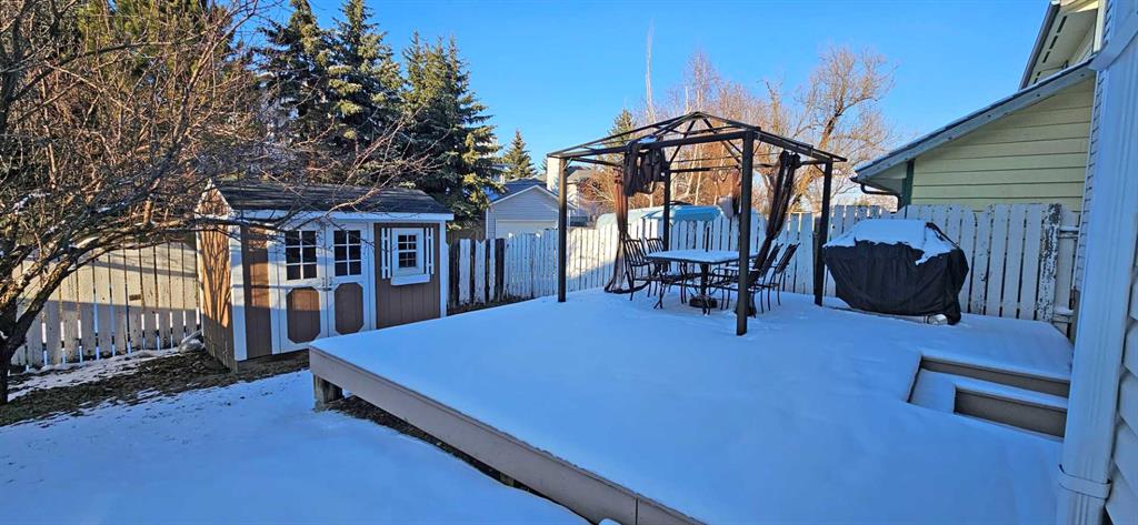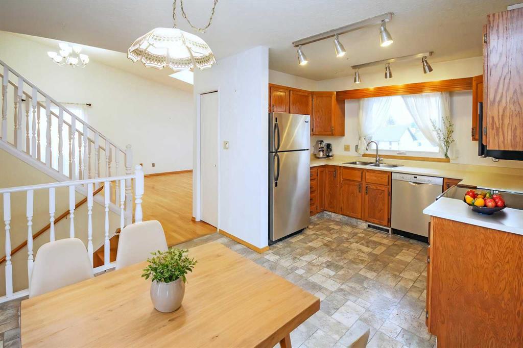 OPEN HOUSE Sat / Sun 1:00 - 4:00 pm Welcome to this well maintained 4 level split home with over 1980 sq ft of living space. Upon entry, the open concept main level showcases beautiful hardwood floors in the living and dining room with vaulted ceiling that add to the grandeur and an abundance of windows and skylight allowing lots of natural light. A spacious kitchen with a second eating area has patio doors leading you out to a big front and side decks that are great for BBQing and entertaining. The hardwood continues upstairs down the hallway and into the 3 spacious bedrooms. The master bedroom has a 4 piece ensuite and another 4 piece bathroom on the upper level. On the 3rd level gather in the family room in front of the gas fireplace for game night or dancing on the corner dance floor. This level is also home to another room for your home office/play area/recreation space or guest room with a 2 piece washroom and sink area. This room gives you easy access to the back deck and yard. Fully fenced backyard has lots of room to play and relax whether lounging or entertaining on the deck or playing in the yard. The fourth lower level is developed with another room with 2 large south facing windows great for a home office. There’s laundry area and access to the attached garage on this level. As well as a huge crawl space for storage. Upgrades include: furnace (2008), windows (2014), metal roof 50 yr warranty (2008), R50 insulation (2012), deck (2009), poly-b removed (2010), fireplace gas insert (2008), skylight (2014), leaf guards (2023). Woodbine is a great community with great schools. Easy access to Stoney Tr, Fish Creek Park, Costco and close to local amenities and schools, a great place to call home!