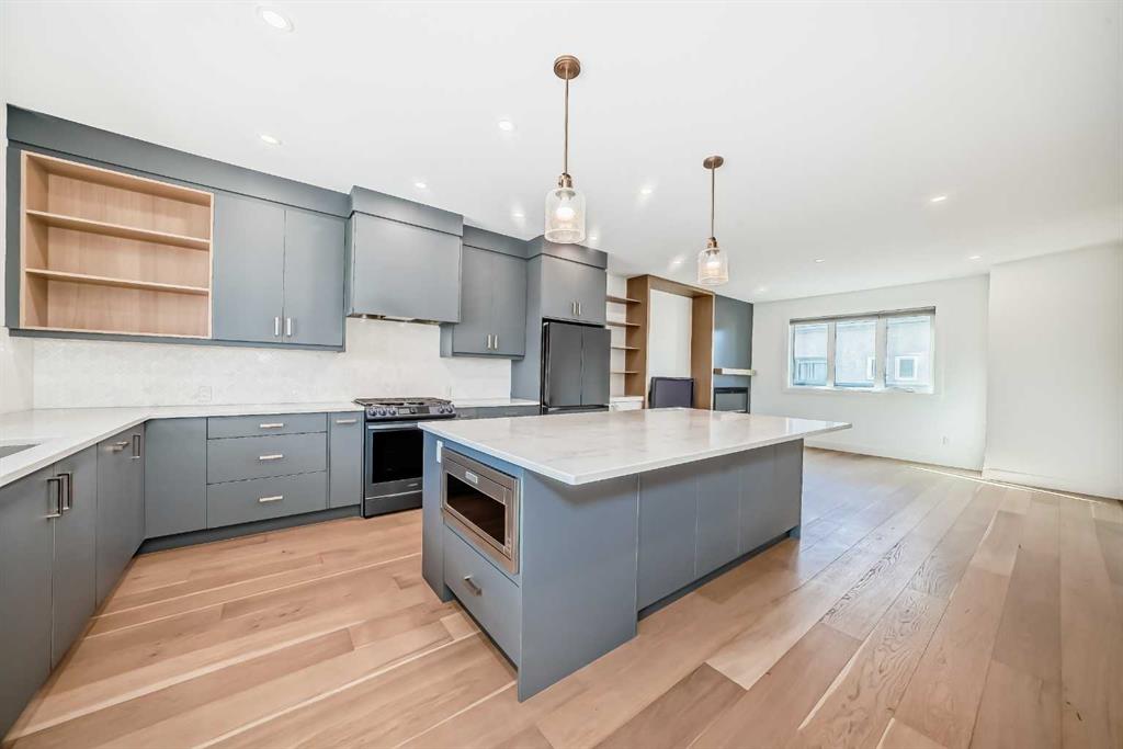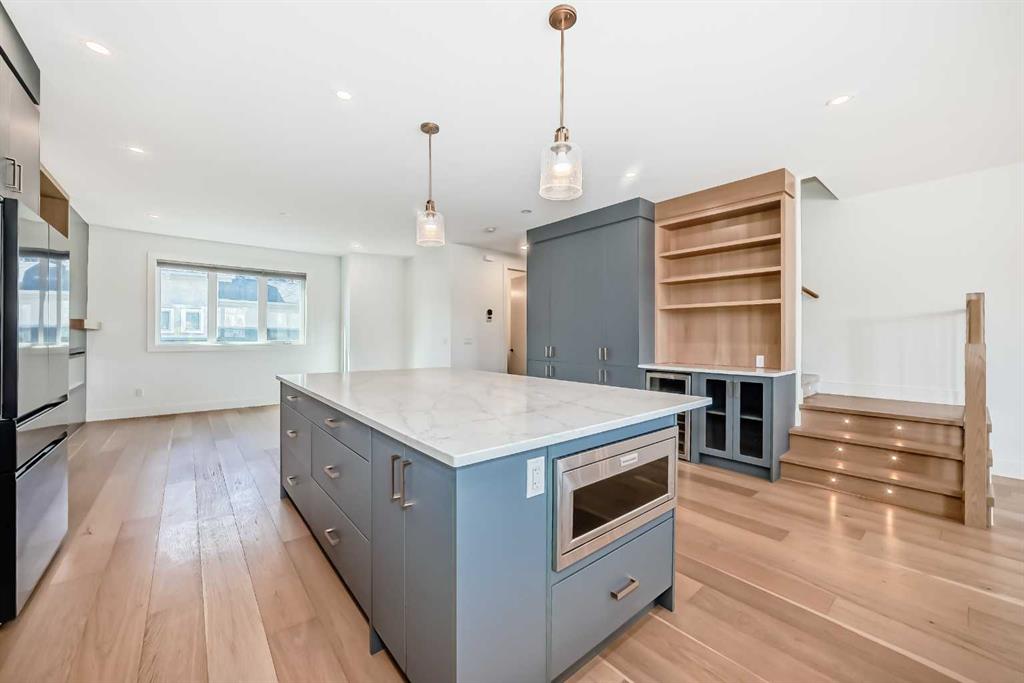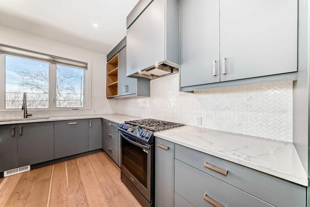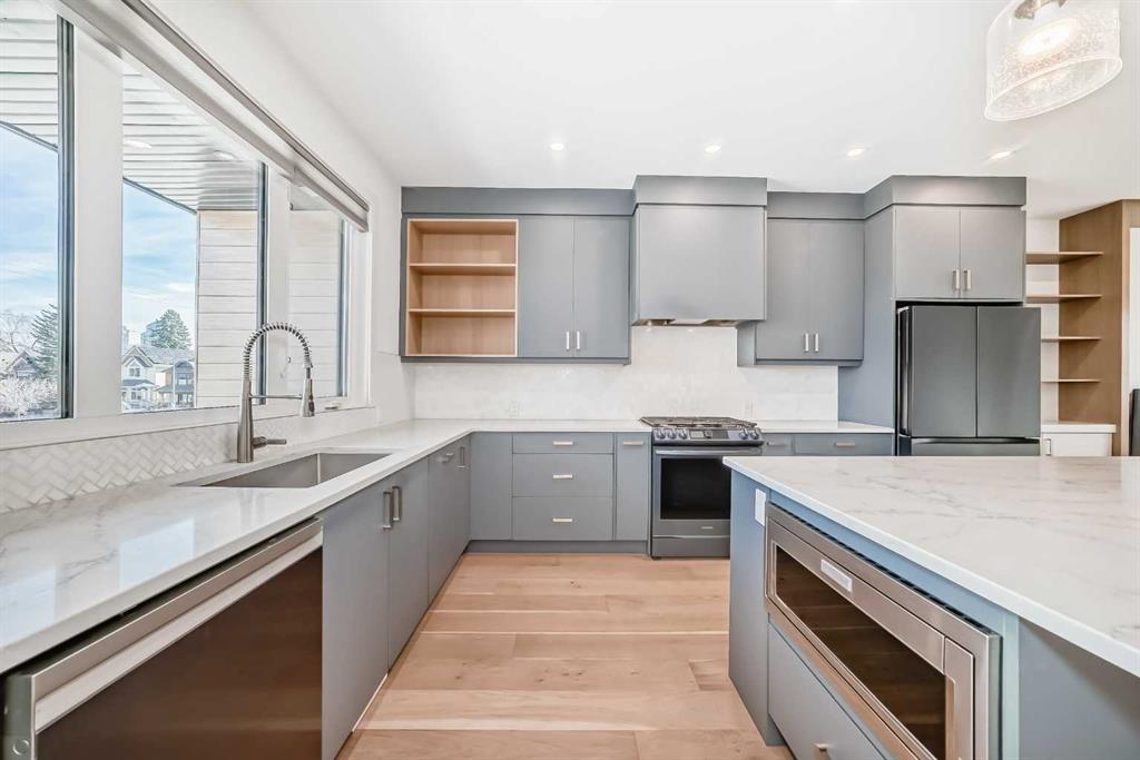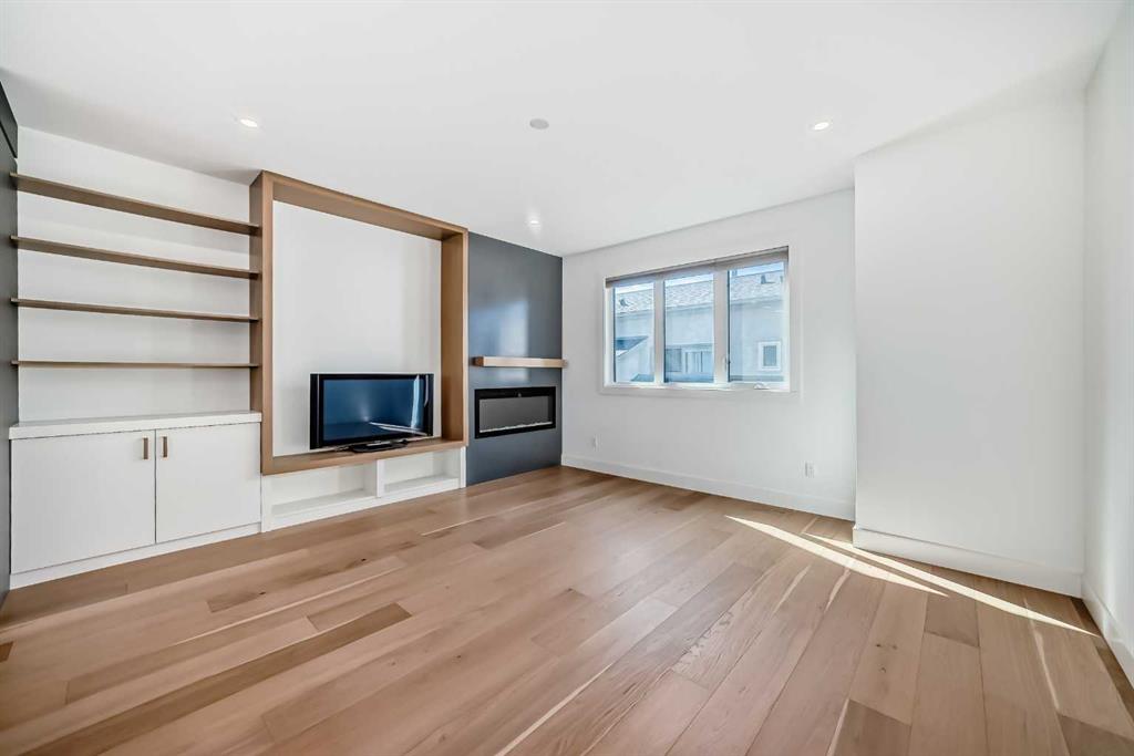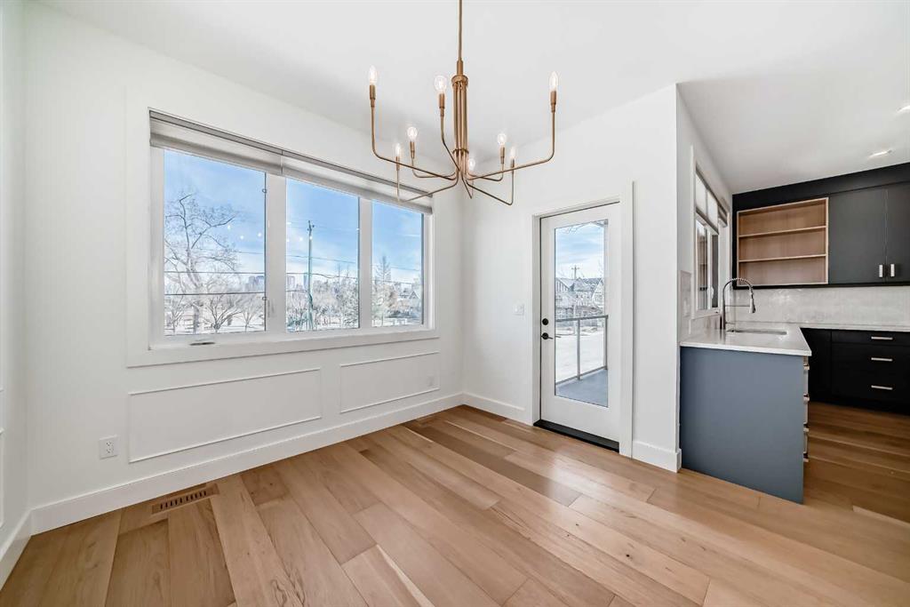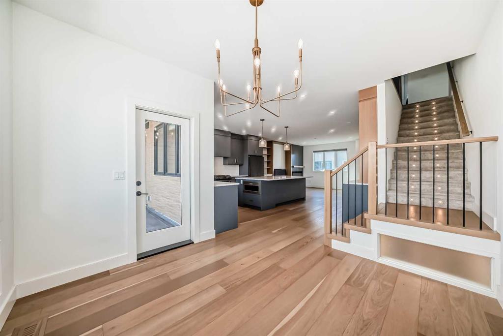 Welcome to West Hillhurst living in a modern designed Rowhouse. With a spacious layout featuring Unobstructed City Views and High-End Finishes, this is one you do not want to miss. This 3-storey Rowhouse boasts 3 bedrooms, 3.5 bathrooms and an attached heated garage with EV hookup. A beautifully designed open concept main floor featuring wide-plank hardwood flooring, oversized triple-pane windows. The kitchen is designed for home chefs and boasts sleek cabinetry, quartz countertops, premium appliances, gas range, open shelves and stylish gold accents. The kitchen island is perfect for entertaining and just off the dining room is a private balcony with BBQ hookup. A stylish powder room completes the main level. Upstairs, the primary suite is a true retreat, featuring a spa-inspired 5-piece ensuite with a soaker tub under a gorgeous chandelier, oversized rainfall shower with build-in quartz bench, double vanity and heated floors. The primary walk-in closet is thoughtfully designed with ample storage. The second bedroom is spacious, complete with its own walk-in closet and a 4-piece ensuite with quartz countertops. A conveniently located laundry room adds to the thoughtful design. The lower level has an additional bedroom and 3-piece bathroom along with an oversized mechanical room with ample storage. Located directly across from highly desirable schools and just steps from parks, shops and restaurants with easy access to Crowchild Trail, downtown and transit, this unbeatable location offers the very best of city living!