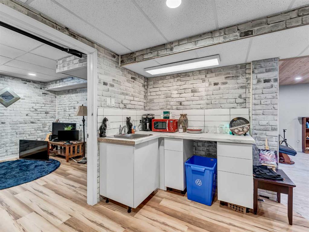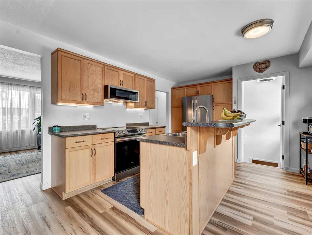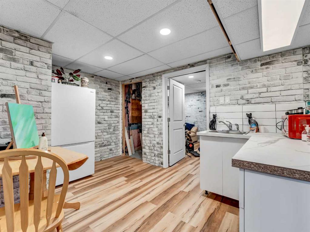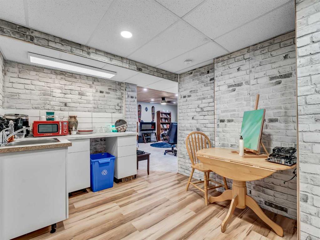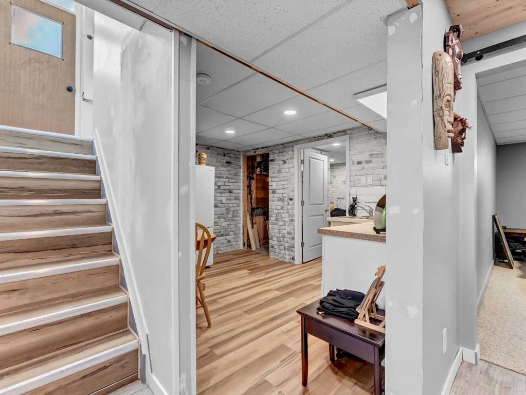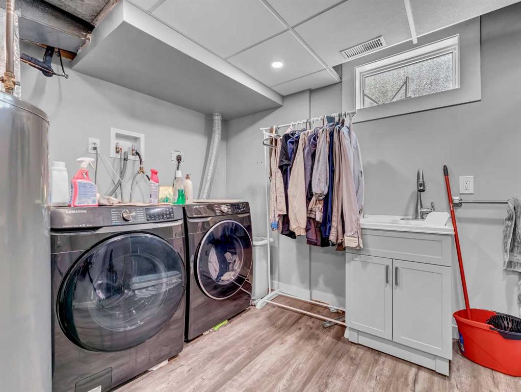 Nestled on a QUIET COURT WITH A GREEN BELT in the back, this RENOVATED BUNGALOW has TWO KITCHENS and TWO LAUNDRY ROOMS! This 4 bedroom , 2 bathroom home provides 2 excellent living spaces! The main floor has a nice open Kitchen / Dining area that takes advantage of the natural light. There are 3 bedrooms up, with one of the bedrooms currently set up as a MAIN FLOOR LAUNDRY. The main bathroom has been thoroughly renovated, the updated kitchen has a great layout with the sink and BRAND NEW DISHWASHER located in a central island. UPDATED WINDOWS AND PATIO DOORS on the main floor as well! The discreet rear entry to the home provides access to the basement . There is a convenient KITCHENETTE downstairs , a second laundry , a sitting room , a flex room , a bathroom , and a bedroom. There is a high efficiency furnace , a BRAND NEW A/C, and some updated plumbing and electrical as well. Being situated on a 65 foot wide lot creates an awesome back yard! There is a newer wooden deck and patio, an insulated detached single garage with a new overhead door, the yard is fully fenced, and also has U/G sprinklers front and back. A few other upgrades include NEW SOFFIT AND FACIA, and exterior paint. This is a great home in a great location where you can simply move in and enjoy !