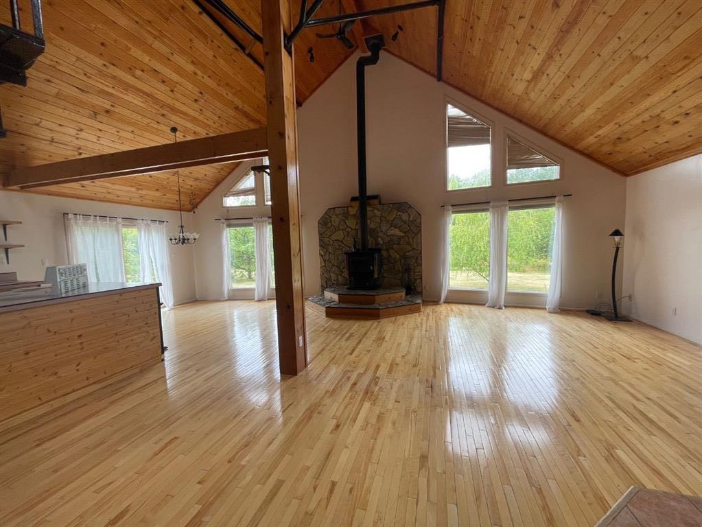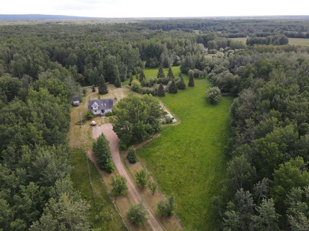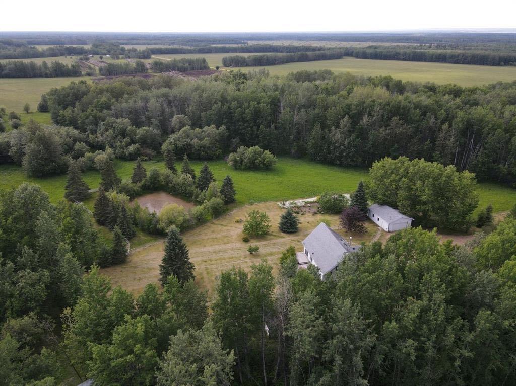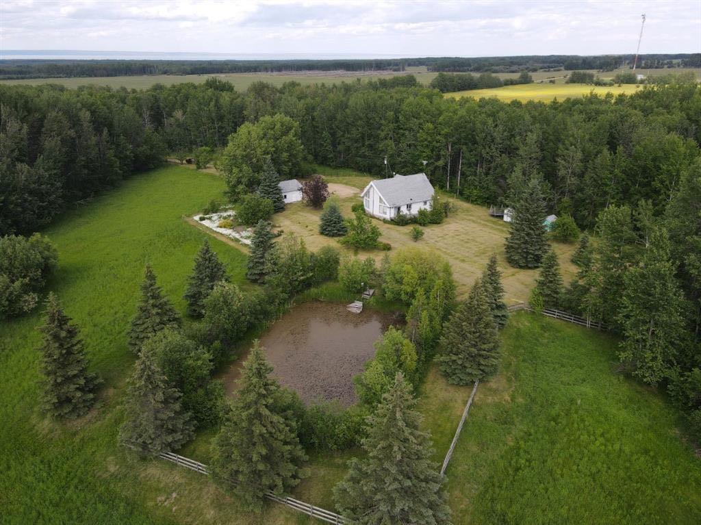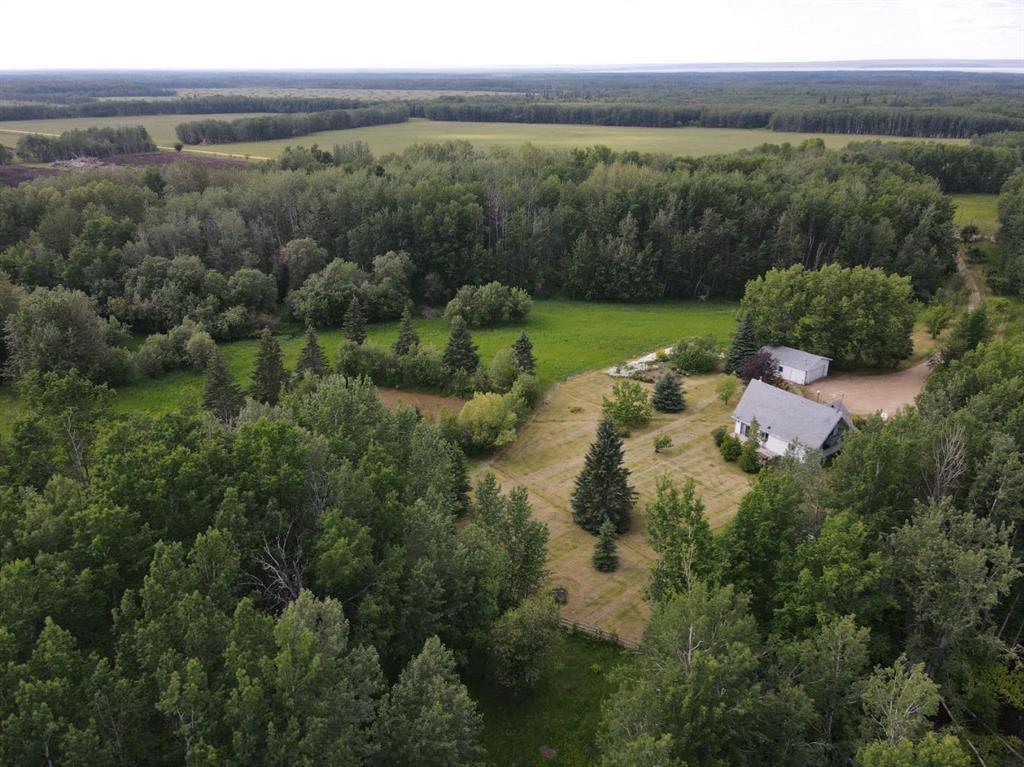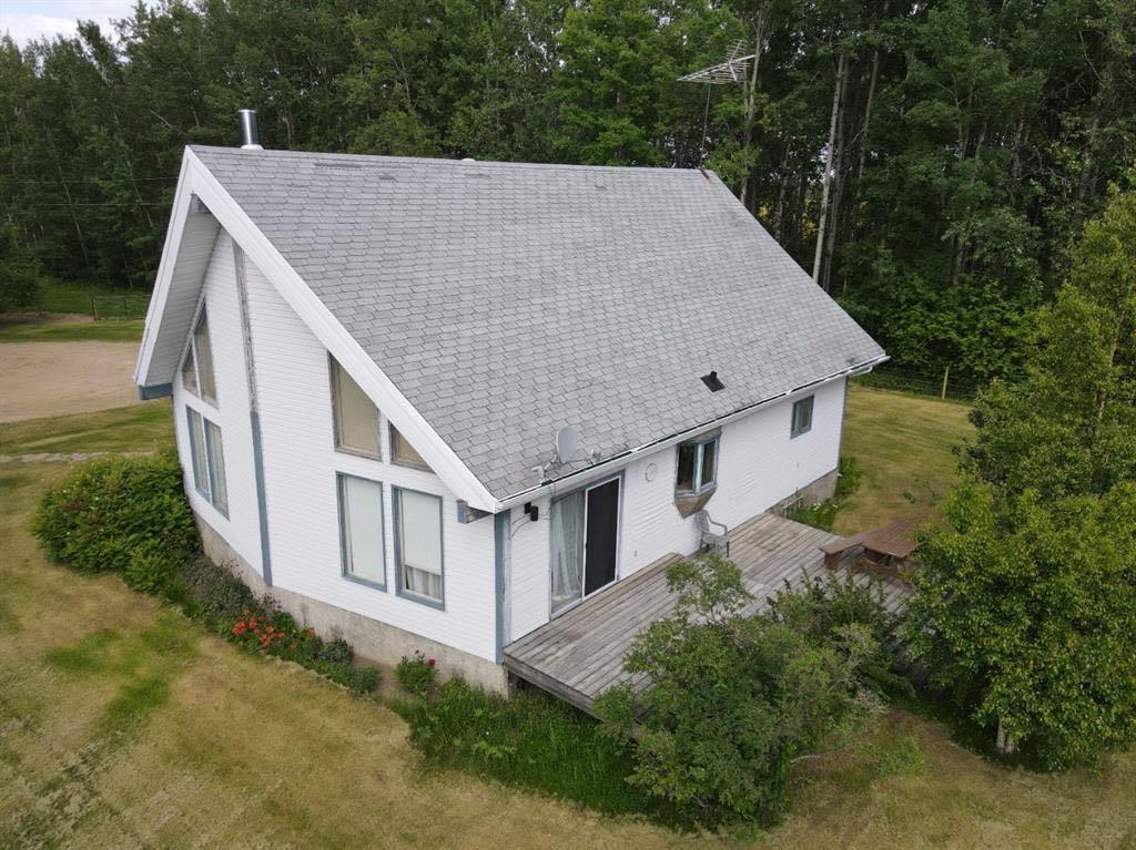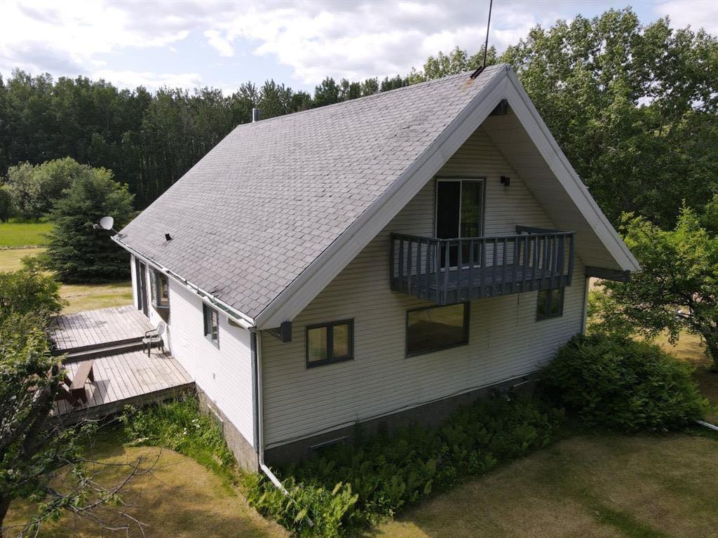 Tucked away in a natural setting, this A-frame home is the perfect blend of tranquility and possibility. The main level offers an open-concept layout where the bright living area, kitchen, and dining space flow seamlessly together, accompanied by two bedrooms and a spacious bathroom featuring a sleek black soaking tub set before a picture window. Ascend the spiral staircase to discover a private primary suite, complete with an ensuite bath and a balcony that overlooks the serene landscape below. An unfinished basement provides a blank canvas—ready to become a family room, extra bedrooms, or a custom space tailored to your needs. Outside, a detached heated double garage offers ample storage or workshop potential, while the land itself is a true sanctuary. This lush, sheltered ecosystem nurtures native plants and trees, creating a natural windbreak and water source that nature enthusiasts will adore. Whether you seek a peaceful countryside home, a recreational getaway, or a hobby farm, this property delivers an extraordinary combination of comfort, space, and natural beauty. Call today to book your viewing: immediate possesssion available.