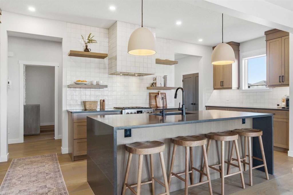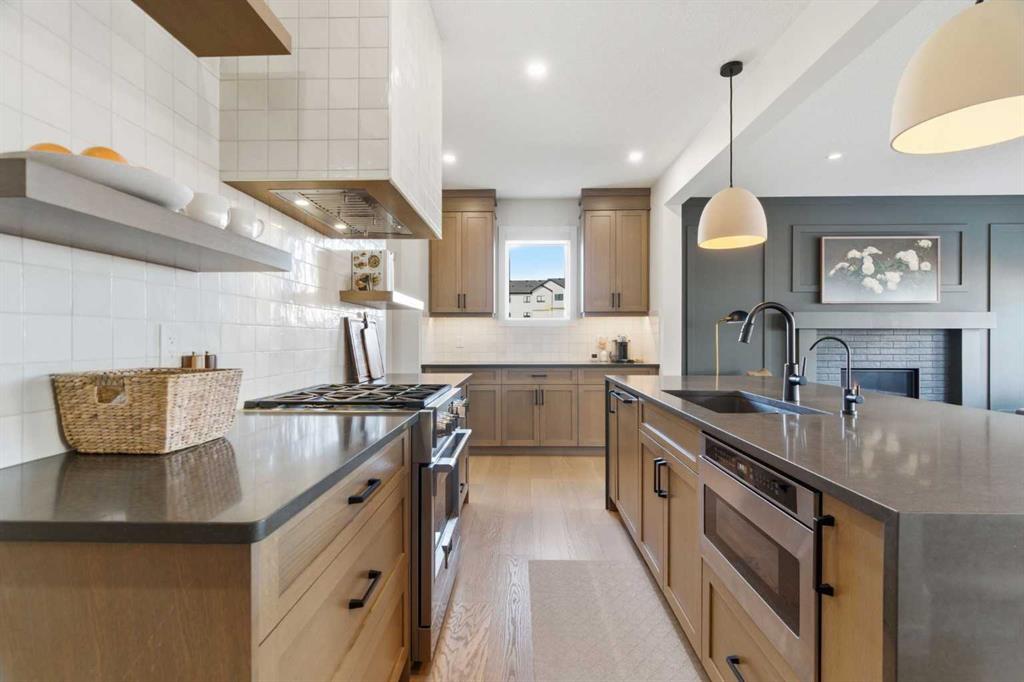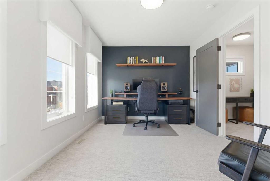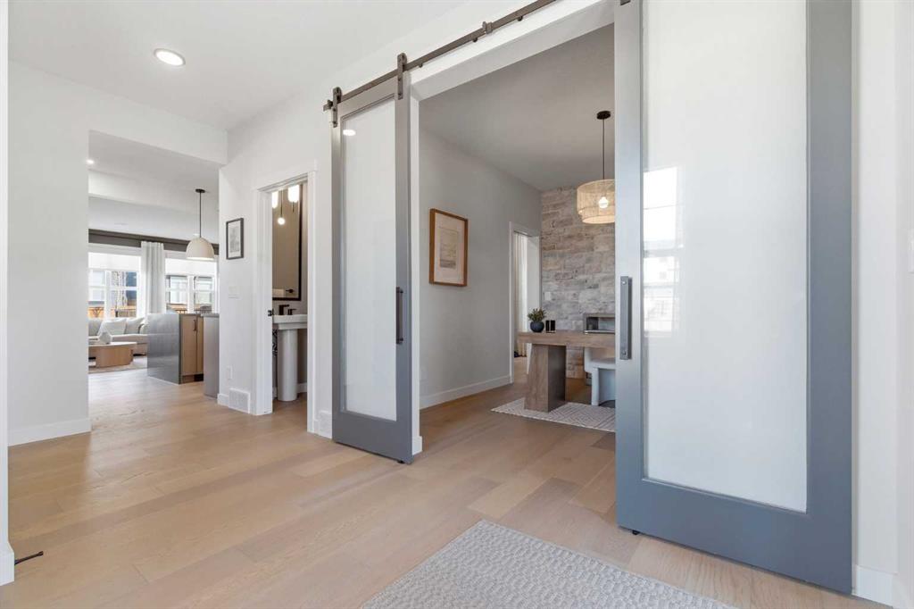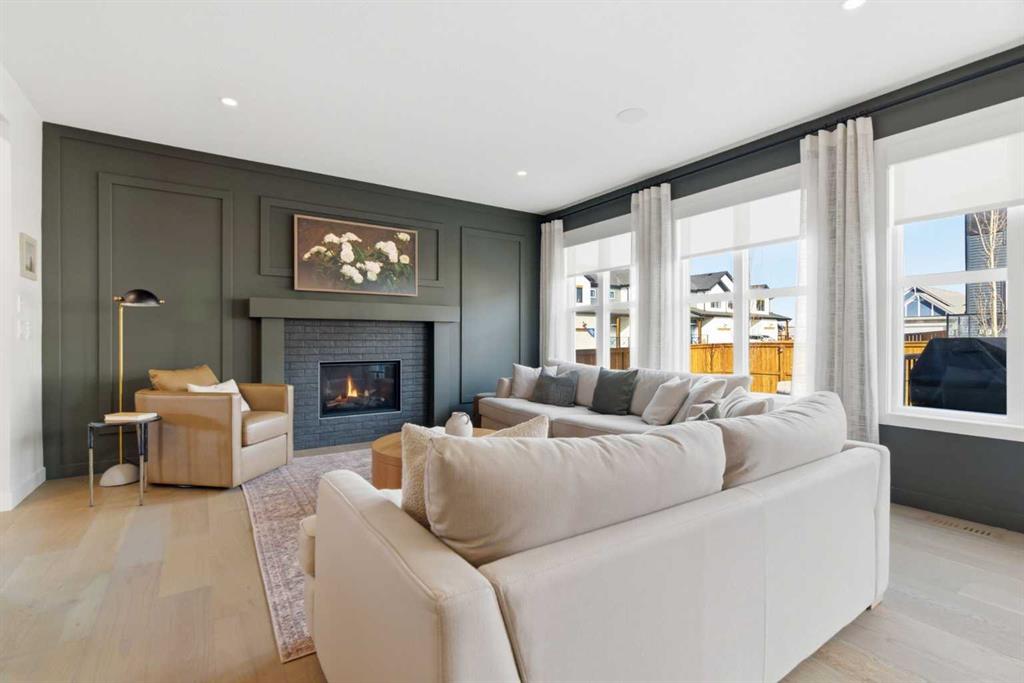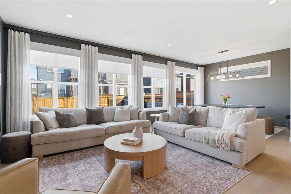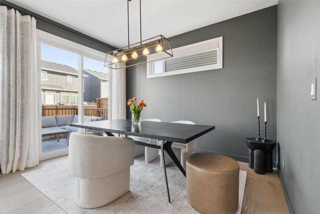 4 BEDROOMS | 3 1/2 BATHROOMS | 2-STOREY | 3,600+ SQFT OF LIVING SPACE | DOUBLE ATTACHED GARAGE | FULLY DEVELOPED BASEMENT | CORNER LOT | Welcome to this stunning Trico-built former showhome located in the sought-after community of Sirocco at Pine Creek, offering over 3,600 sqft of beautifully finished living space with 4 bedrooms and 3.5 bathrooms. Situated on a corner lot, this home is loaded with high-end upgrades and thoughtfully designed for both everyday living and entertaining. As you enter the home, you are greeted by soaring 9-foot ceilings and rich white oak hardwood flooring that flows throughout the main level. The bright and inviting living room features a gas fireplace and elegant decorative wall paneling, creating a warm and refined space to gather. Just off the foyer, a versatile flex room with a glass barn door and striking stone feature wall provides the perfect space for a home office or formal dining room. The heart of the home is the designer kitchen, showcasing white oak cabinetry with integrated appliances, including a hidden fridge and dishwasher, high-end gas range, built-in microwave, and a statement backsplash. Quartz countertops with rounded edges, a large island with waterfall edge and flush eating bar, and full-height cabinetry with crown moulding complete this stunning space. The adjacent dining area opens onto the rear deck and fully fenced landscaped backyard with a stone patio and built-in fire pit - the perfect place for entertaining. A walkthrough butler’s pantry leads to the mudroom with built-in lockers and convenient access to the double attached garage. Upstairs, you’ll find a spacious bonus room with tray ceilings and large windows, along with a convenient study nook. The luxurious primary retreat features a statement stone feature wall, a large walk-in closet with direct access to the laundry room, and a spa-inspired 5-piece ensuite with dual vanities, soaker tub, and a glass shower with bench. Two additional bedrooms, each with their own walk-in closet, and a full 4-piece bathroom complete this level. The fully developed basement with 9-foot ceilings offers even more living space, including a large recreation room with play area, a fourth bedroom, and a full bathroom, making it ideal for guests or a growing family. Additional upgrades include central air conditioning, built-in sound system on the main floor and basement, CAT5 wiring, electronic blinds, and sump pump. Located close to parks, playgrounds, and pathways, Sirocco Golf Course, and Spruce Meadows. This exceptional home offers luxury, space, and functionality in one of Calgary’s newest and most desirable communities. Book your showing today!