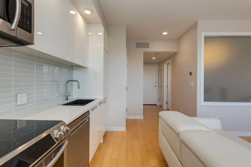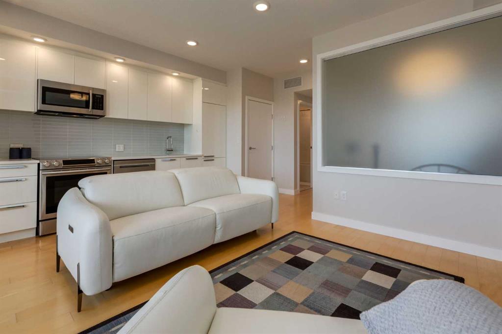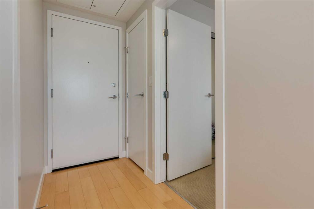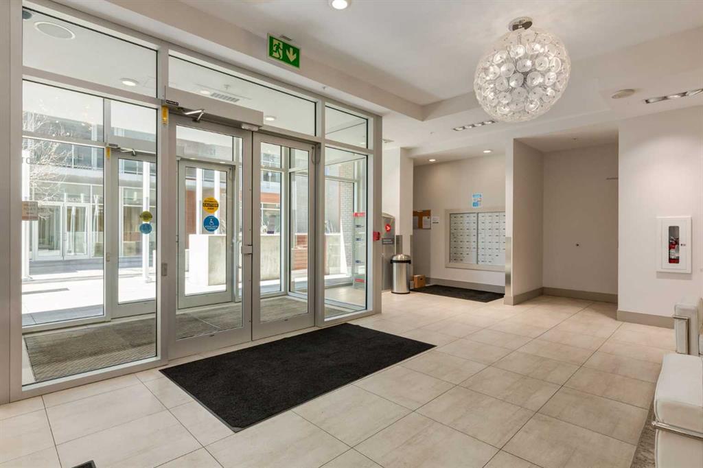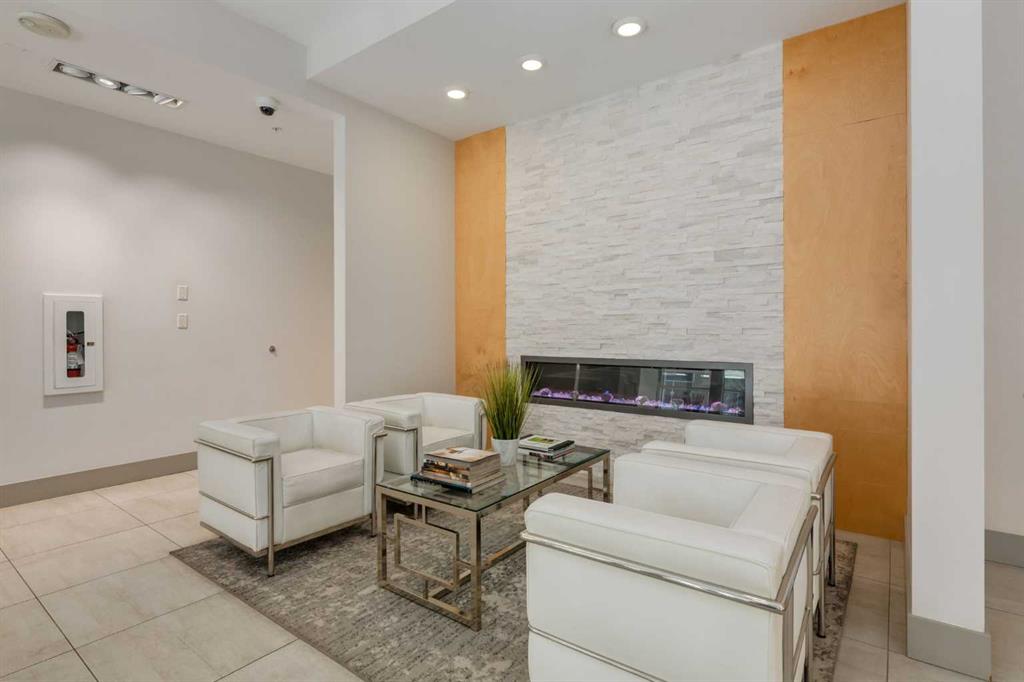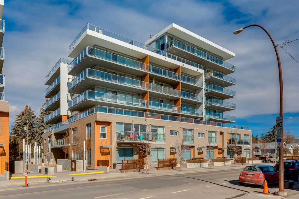 This concrete-built residence offers the perfect blend of quiet, quality construction and refined inner-city living. Thoughtfully designed one-bedroom unit provides flexible, low-maintenance living in one of Calgary’s most vibrant communities. When you’re living in the village, living efficiently comes naturally—and with The Ezra’s beautifully appointed resident lounge, you’ll always have the perfect space to host and entertain. From the moment you enter, the building impresses with its elegant, secure foyer and upscale finishings throughout. Inside the unit, that same level of quality continues with natural maple hardwood floors, sleek white walls, quartz countertops, high-gloss cabinetry, and modern fixtures. The kitchen is both stylish and functional, offering efficient storage and quality appliances. A full east-facing wall of windows fills the space with natural morning light and opens onto a spacious balcony overlooking Riley Park and downtown—complete with a gas BBQ line for effortless outdoor living. Comfort is elevated with in-suite laundry, in-tile heated bathroom floors, and in-unit air conditioning controlled by a Nest thermostat, allowing you to tailor your environment year-round. An intelligently designed, partially obscured glass wall separates the bedroom, maintaining an open, airy feel while providing privacy. A full bathroom completes the space. Residents enjoy access to exceptional amenities, including a stunning second-level lounge with a fully equipped kitchen, designer furnishings, and a wine room with optional storage—perfect for hosting or relaxing. The adjacent West building offers a well-equipped fitness centre, and the heated underground parkade connects both buildings for seamless access in every season. Additional features include underground visitor parking, secure bike storage, a private storage locker, and pet-friendly living. With Riley Park just outside your door, enjoy year-round access to green space, gardens, and walking paths. You’re steps to SAIT, the LRT, river pathways, and all the shops, restaurants, and lifestyle amenities that make Kensington one of Calgary’s most desirable—and walkable—communities.