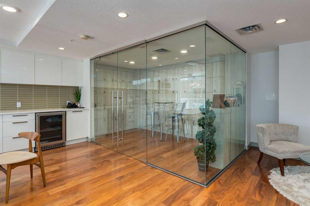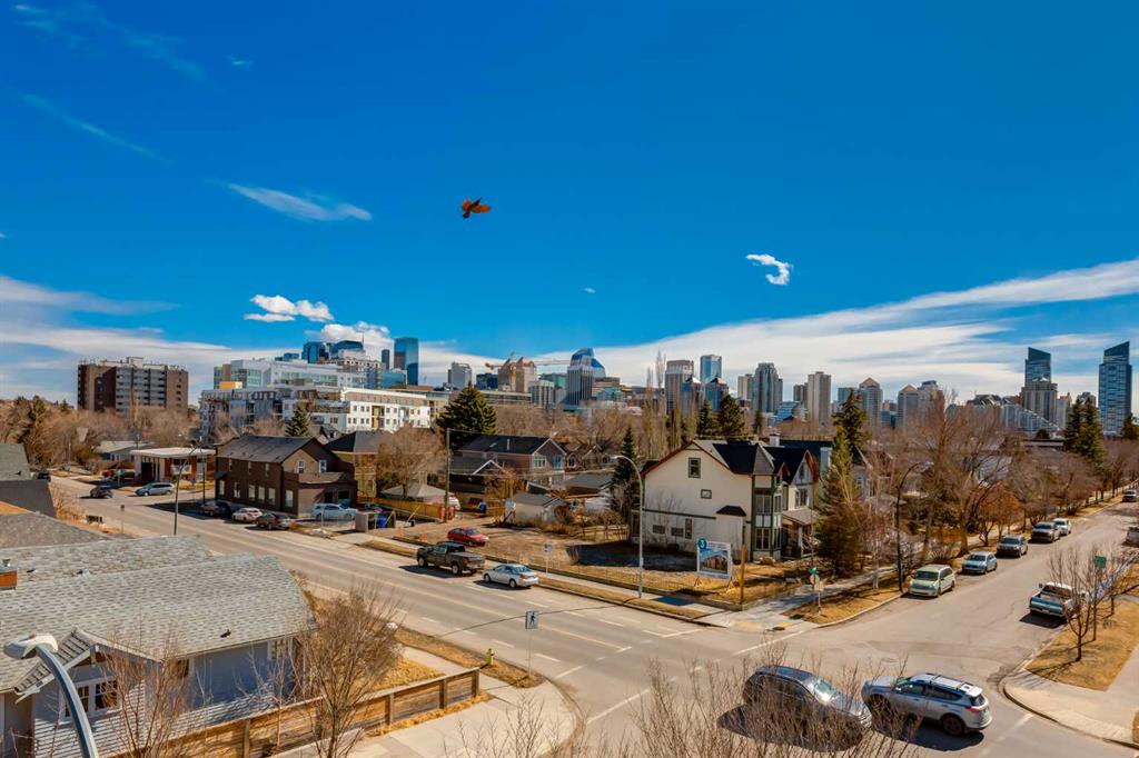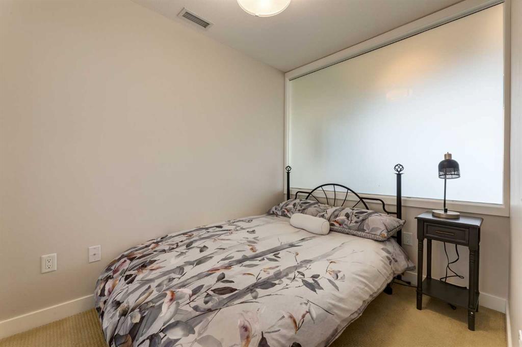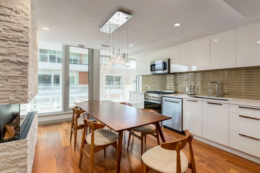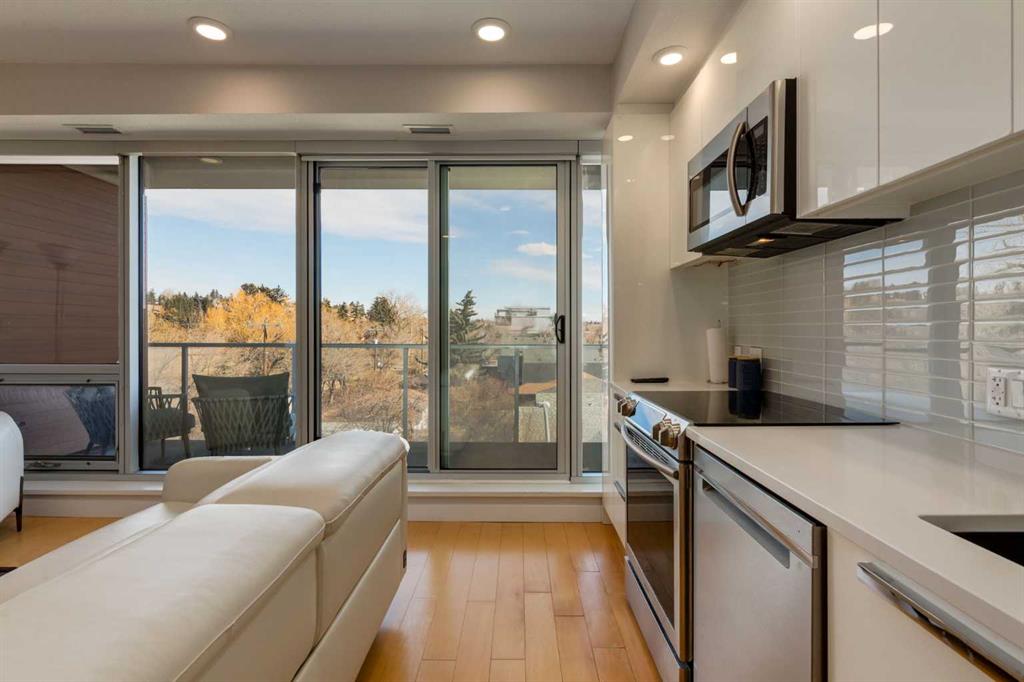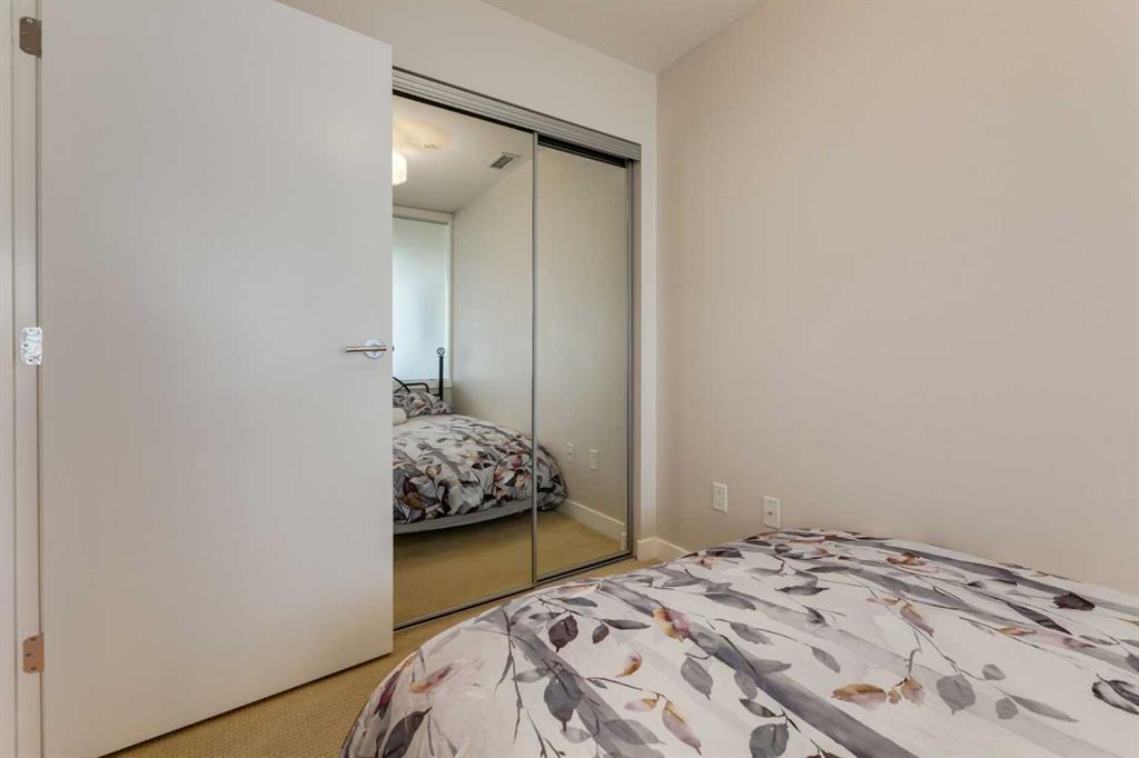 This concrete-built residence offers the perfect blend of quiet, quality construction and refined inner-city living. Thoughtfully designed one-bedroom unit provides flexible, low-maintenance living in one of Calgary’s most vibrant communities. When you’re living in the village, living efficiently comes naturally—and with The Ezra’s beautifully appointed resident lounge, you’ll always have the perfect space to host and entertain. From the moment you enter, the building impresses with its elegant, secure foyer and upscale finishings throughout. Inside the unit, that same level of quality continues with natural maple hardwood floors, sleek white walls, quartz countertops, high-gloss cabinetry, and modern fixtures. The kitchen is both stylish and functional, offering efficient storage and quality appliances. A full east-facing wall of windows fills the space with natural morning light and opens onto a spacious balcony overlooking Riley Park and downtown—complete with a gas BBQ line for effortless outdoor living. Comfort is elevated with in-suite laundry, in-tile heated bathroom floors, and in-unit air conditioning controlled by a Nest thermostat, allowing you to tailor your environment year-round. An intelligently designed, partially obscured glass wall separates the bedroom, maintaining an open, airy feel while providing privacy. A full bathroom completes the space. Residents enjoy access to exceptional amenities, including a stunning second-level lounge with a fully equipped kitchen, designer furnishings, and a wine room with optional storage—perfect for hosting or relaxing. The adjacent West building offers a well-equipped fitness centre, and the heated underground parkade connects both buildings for seamless access in every season. Additional features include underground visitor parking, secure bike storage, a private storage locker, and pet-friendly living. With Riley Park just outside your door, enjoy year-round access to green space, gardens, and walking paths. You’re steps to SAIT, the LRT, river pathways, and all the shops, restaurants, and lifestyle amenities that make Kensington one of Calgary’s most desirable—and walkable—communities.