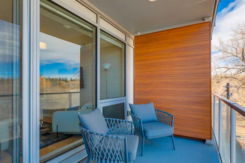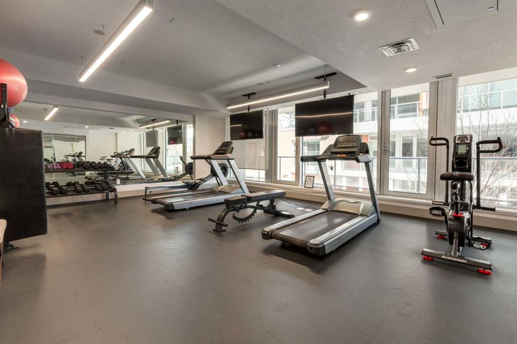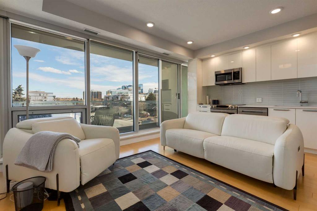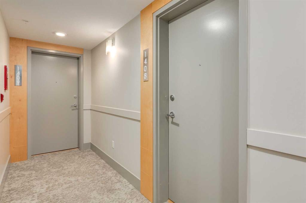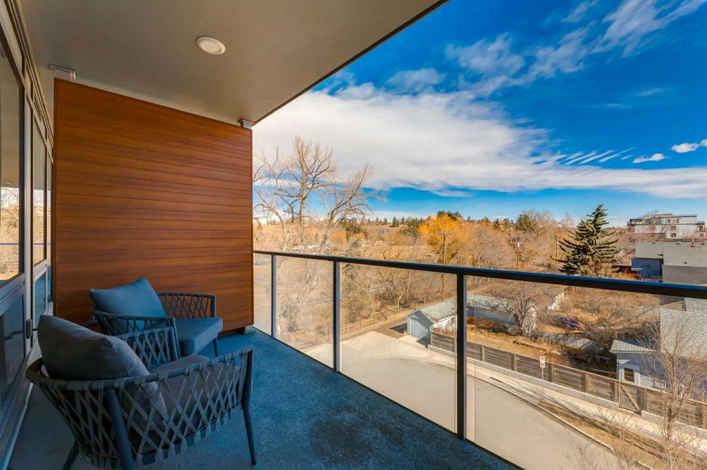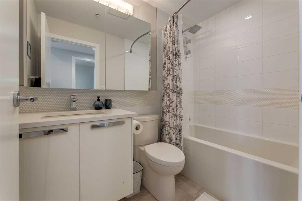This concrete-built residence offers the perfect blend of quiet, quality construction and refined inner-city living. Thoughtfully designed one-bedroom unit provides flexible, low-maintenance living in one of Calgary’s most vibrant communities. When you’re living in the village, living efficiently comes naturally—and with The Ezra’s beautifully appointed resident lounge, you’ll always have the perfect space to host and entertain. From the moment you enter, the building impresses with its elegant, secure foyer and upscale finishings throughout. Inside the unit, that same level of quality continues with natural maple hardwood floors, sleek white walls, quartz countertops, high-gloss cabinetry, and modern fixtures. The kitchen is both stylish and functional, offering efficient storage and quality appliances. A full east-facing wall of windows fills the space with natural morning light and opens onto a spacious balcony overlooking Riley Park and downtown—complete with a gas BBQ line for effortless outdoor living. Comfort is elevated with in-suite laundry, in-tile heated bathroom floors, and in-unit air conditioning controlled by a Nest thermostat, allowing you to tailor your environment year-round. An intelligently designed, partially obscured glass wall separates the bedroom, maintaining an open, airy feel while providing privacy. A full bathroom completes the space. Residents enjoy access to exceptional amenities, including a stunning second-level lounge with a fully equipped kitchen, designer furnishings, and a wine room with optional storage—perfect for hosting or relaxing. The adjacent West building offers a well-equipped fitness centre, and the heated underground parkade connects both buildings for seamless access in every season. Additional features include underground visitor parking, secure bike storage, a private storage locker, and pet-friendly living. With Riley Park just outside your door, enjoy year-round access to green space, gardens, and walking paths. You’re steps to SAIT, the LRT, river pathways, and all the shops, restaurants, and lifestyle amenities that make Kensington one of Calgary’s most desirable—and walkable—communities.
