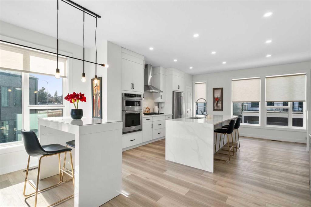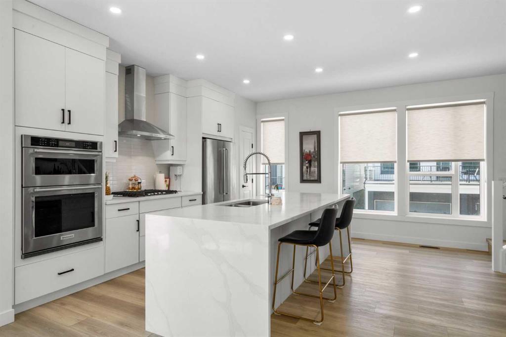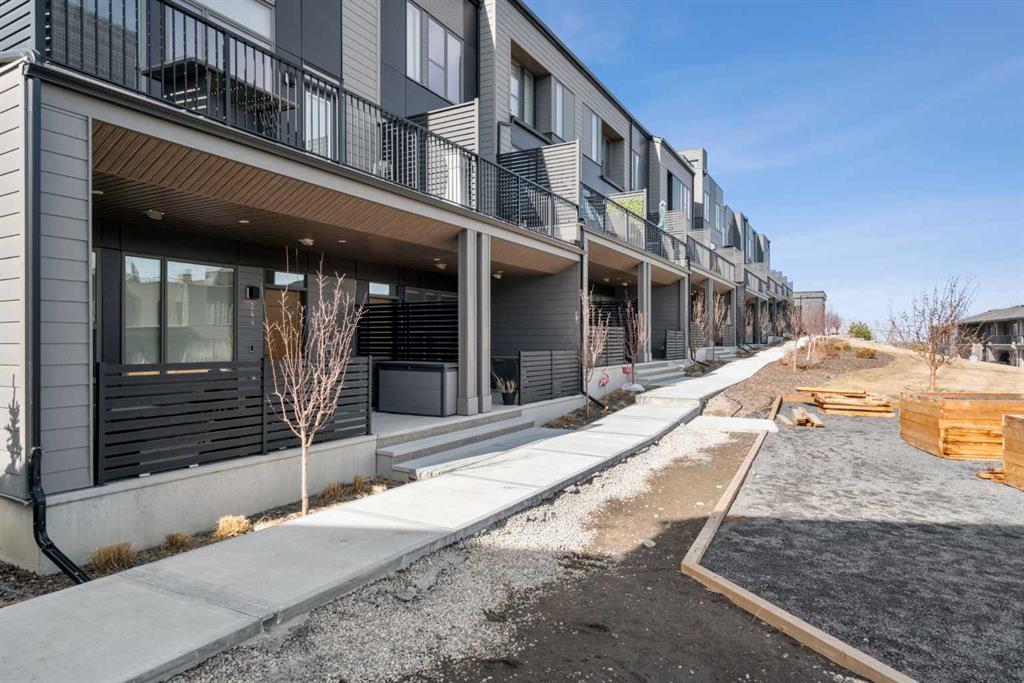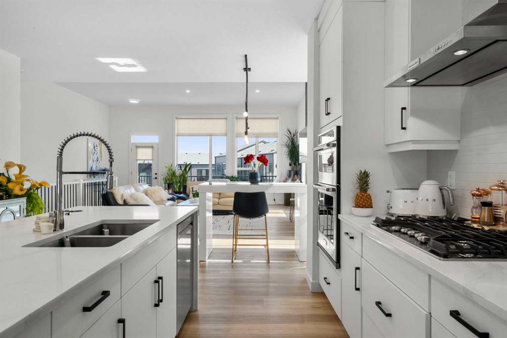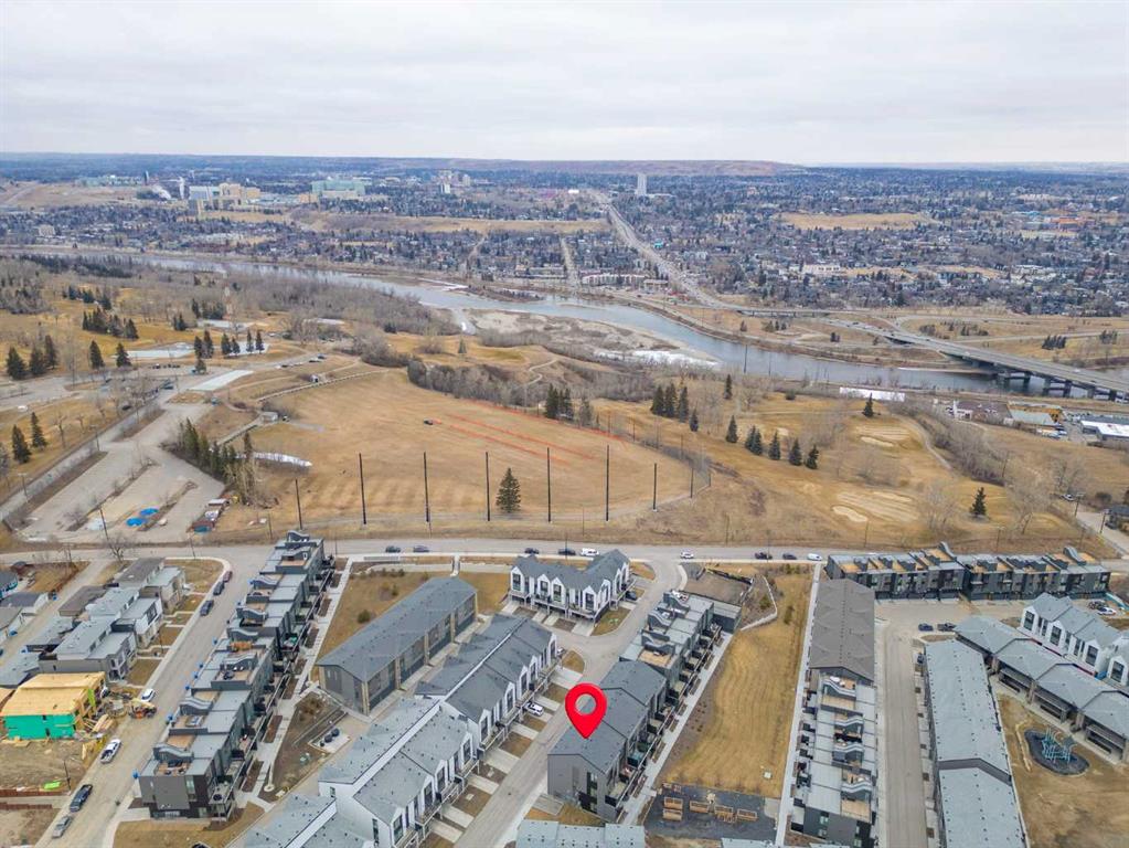 Perched atop one of the highest points in Crown Park, this striking Stanley plan walkout end unit townhome offers a rare combination of contemporary sophistication, exceptional functionality & sweeping downtown skyline views, making it a standout opportunity in Calgary’s premier urban communities. Boasting 2274 square feet of exquisitely upgraded living space & over $55,000 in thoughtful enhancements, this home is perfectly tailored for professionals, urban families & lifestyle driven buyers seeking a seamless blend of city convenience & serene natural surroundings. From the moment you arrive, a private east facing front patio greets you, overlooking a massive lush green space & beautifully maintained raised garden beds, instantly connecting you to the community’s outdoor lifestyle & sense of calm. Step inside to a versatile entry level flex space, perfect as a home office, gym, creative studio, or quiet retreat, with direct access to the double attached garage with a additional storage room. The main living level dazzles with soaring ceilings, oversized windows, an open concept layout drenched in natural light. At its heart, a chef inspired kitchen showcases a premium KitchenAid appliance package with gas cooktop, built-in oven, microwave & sleek range hood, complemented by dramatic quartz countertops with waterfall edges, a spacious island with seating & custom cabinetry complement these features, creating a stunning focal point for entertaining & everyday living. The dining area flows effortlessly into a generous living room anchored by a contemporary electric fireplace set against a full height artistic plaster feature wall, offering a perfect blend of warmth, style & sophistication. Step onto the full width east facing deck to enjoy serene green space & city skyline views, ideal for morning coffee, sunset cocktails, or quiet relaxation. Upstairs, the expansive primary suite features a walk-in closet, a luxurious private ensuite with upgraded tile surrounds & shower niches. two ample sized secondary bedrooms offer stunning downtown views, while a central bonus area provides flexible space for a reading nook, study, or children’s play area, complemented by convenient laundry. Every detail reflects thoughtful craftsmanship, from luxury vinyl plank flooring on the main level & tile in bathrooms, to custom blinds, additional pot lights, central air conditioning, sleek metal spindle railings, while EnerGuide certification ensures energy efficiency & lasting comfort. Situated in one of Calgary’s most vibrant & connected neighborhoods, residents enjoy immediate access to walking paths, parks, the Bow River, Douglas Fir & Quarry Trails, Shaganappi Golf Course, boutique fitness studios, dog friendly spaces plus some of the city’s finest dining & entertainment. With Bow Trail & the LRT nearby, commuting downtown or escaping to the mountains is effortless, blending urban excitement with outdoor adventure. This townhome is a statement of elevated modern living & design.