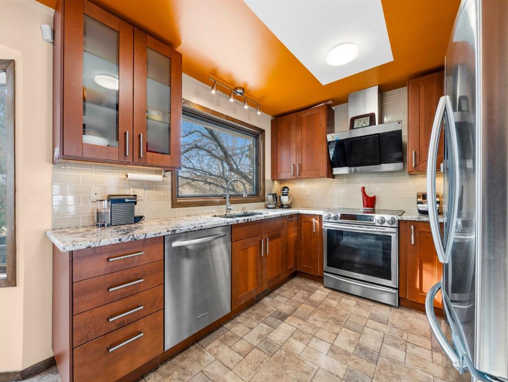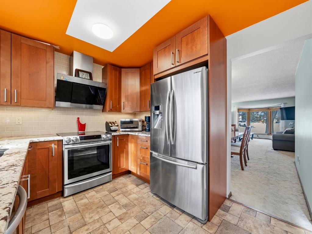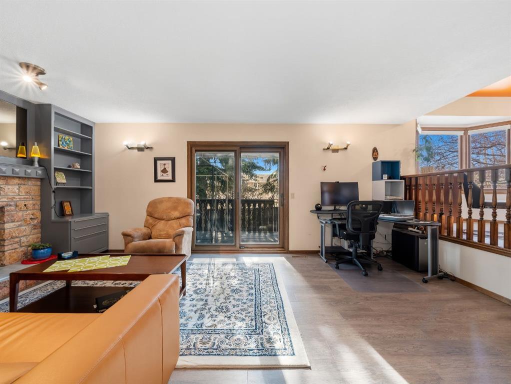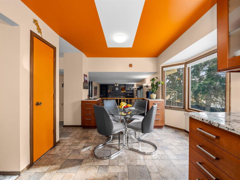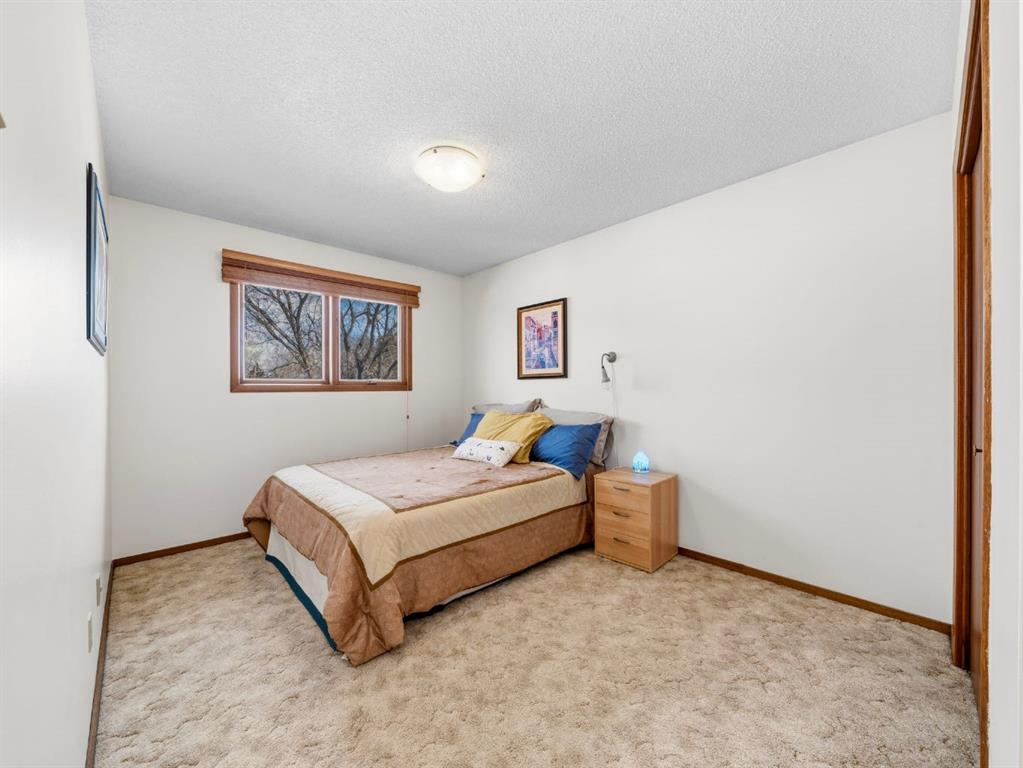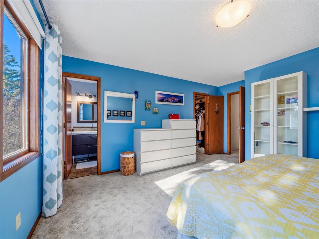 Perfectly situated across from a peaceful park, this Scenic Acres home offers the rare combination of a prime, quiet location and a thoughtfully designed floor plan. Sunlight pours through the bay windows into the main floor, highlighting the inviting living room and spacious formal dining area. The kitchen features updated cabinets, quality stainless steel appliances, granite countertops and a sunny breakfast nook with a bay window overlooking the private, treed backyard. In the adjoining family room, a cozy wood-burning fireplace creates an inviting atmosphere, while an upgraded sliding door leads directly to the outdoor space, creating a seamless indoor-outdoor flow. Solidly built and carefully updated over the years, this home combines original quality with essential modern comforts, including a newer furnace (2022), a replaced kitchen window and family room sliding door, while the remaining windows are original, high-quality Pella windows. The upper level is designed for comfort, featuring a spacious primary suite with a walk-in closet and an ensuite updated with a newer vanity, toilet and professional reglazing of the bathtub. Two additional bedrooms share a 4 piece bathroom, which has also been refreshed with a newer vanity and toilet. The fully finished basement offers a large recreation room and a generous storage area for all your seasonal needs. With quick access to Crowfoot Crossing, the YMCA, the LRT, Nose Hill Park, the Bow River Pathway, Crowchild Trail, Stoney Trail and schools, this home perfectly combines functional updates with an unbeatable location.