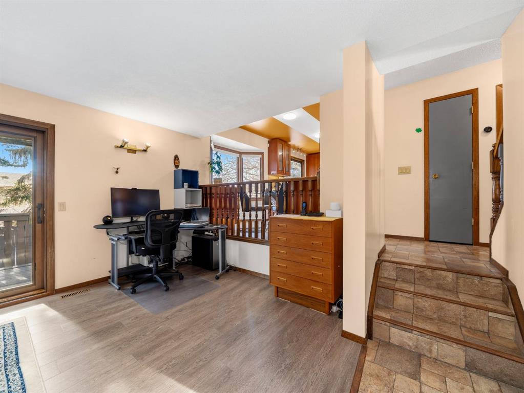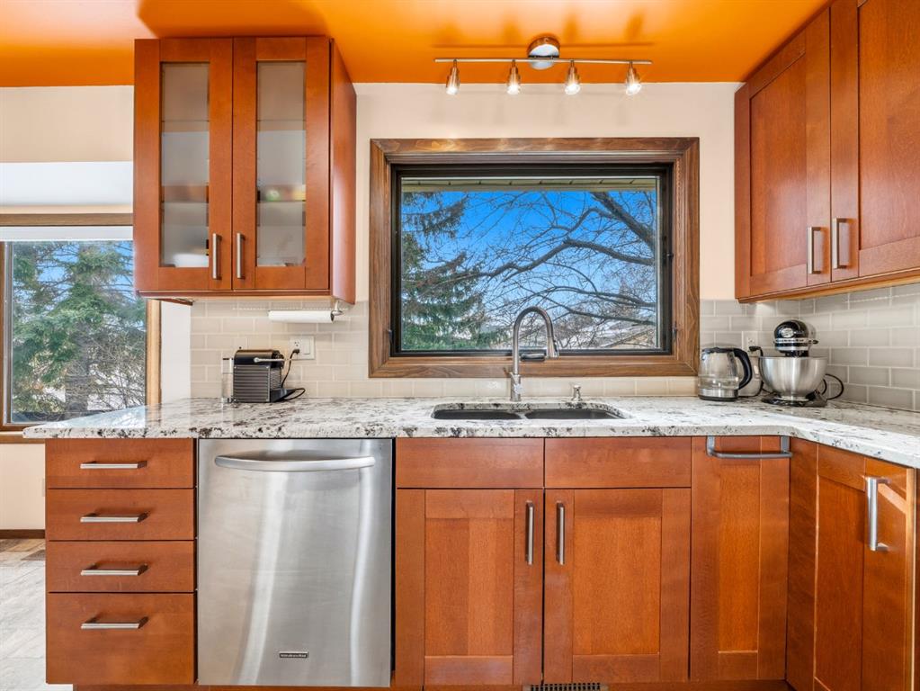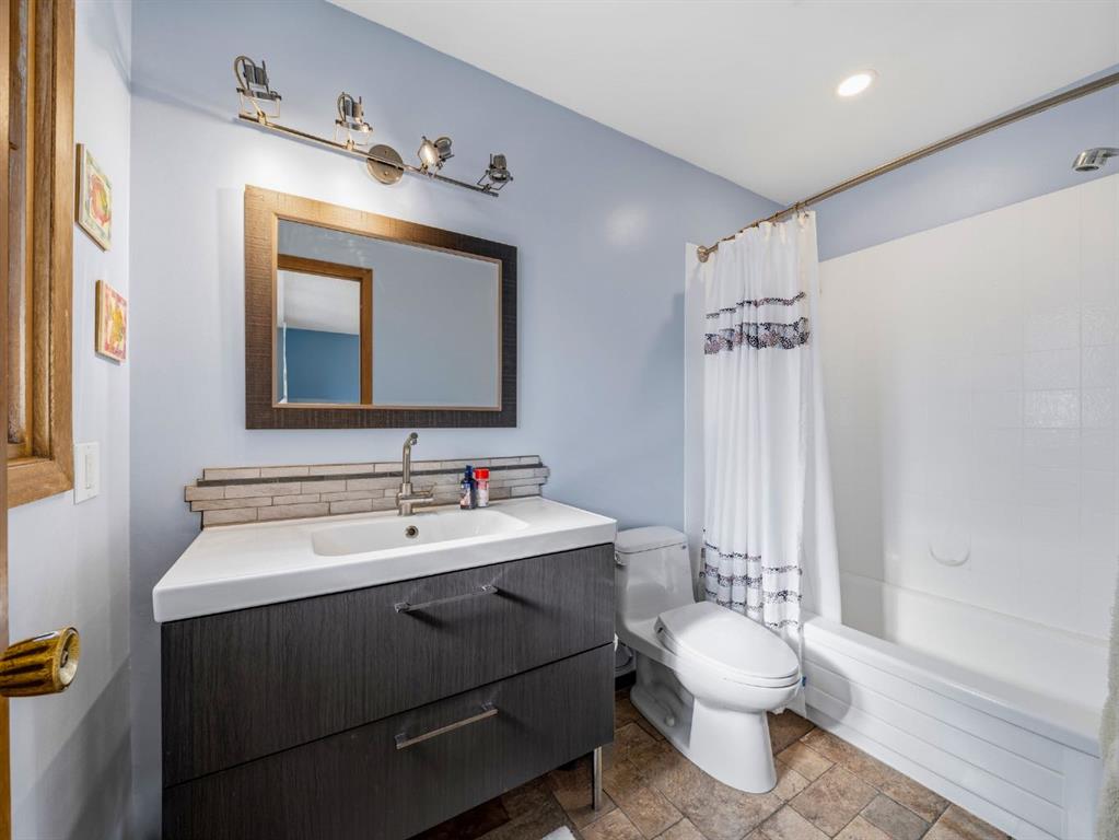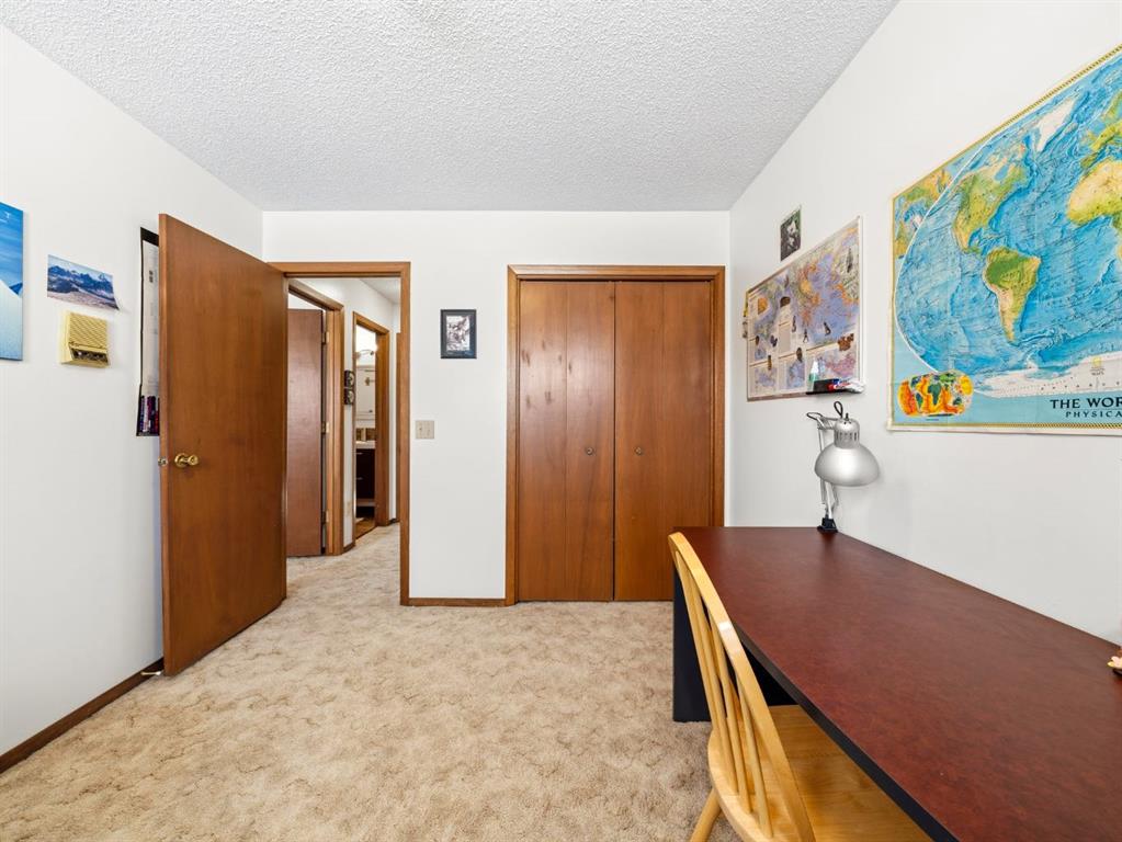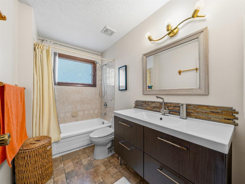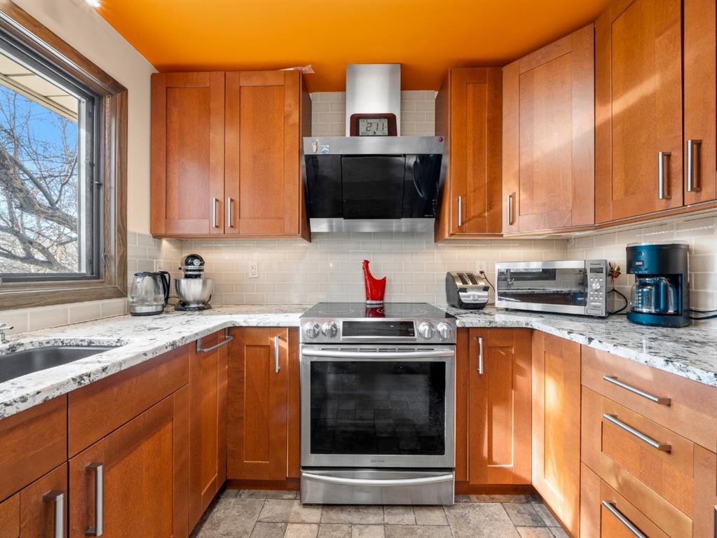 Perfectly situated across from a peaceful park, this Scenic Acres home offers the rare combination of a prime, quiet location and a thoughtfully designed floor plan. Sunlight pours through the bay windows into the main floor, highlighting the inviting living room and spacious formal dining area. The kitchen features updated cabinets, quality stainless steel appliances, granite countertops and a sunny breakfast nook with a bay window overlooking the private, treed backyard. In the adjoining family room, a cozy wood-burning fireplace creates an inviting atmosphere, while an upgraded sliding door leads directly to the outdoor space, creating a seamless indoor-outdoor flow. Solidly built and carefully updated over the years, this home combines original quality with essential modern comforts, including a newer furnace (2022), a replaced kitchen window and family room sliding door, while the remaining windows are original, high-quality Pella windows. The upper level is designed for comfort, featuring a spacious primary suite with a walk-in closet and an ensuite updated with a newer vanity, toilet and professional reglazing of the bathtub. Two additional bedrooms share a 4 piece bathroom, which has also been refreshed with a newer vanity and toilet. The fully finished basement offers a large recreation room and a generous storage area for all your seasonal needs. With quick access to Crowfoot Crossing, the YMCA, the LRT, Nose Hill Park, the Bow River Pathway, Crowchild Trail, Stoney Trail and schools, this home perfectly combines functional updates with an unbeatable location.