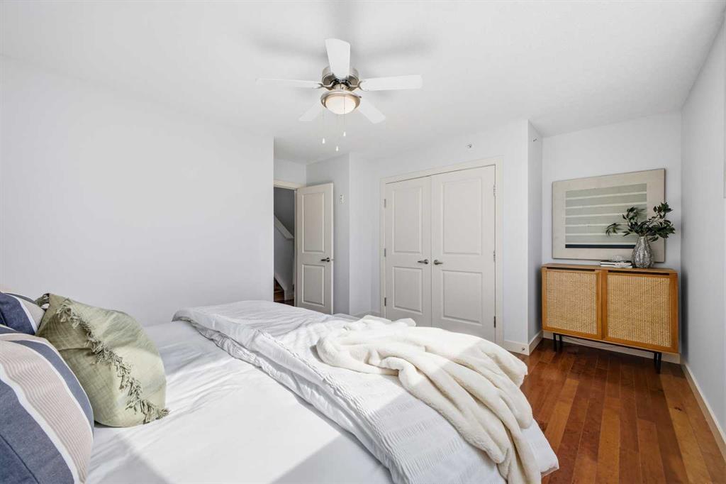 OPEN HOUSE SUNDAY, APRIL 5TH FROM 1-3 PM. Welcome to this stylish and thoughtfully designed split-level end-unit townhome facing the street. Offering over 1,200 square feet of living space. This modern home features a functional layout ideal for both everyday living and entertaining, with freshly painted walls and beautiful hardwood flooring throughout. The main floor welcomes you with a bright foyer leading into a spacious dining area adjacent to the kitchen, complete with ample cabinetry, generous counter space, and a convenient breakfast bar. A two-piece bathroom completes this level. On the second floor, enjoy a large and inviting living room with access to a private balcony—perfect for relaxing or hosting guests. The separation from the kitchen level creates a unique open-yet-private feel throughout the home. The third floor is dedicated to the primary retreat, featuring a generously sized bedroom, a full four-piece bathroom, and convenient in-suite laundry. The top floor adds exceptional versatility with a spacious office and walk-in closet, ideal for a home workspace, guest area, or flex room. One underground parking stall is also included with this unit. With its multi-level design and modern flow, this home offers the perfect balance of functionality and contemporary style—ideal for professionals, couples, or investors.