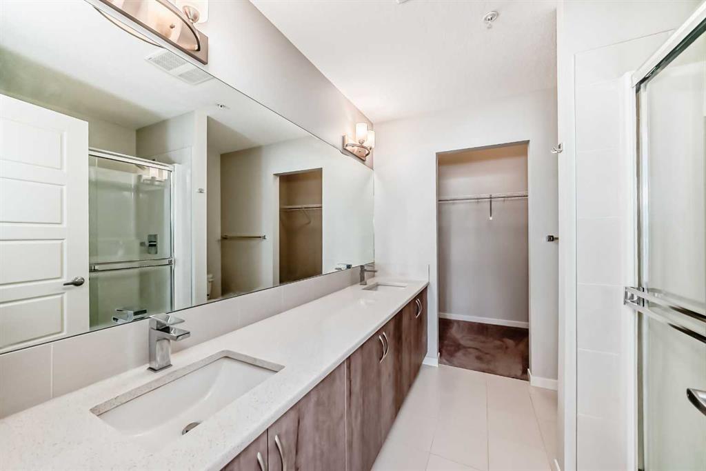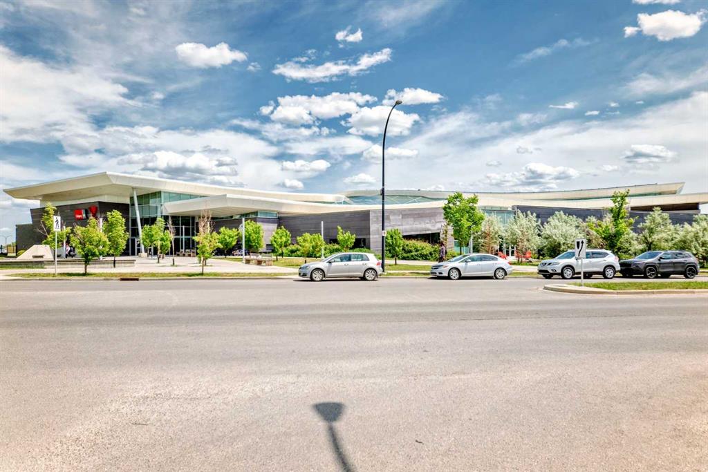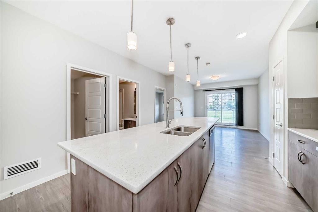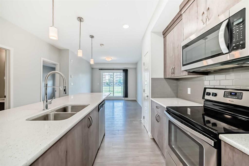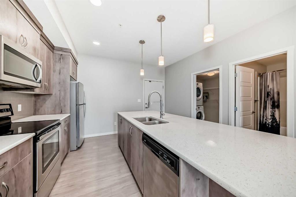 This sleek 2 bedroom, 2 bath condo is waiting for you. This unit's open floor plan is spacious and bright with 9 ft ceilings throughout. The kitchen features a large quartz island with plenty of seating space and cupboards. There is a large laundry/storage room which is plenty big enough to store your bikes and possibly camping equipment for your great weekend get aways. There is a spacious deck for relaxing after a busy day or having friends by for a bbq. From the deck there is a great view of the South Campus Hospital which is only a few minute walk. Also is this great community is the new YMCA which is just across the street from this awesome property. Also featuring in the neighbourhood is a high school, library, movie theatres, plenty of restaurants, shopping, parks and playgrounds. This building is pet friendly with approval of course. There is titled underground parking plus underground and outside visitor parking. Don't delay call your favourite Realtor today for your private showing.